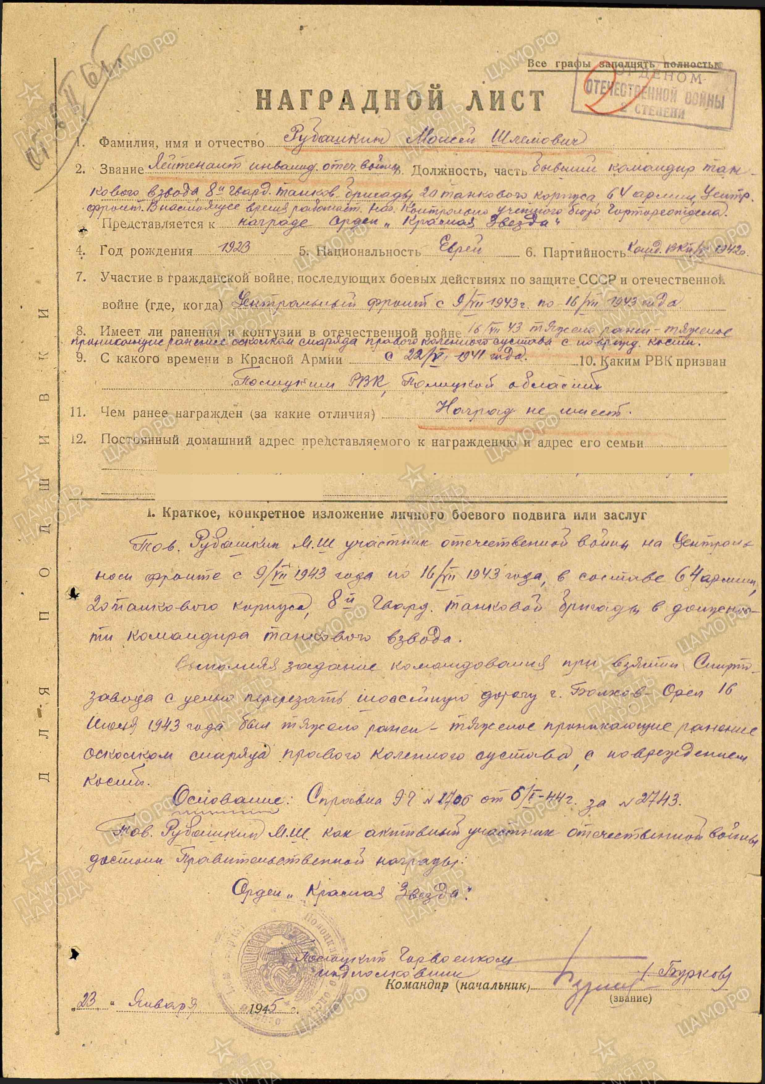 Гвардии старший лейтенант РУБАШКИН МОИСЕЙ ШЛЁМОВИЧ, 28.02.1923 года рождения, место рождения - СССР, Белорусская ССР, Витебская область, г. Полоцк, еврей. В РККА призван Полоцким РВК 22.06.1941 года и направлен, на учебу, в танковое училище. В Великой Отечественной войне с 9.07.1943 года (на Центральном, Брянском фронтах), в должности (последняя): Командира взвода 8 гвардейской танковой Краснознамённой ордена Суворова бригады, 20 танкового Звенигородского корпуса, 64 Армии, Центрального фронта. Ранения: 1. Тяжёлое: "Проникающее, осколочное ранение правого коленного сустава, с повреждение кости" (16.07.1943 года, в бою за дорогу БОЛХОВ - ОРЁЛ). Боевые награды; 1. Орден "ОТЕЧЕСТВЕННАЯ ВОЙНА" 2 СТЕПЕНИ (№ записи 49497095) с ЭЛЕКТРОННЫЙ БАНК ДОКУМЕНТОВ «ПОДВИГ НАРОДА В ВЕЛИКОЙ ОТЕЧЕСТВЕННОЙ ВОЙНЕ 1941-1945 ГГ.» http://podvignaroda.ru/?#tab=navHome ). Вернулся с Великой Отечественной войны, в 20 лет, инвалидом. Прожил достойную и скромную жизнь людей его поколения. Ушёл, из жизни, 8.05.1969 года. Вечная Слава и Память гвардии старшему лейтенанту РУБАШКИНУ МОИСЕЮ ШЛЁМОВИЧУ, участнику Сталинградской битвы и Величайшего танкового сражения, Великой Отечественной войны, на Курской дуге , под Прохоровкой!