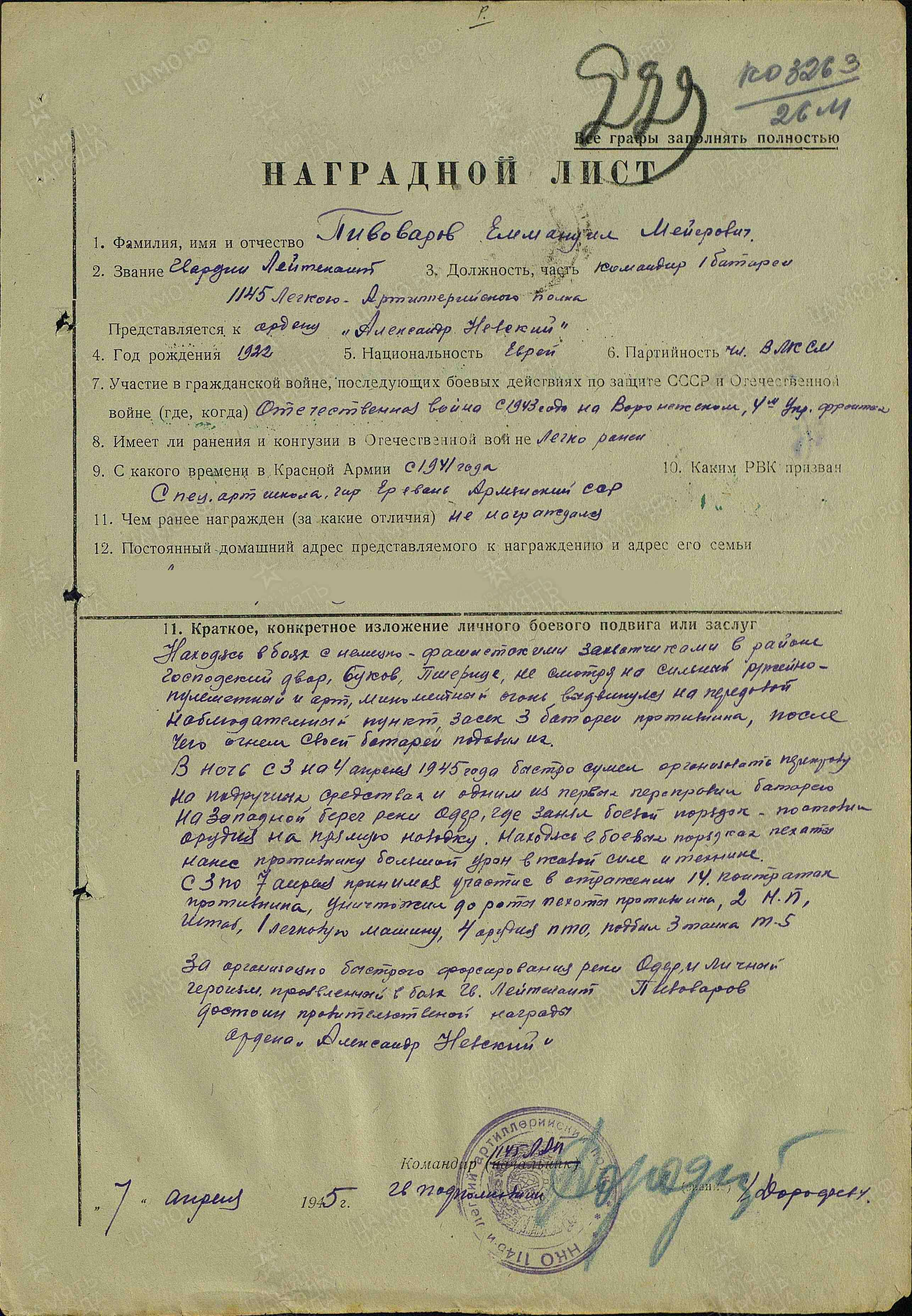 Гвардии лейтенант ПИВОВАРОВ ЭММАНУИЛ МЕЙЕРОВИЧ(МЕЕРОВИЧ), 1922 года рождения, место рождения - СССР, Азербайджанская ССР, г. Баку, еврей. В РККА призван Бакинским РВК, г. Баку, Азербайджанской ССР и направлен в специальную артиллерийскую школу, в г. Ереван, Армянской ССР. В Великой Отечественной войне с 1943 года (на Воронежском и 4 Украинском фронтах) в должностях: 1. Командир артиллерийской батареи 6 гвардейской стрелковой бригады, 10 гвардейского стрелкового корпуса, 56 и 18 Армий; 2. Заместитель командира взвода курсантов - командир батареи Сталинградского артиллерийского училища; 3. Командир 1 батареи, а затем начальник разведки дивизиона(последняя) 1145 лёгкого артиллерийского полка, 174 лёгкой артиллерийской бригады, 24 артиллерийской дивизии прорыва РГК, 4 Украинского фронта. Ранение: 1. Лёгкое. Боевые награды: 1. Медаль "ЗА ОБОРОНУ КАВКАЗА"(№ записи: 1536740453); 2. Орден "АЛЕКСАНДРА НЕВСКОГО"(Из НАГРАДНОГО ЛИСТА: "Находясь, в боях, с немецко-фашистскими захватчиками, в районе ГОСПОДСКИЙ ДВОР, БУКОВ, ПШЕРИЦЕ, несмотря на сильный ружейно-пулемётный и артиллерийско-миномётный огонь, выдвинулся на передовой НП, засёк 3 батареи противника, после чего, огнём своей батареи, подавил их. В ночь, с 3 на 4 апреля 1945 года, быстро сумел организовать переправу, на подручных средствах, и одним из первых переправил батарею на Западный берег р. ОДЕР, где занял боевой порядок - поставил орудия на прямую наводку. Находясь в боевых порядках пехоты, нанёс противнику большой урон в живой силе и технике С 3 по 7 апреля, принимал участие в отражении 14 контратак противника, уничтожил до роты пехоты противника, 2 НП, штаб, 1 легковую машину, 4 орудия ПТО, подбил 3 танка Т-5. За организацию быстрого форсирования реки ОДЕР, личный героизм, проявленный в боях, гвардии лейтенант ПИВОВАРОВ достоин Правительственной награды ордена "АЛЕКСАНДР НЕВСКИЙ". Командир 1145 лап Гвардии подполковник ДОРОФЕЕВ. 7 апреля 1945 г.";№ записи: 27164541) с сайта ЭЛЕКТРОННЫЙ БАНК ДОКУМЕНТОВ «ПОДВИГ НАРОДА В ВЕЛИКОЙ ОТЕЧЕСТВЕННОЙ ВОЙНЕ 1941-1945 ГГ.» http://www.podvignaroda.mil.ru/?#tab=navHome " С Великой Отечественной войны не вернулся - 24.04.1945 года убит, в бою. Извещение: Бакинский ГВК, Азербайджанская ССР, г. Баку, ул. Завокзальная, дом 4, мать - Пивоварова Мария Исаевна. Захоронен: Чешская республика, Северо - Моравская область( ныне Моравско-Силезский край), район Опава, г. Опава (бывший нем. Троппау), кладбище, братская могила. Вечная Слава и Память!