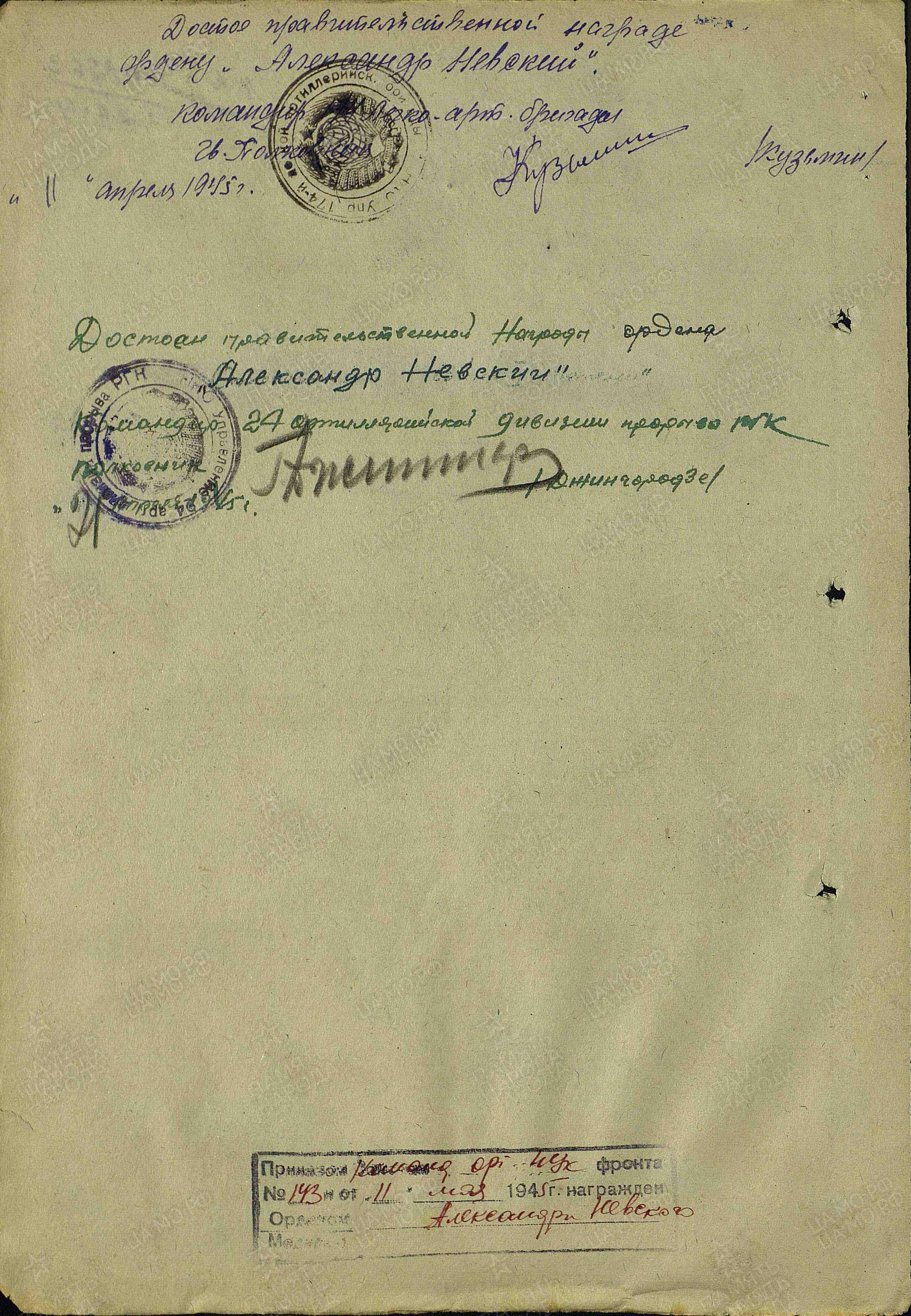 1. НАГРАДНОЙ ЛИСТ на орден "АЛЕКСАНДРА НЕВСКОГО" с сайта ЭЛЕКТРОННЫЙ БАНК ДОКУМЕНТОВ «ПОДВИГ НАРОДА В ВЕЛИКОЙ ОТЕЧЕСТВЕННОЙ ВОЙНЕ 1941-1945 ГГ.»( http://www.podvignaroda.mil.ru/?#tab=navHome ").