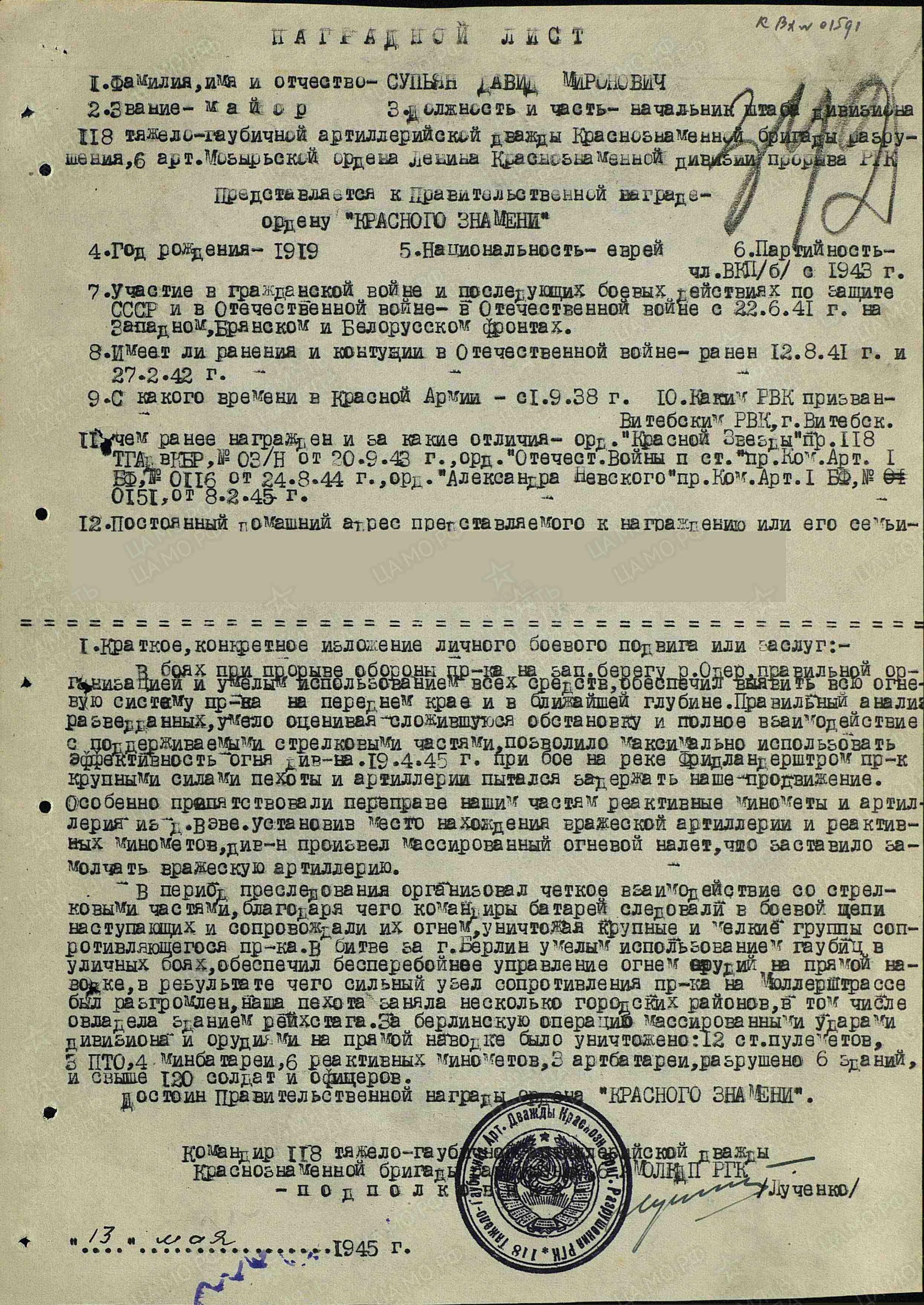 «В боях при прорыве обороны противника на зап. берегу р.Одер правильной организацией и умелым использованием всех средств обеспечил выявление всей огневой системы противника на переднем крае и в ближайшей глубине. Правильный анализ разведданных, умелая оценка сложившейся обстановки и полное взаимодействие с поддерживаемыми стрелковыми частями позволили максимально использовать активность огня дивизиона. 19.4.45г. при бое на реке Фридландерштром противник крупными силами пехоты и артиллерии пытался задержать наше продвижение.