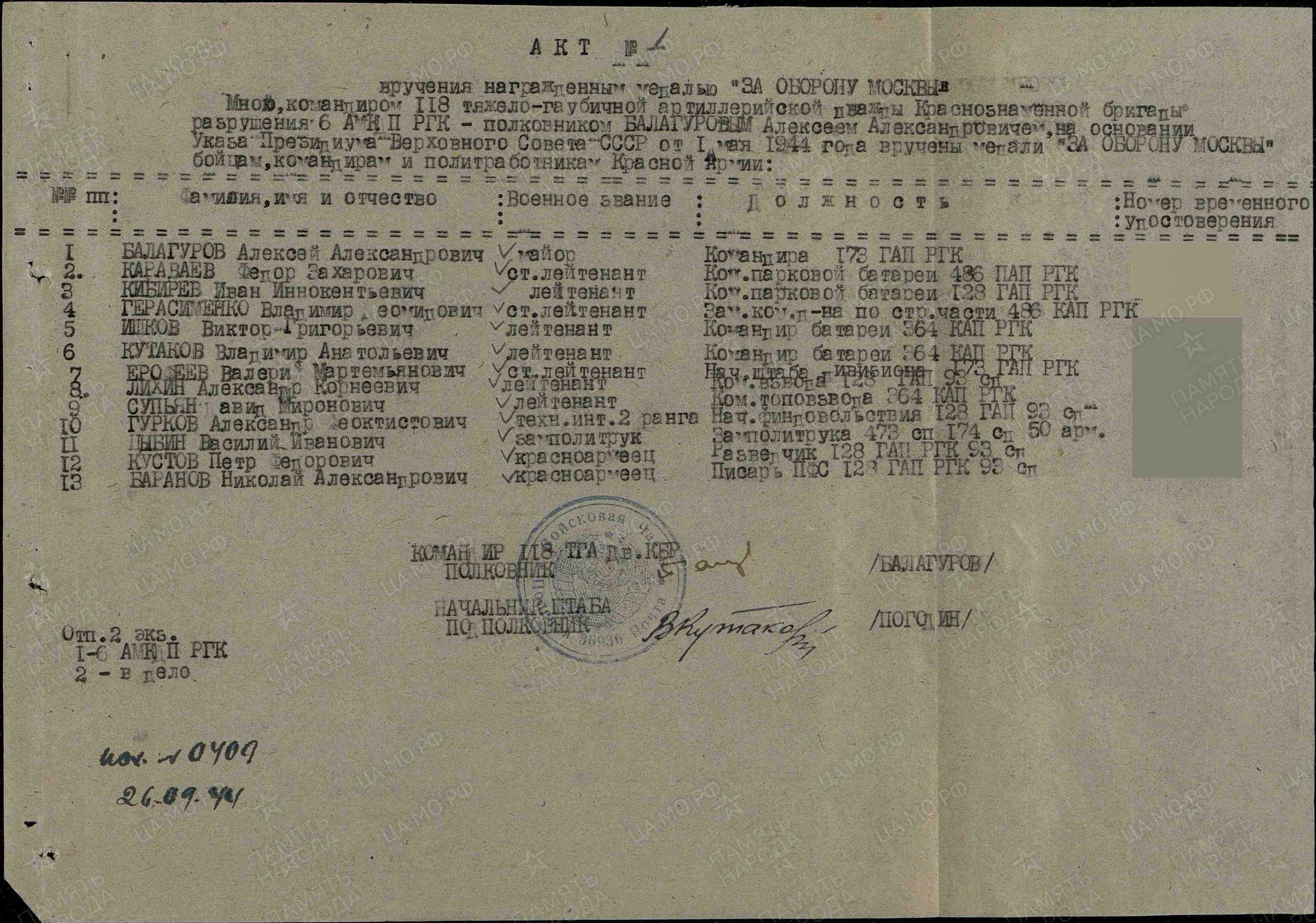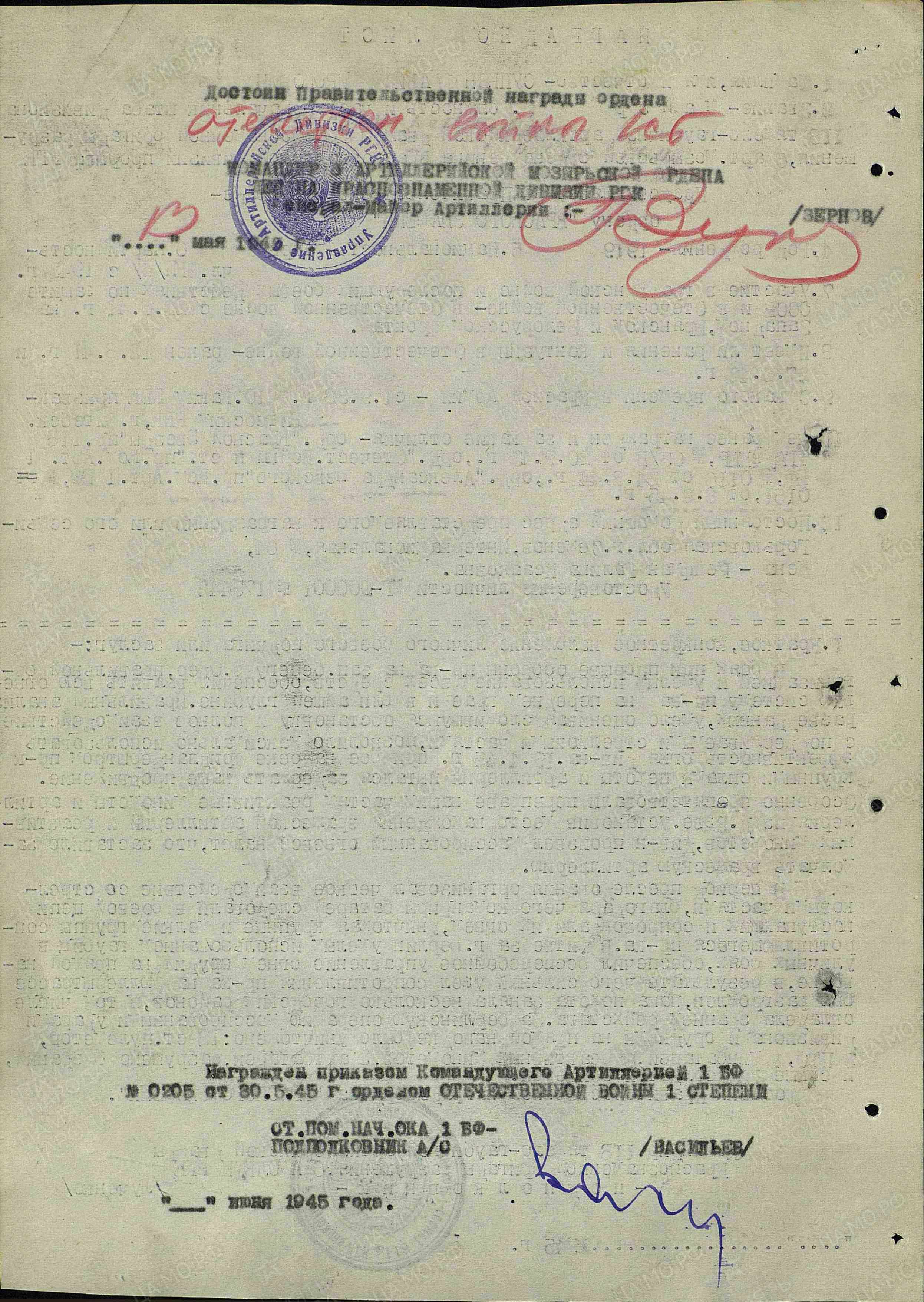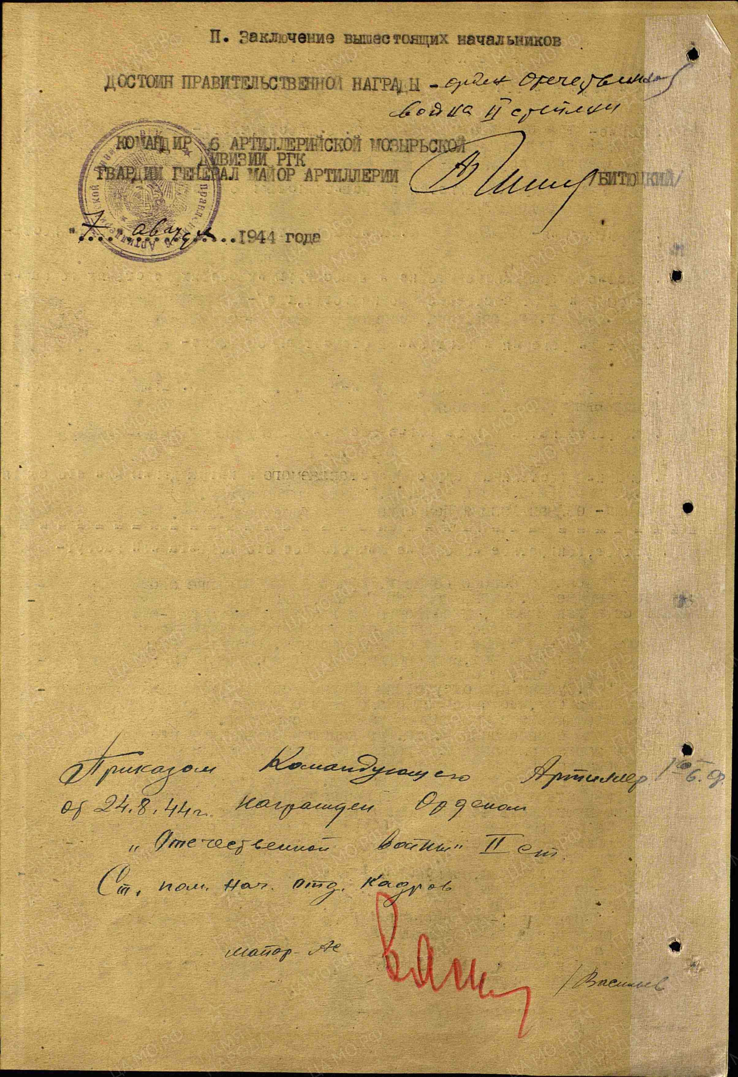 За умелое руководство огнем дивизиона в бою, за личную отвагу и мужество, проявленные в боях с немецкими захватчиками, достоин правительственной награды орденом Отечественной войны первой степени.