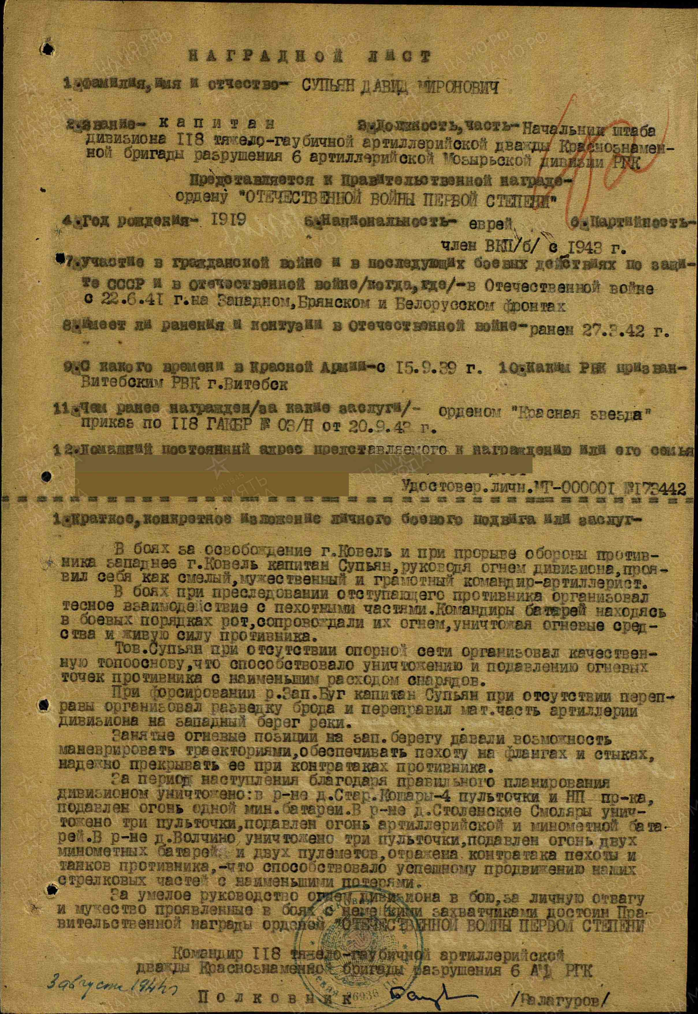 «В боях за освобождение г.Ковель и при прорыве обороны противника западнее г.Ковель капитан Супьян, руководя огнем дивизиона, проявил себя как смелый, мужественный и грамотный командир-артиллерист.