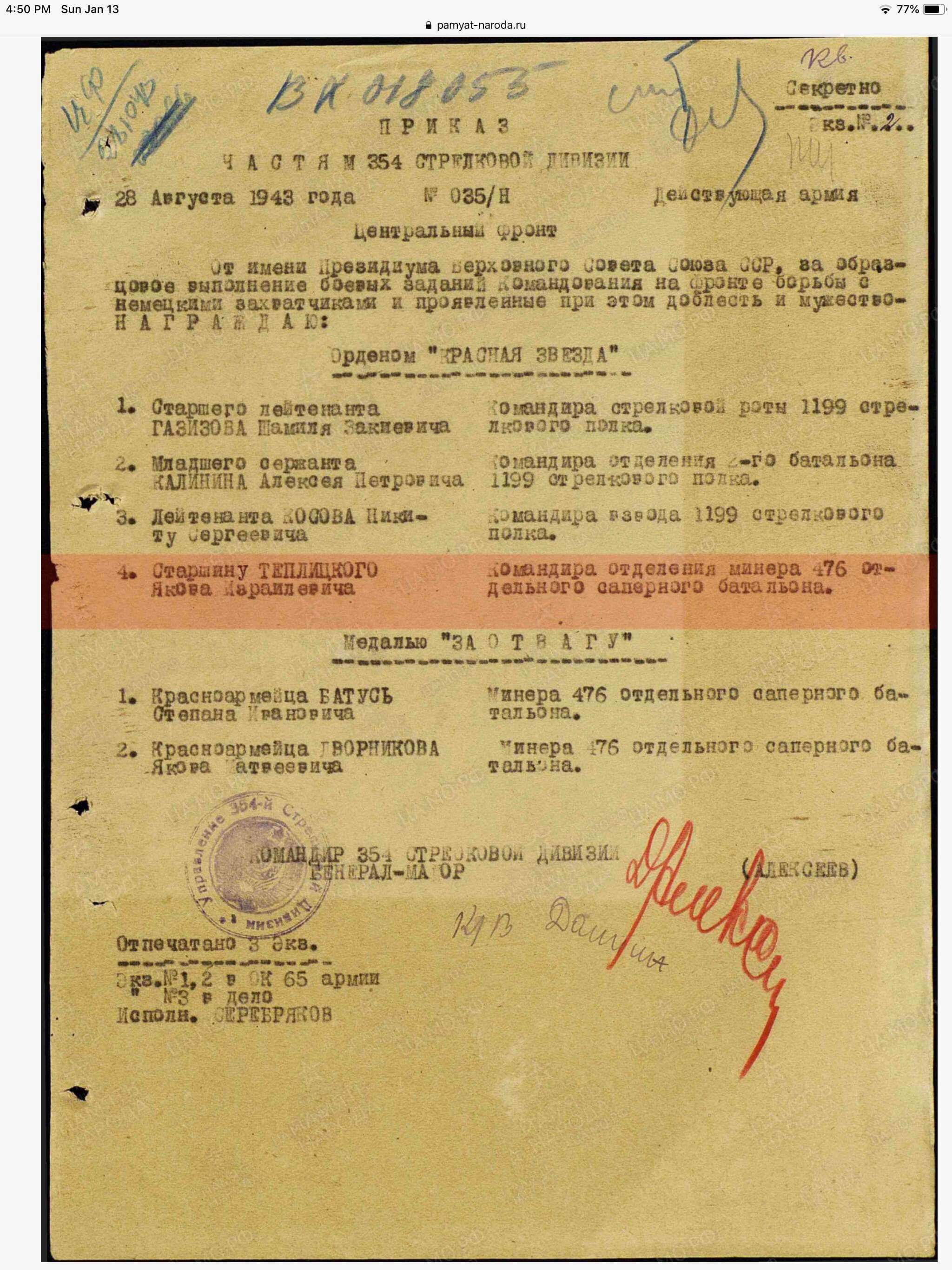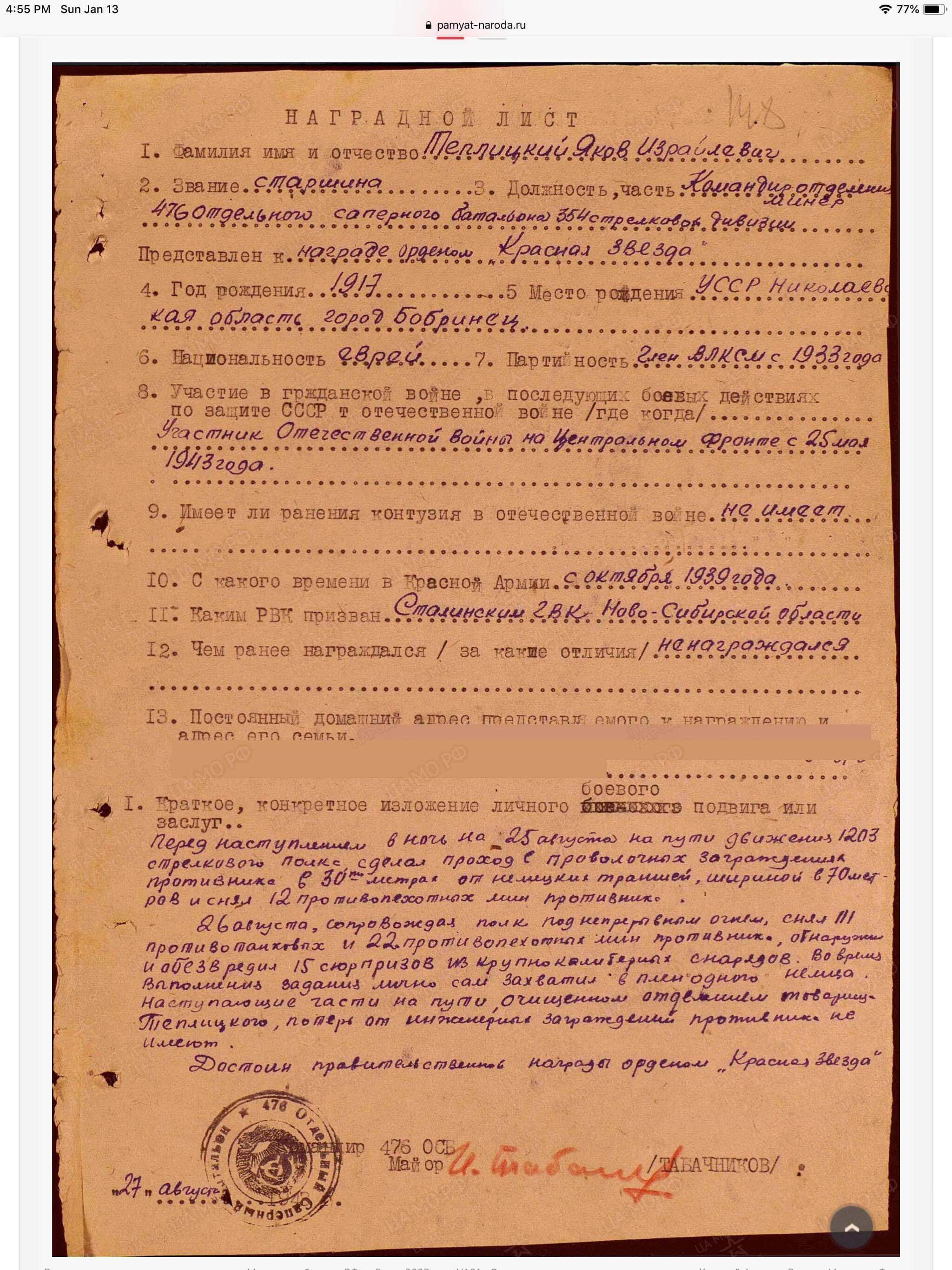 ТЕПЛИЦКИЙ ЯКОВ ИЗРАИЛЬЕВИЧ, старшина, командир отделения 476 Отдельного Сапёрного Батальона 354 Стрелковой дивизии, представлен к награде - Орденом «Красная Звезда»