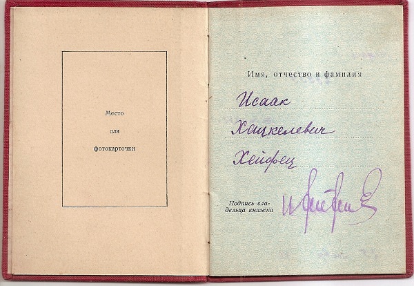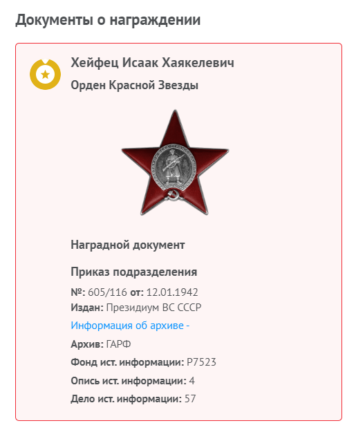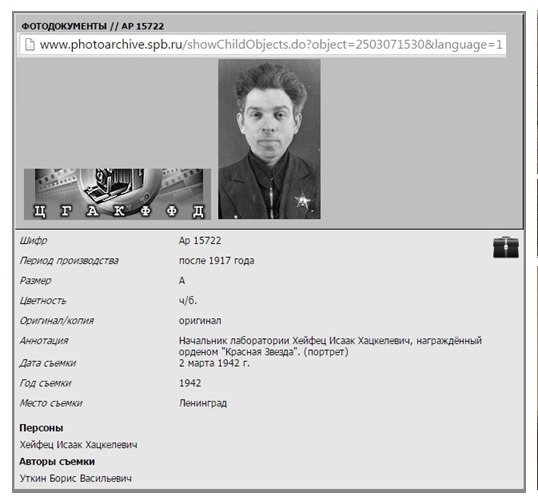 Прилагаются фотографии: 1. Хейфец Исаак Хацкелевич в лаборатории с разработанной моделью установки по переработке отходов. 2. Портрет начальника лаборатории Хейфеца Исаака Хацкелевича, награжденного орденом Красной Звезды на сайте www.photoarchive.spb.ru, дата съемки 2 марта 1942 года. 3. Фотографии Хейфеца И.Х. с наградами. 4. Семейная довоенная фотография семьи Хейфец. 5. Групповая фотография: Хейфец Исаак Хацкелевич, Хейфец Ида Яковлевна (жена), Хейфец Иосеф Хацкелевич (брат). 6. Наградные документы.