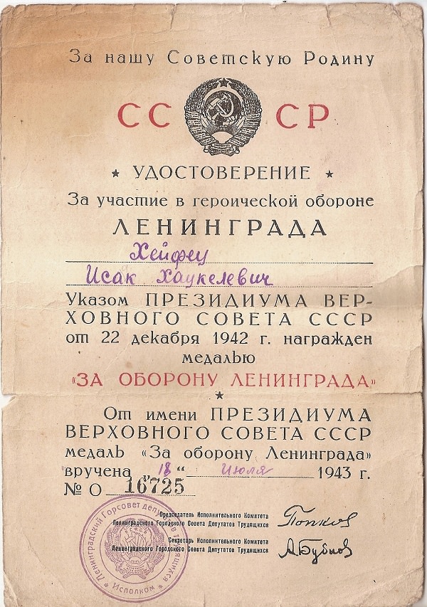 Хейфец Исаак (Иче) Хацкелевич, 1906 г.р., инженер-химик, работал на пороховом заводе в пос. Морозовка, Всеволожский район, Ленинградской области. Блокадник, участник обороны г. Ленинграда, награжден орденом Красной Звезды (12.01.1942), медаль «За оборону Ленинграда», медалью «За доблестный труд в Великой Отечественной войне 1941–1945 гг.».