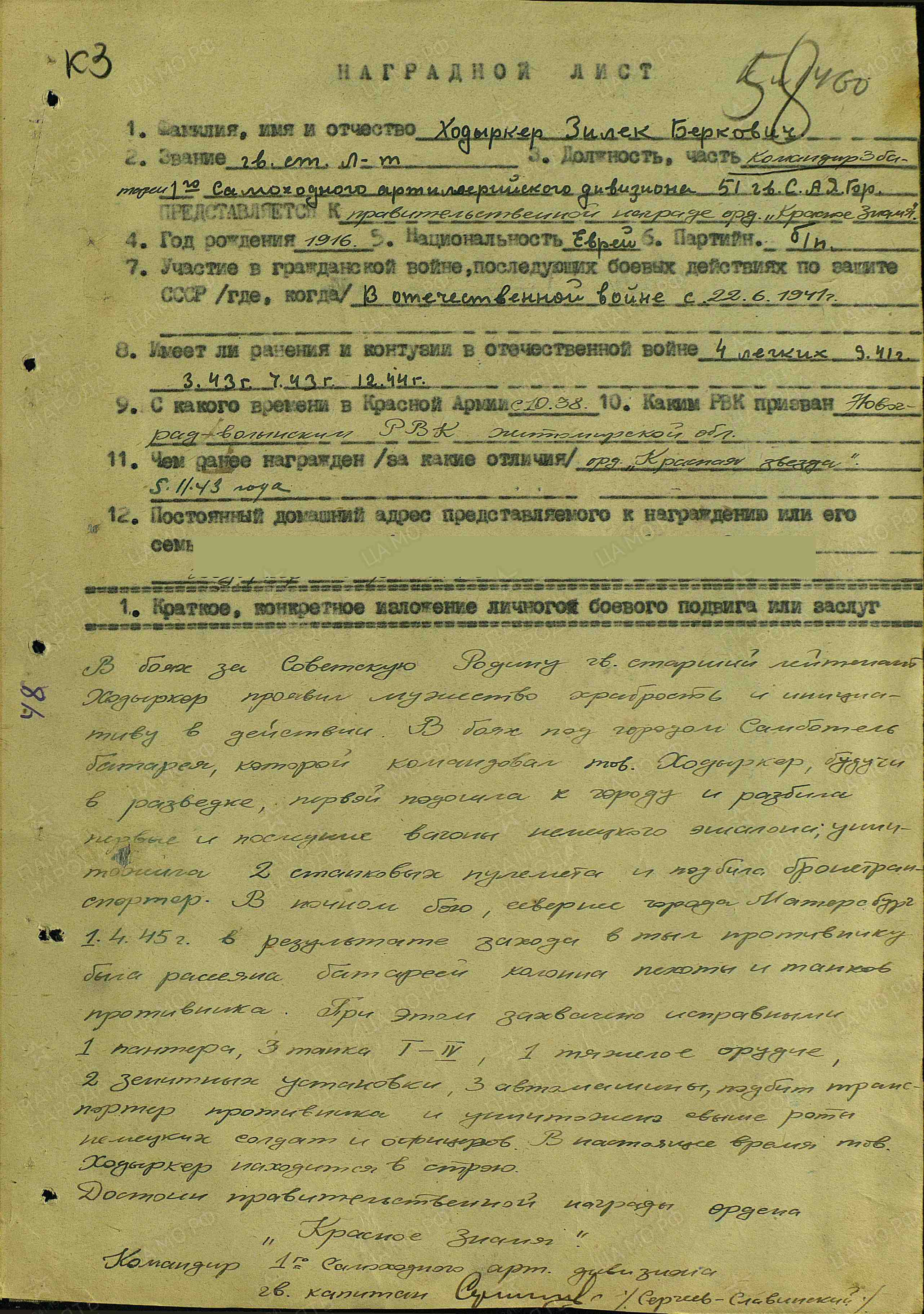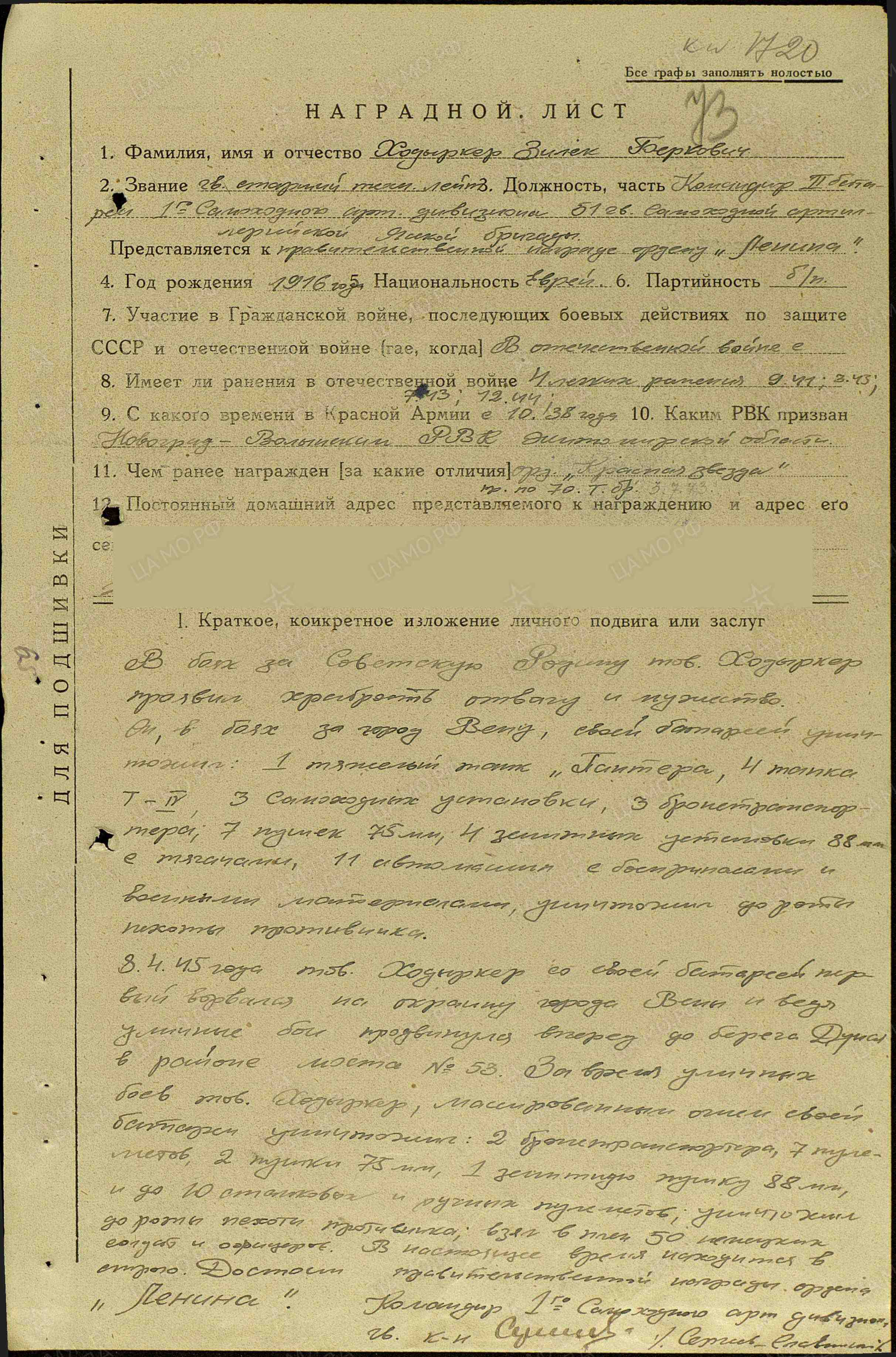 Гвардии  старший лейтенант ХОДЫРКЕР ЗИЛЕК БЕРКОВИЧ, 05.05.1916 года рождения, место рождения - Российская Империя, Волынская губерния, Житомирский уезд, Яруньская волость, местечко Ярунь (по административному делению СССР: Украинская ССР, Житомирская область, Новоград - Волынский район, местечко Ярунь), еврей. В РККА призван Новоград - Волынским РВК, Новоград - Волынского района, Житомирской области, Украинской ССР, 01.10.1938 года. В Великой Отечественной войне с 22.06.1941 года (на 2 и 3 Украинских фронтах) в должности (последняя): Командира 2 батареи 1 самоходно - артиллерийского дивизиона, 51 гвардейской самоходно - артиллерийской Ясской ордена Кутузова бригады, 6 гвардейской танковой армии, 1 Украинского фронта. Ранения: Лёгкие (09.1941 г.; 03.1943 г.; 07.1943 г.; 12.1944 г.). Боевые награды: 1. Ордена: "КРАСНОГО ЗНАМЕНИ" (2), "ОТЕЧЕСТВЕННОЙ ВОЙНЫ" 1 СТЕПЕНИ, "КРАСНОЙ ЗВЕЗДЫ"; 2. Медали: "ЗА ПОБЕДУ НАД ГЕРМАНИЕЙ В ВЕЛИКОЙ ОТЕЧЕСТВЕННОЙ ВОЙНЕ 1941 - 1945 ГГ." с ЭЛЕКТРОННЫЙ  ДОКУМЕНТОВ «ПОДВИГ НАРОДА В ВЕЛИКОЙ ОТЕЧЕСТВЕННОЙ 1941-1945 ГГ.» .http://podvignaroda.ru/?#tab=navHome. Вернулся С Великой Отечественной войны. Послевоенная судьба: неизвестна. Умер  22.04.2001 года. Вечная Слава и Память!