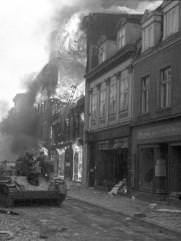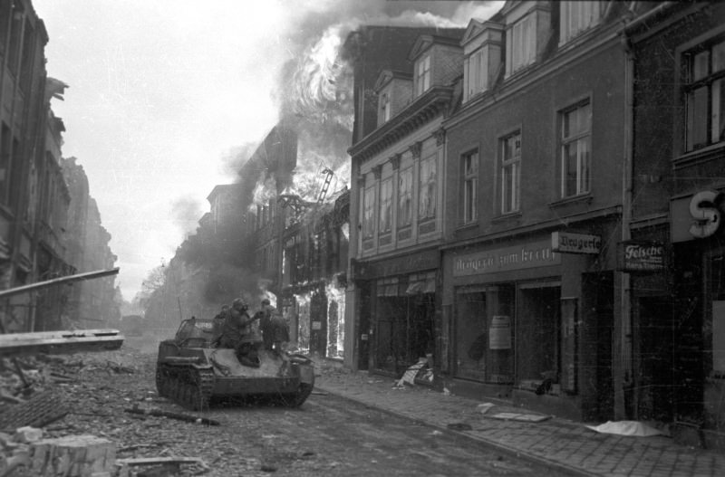 Авторское описание фото: " Советская САУ СУ-76М прокладывает дорогу бойцам штурмовых групп на улице горящего Данцига (ныне — Гданьск, Польша.);