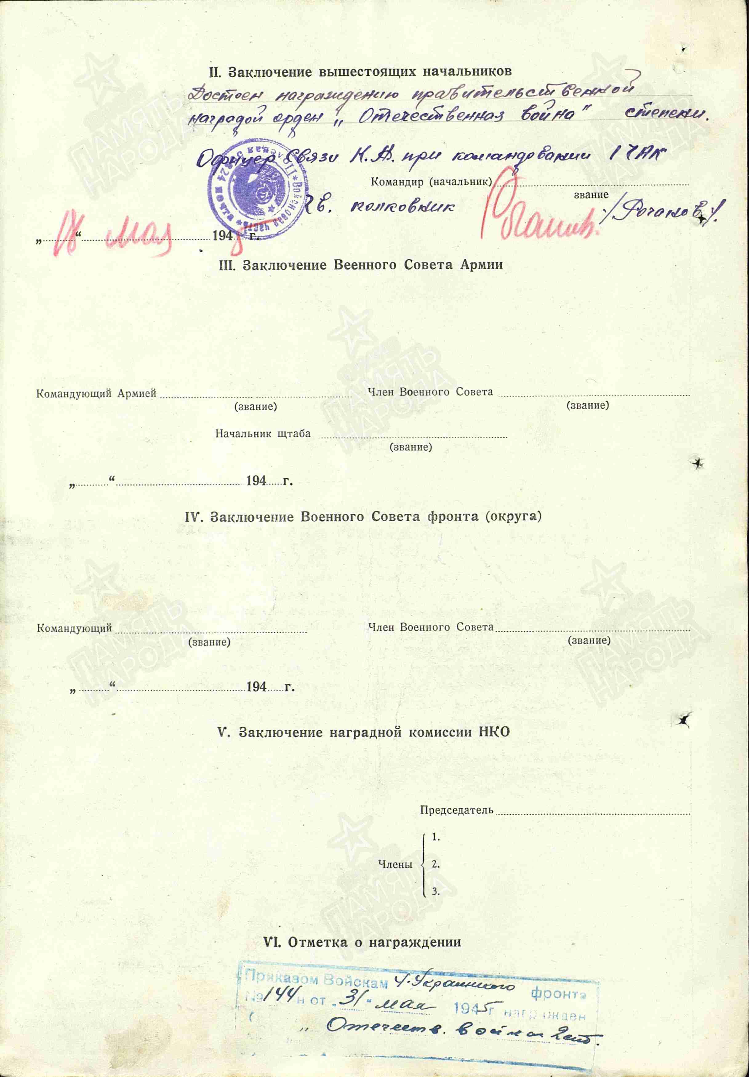 | 31.05.1945 | Орден Отечественной войны II степени |
