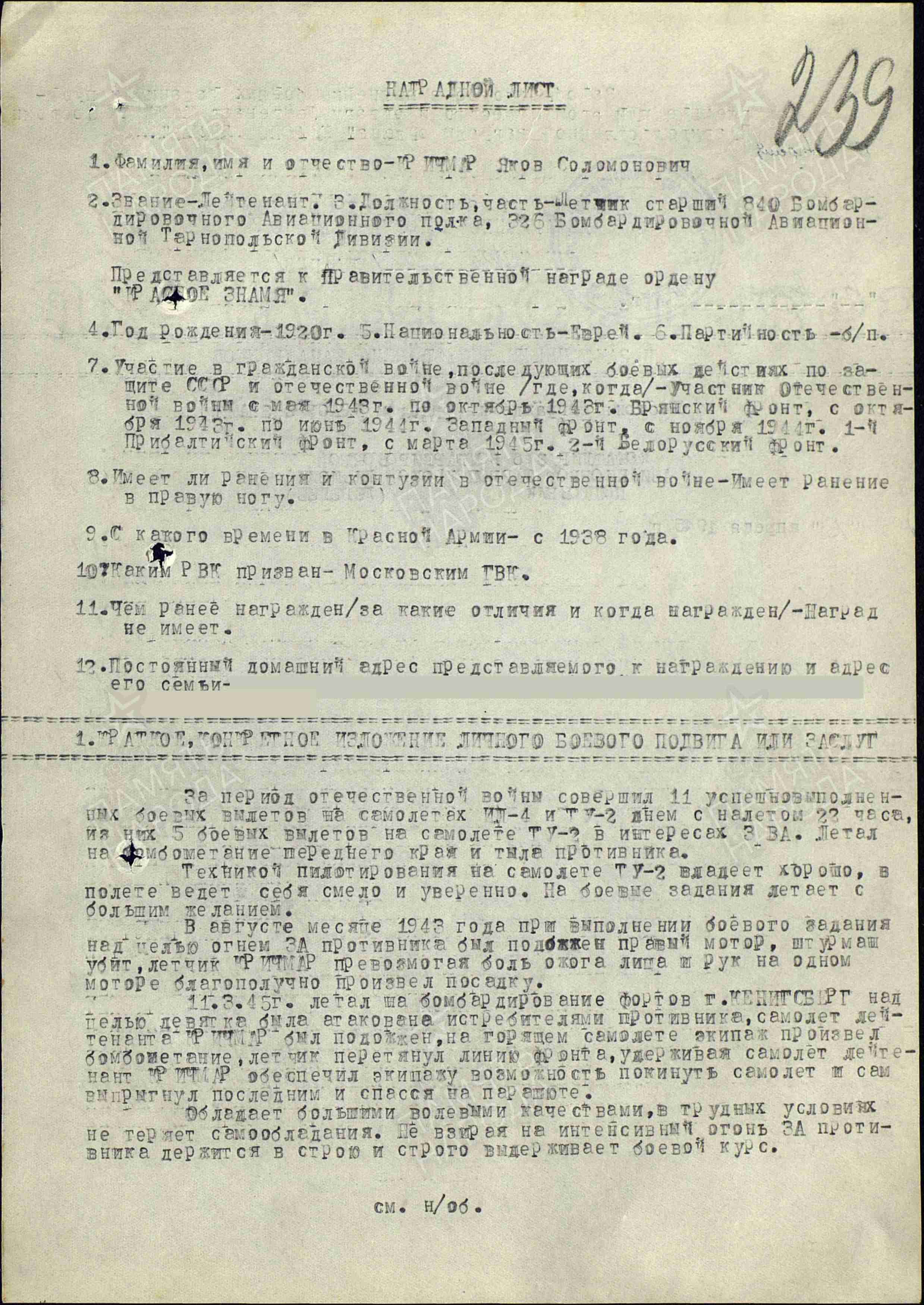 Лётчик старший 840 бомбардировочного авиационного полка, 326 бомбардировочной авиационной Тарнопольской ордена Кутузова дивизии, 6 бомбардировочного авиационного Донбасского корпуса, 16 воздушной Краснознамённой армии, 1 Белорусского фронта (05.1945).