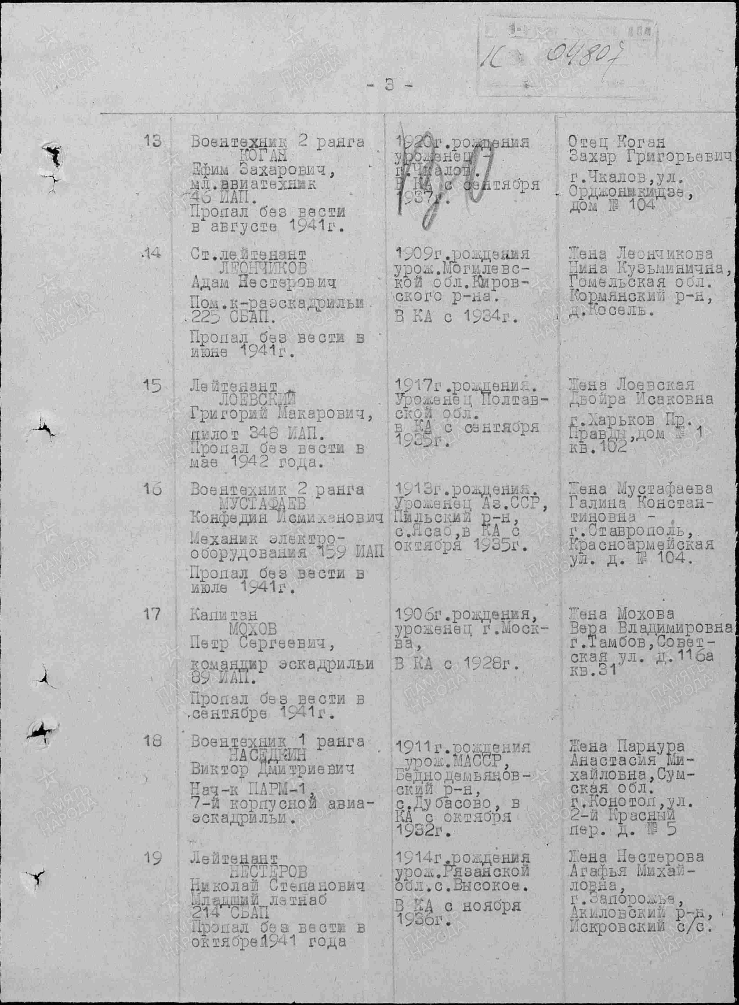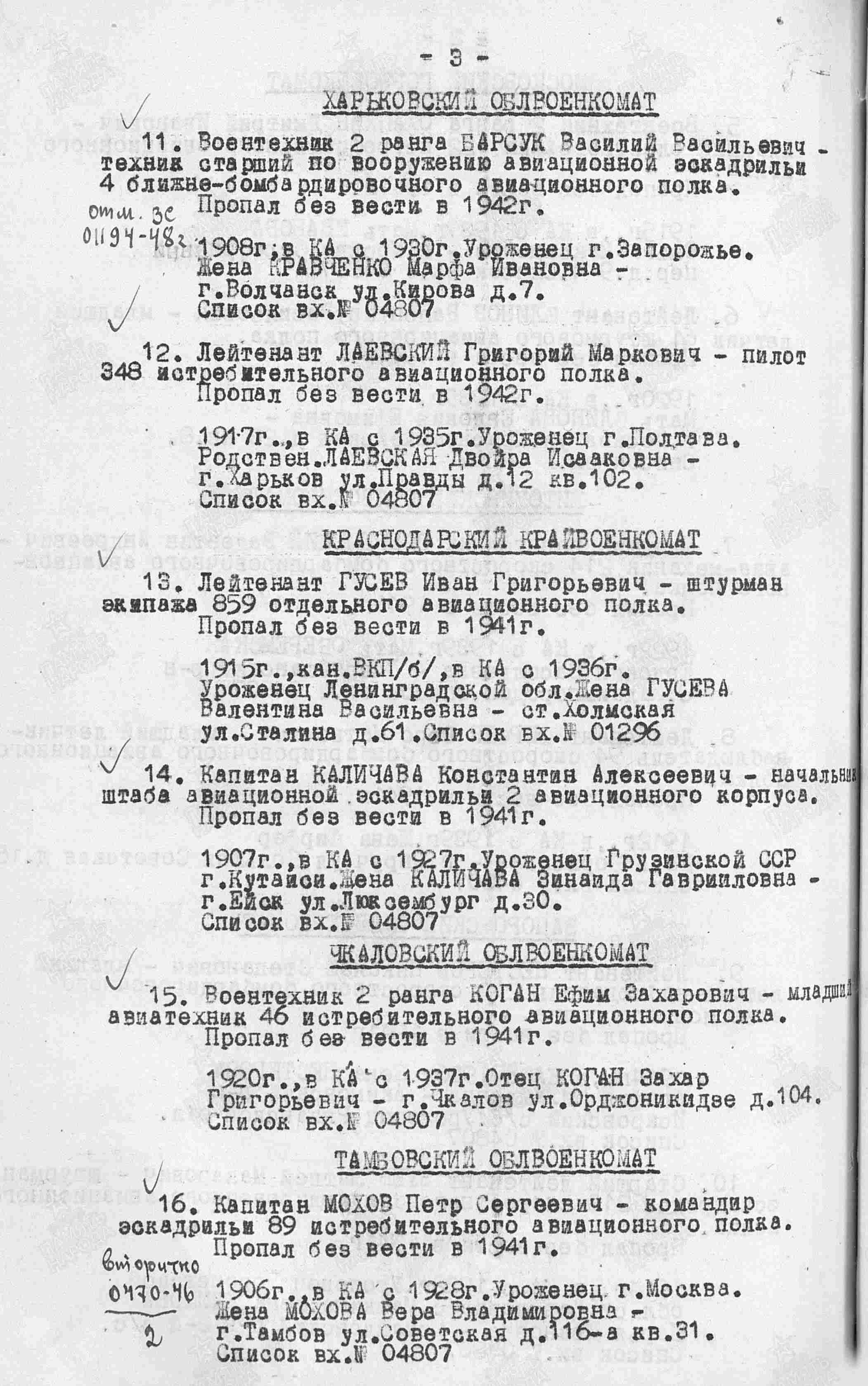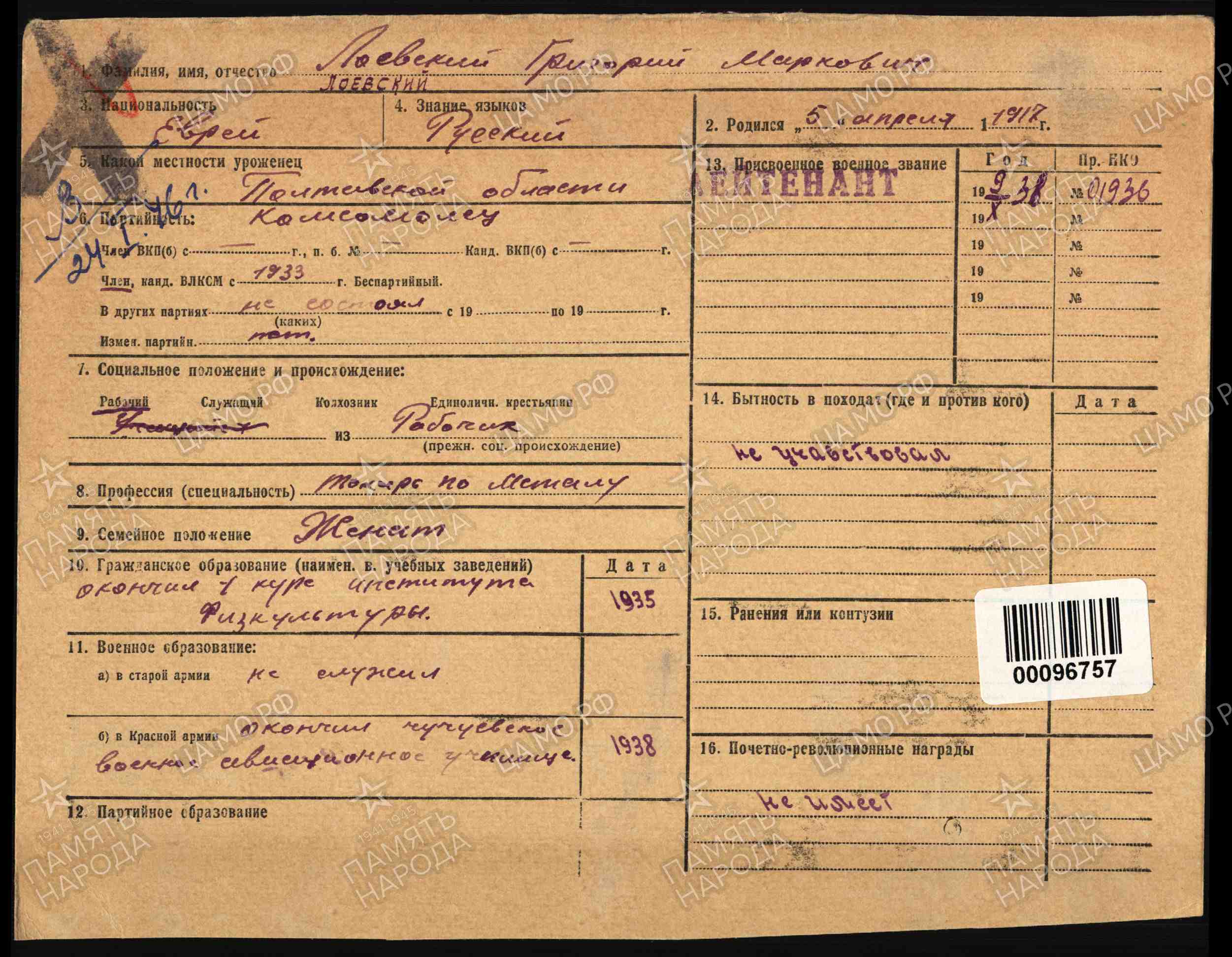 Лейтенант ЛАЕВСКИЙ (ЛОЕВСКИЙ) ГРИГОРИЙ МАРКОВИЧ, 5.04.1917 года рождения, место рождения - Украинская ССР, Полтавская область, г. Полтава, еврей. Образование: 1. Средняя школа; 2. 4 курса института физкультуры. В РККА призван в 1935 году и направлен на учёбу в Чугуевское военное авиационное училище. В Великой Отечественной войне с 22.06.1941 года, в должности (последняя): Лётчика 348 истребительного авиационного полка ПВО, 104 истребительной авиационной дивизии ПВО, Архангельского дивизионного района ПВО, Войск ПВО территории страны. Не вернулся с боевого задания, 05.1942 года, пропал без вести. Извещение: Харьковский ОВК, Украинская ССР, Харьковская область, г. Харьков, ул. Правды, дом 12, квартира №102, родственники: жена - Лаевская (Лоевская) Двойра Исааковна.