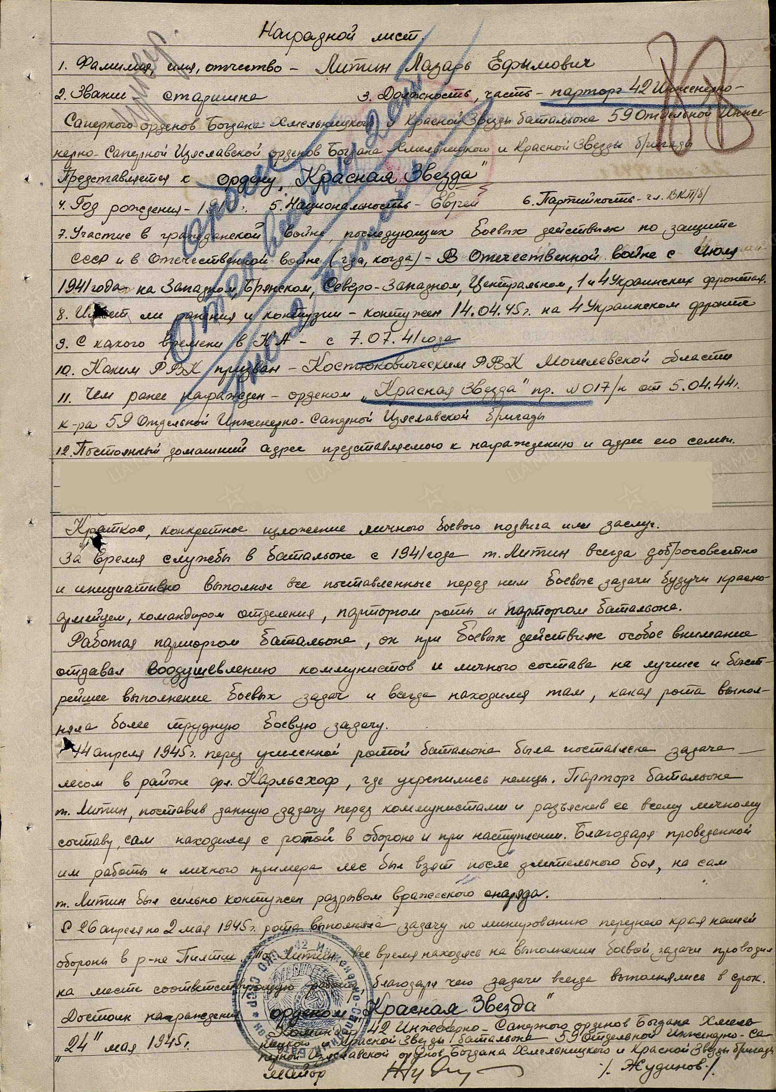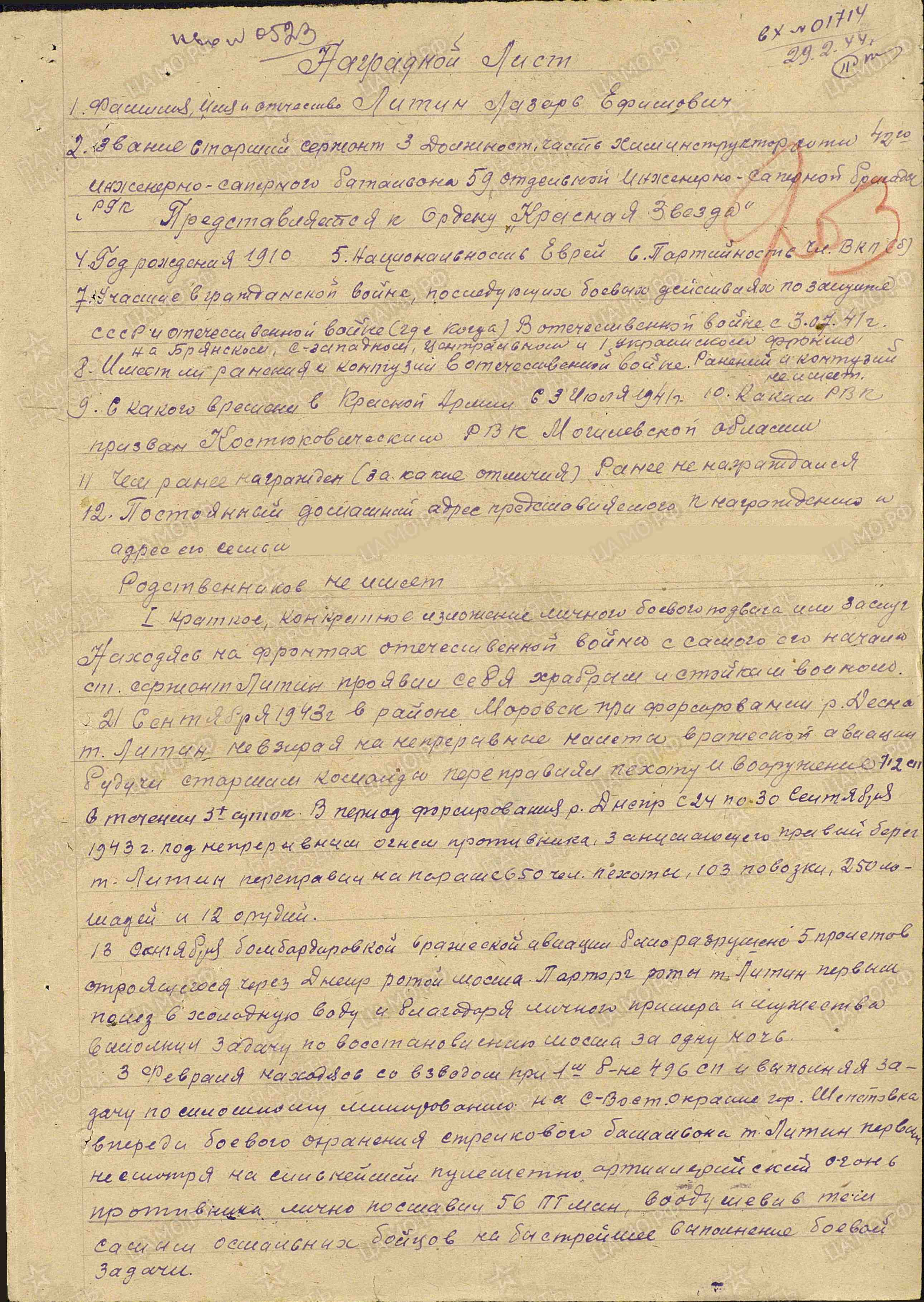Старшина ЛИТИН ЛАЗАРЬ ЕФИМОВИЧ, 1910 года рождения, место рождения - Российская Империя, Могилёвская губерния, Чаусский уезд, Гладковская волость, местечко Сухари, еврей. После окончания педагогического рабочего факультета, в 1934 году, поступил в Могилёвский педагогический институт, на факультет русского языка и летературы. После окончания которого, до 06.1941 года, работал директором Костюковичской средней школы. В РККА призван Костюковичским РВК, Косюковичского района, Могилёвской области, Белорусской ССР, 3.07.1941 года. В Великой Отечественной войне с 3.07.1941 (на Брянском, Северо - Западном, Центральном, 1 и 4 Украинских фронтах) в должностях: 1. Химический инструктор роты 42 инженерно - сапёрного батальона, 59 отдельной инженерно - сапёрной бригады РГК, Центрального фронта; 2. Парторг 42 инженерно - сапёрного орденов Богдана Хмельницкого и Красной Звезды батальона, 59 отдельной инженерно -сапёрной Изяславской орденов Богдана Хмельницкого и Красной Звезды бригады РГК, 60 армии, 4 Украинского фронта. Ранения: 1. Контузия (14ю04.1945 г.). Боевые награды: Ордена "ОТЕЧЕСТВЕННОЙ ВОЙНЫ" 2 СТЕПЕНИ (№ записи 28255890), "ЗВЕЗДЫ" (№ записи: 19962584) с ЭЛЕКТРОННЫЙ ДОКУМЕНТОВ «ПОДВИГ НАРОДА В ВЕЛИКОЙ ОТЕЧЕСТВЕННОЙ 1941-1945 ГГ.» http://podvignaroda.ru/?#tab=navHome Вернулся с Великой Отечественной войны. Послевоенная судьба: преподаватель в средней школе, техникуме в г. Могилёве, Могилёвской области, Белорусской ССР. Вечная Память и Слава!
