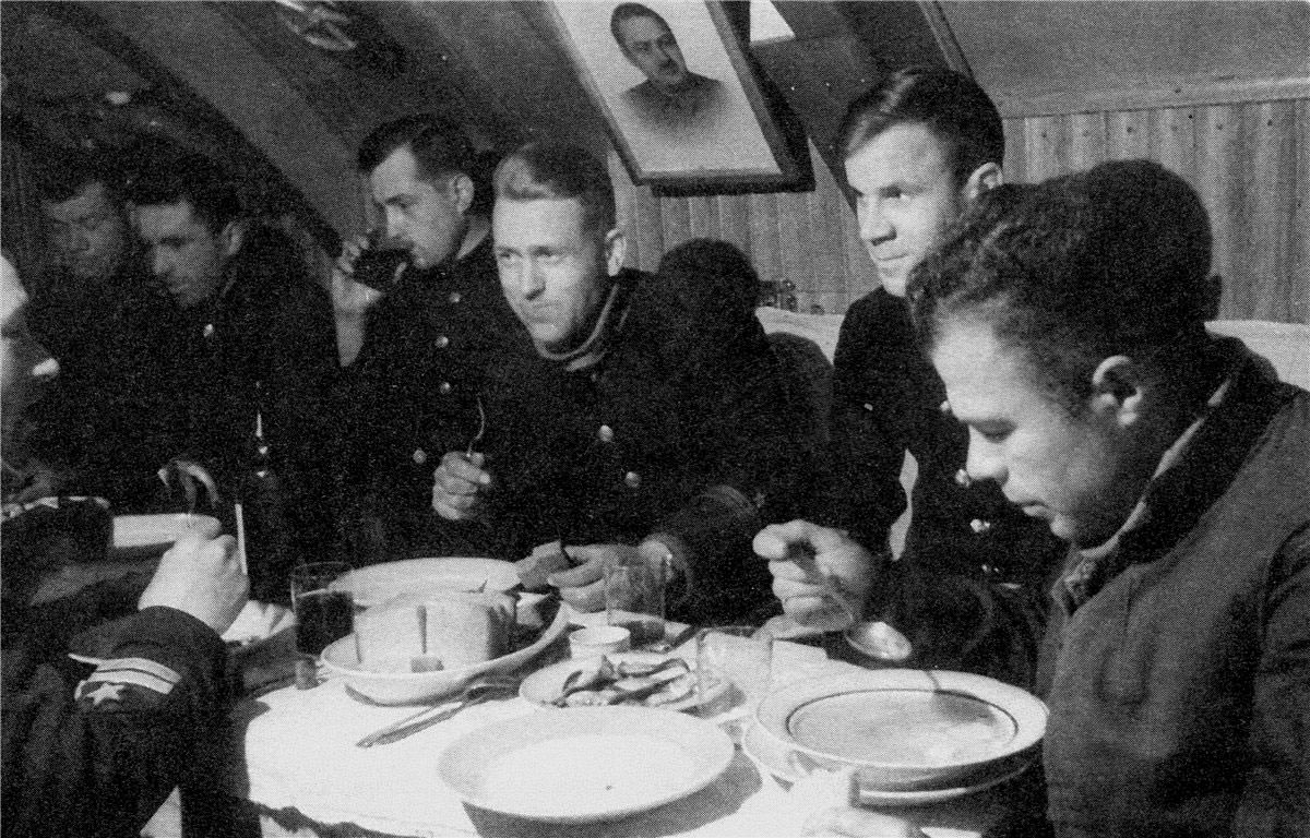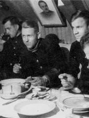 Обед в кают-кампании «К-22». Крайний справа командир подлодки В.Н. Котельников, рядом с ним военком Л.Н. Герасимов; в центре, с вилкой в руке, штурман В.П. Чурипа.