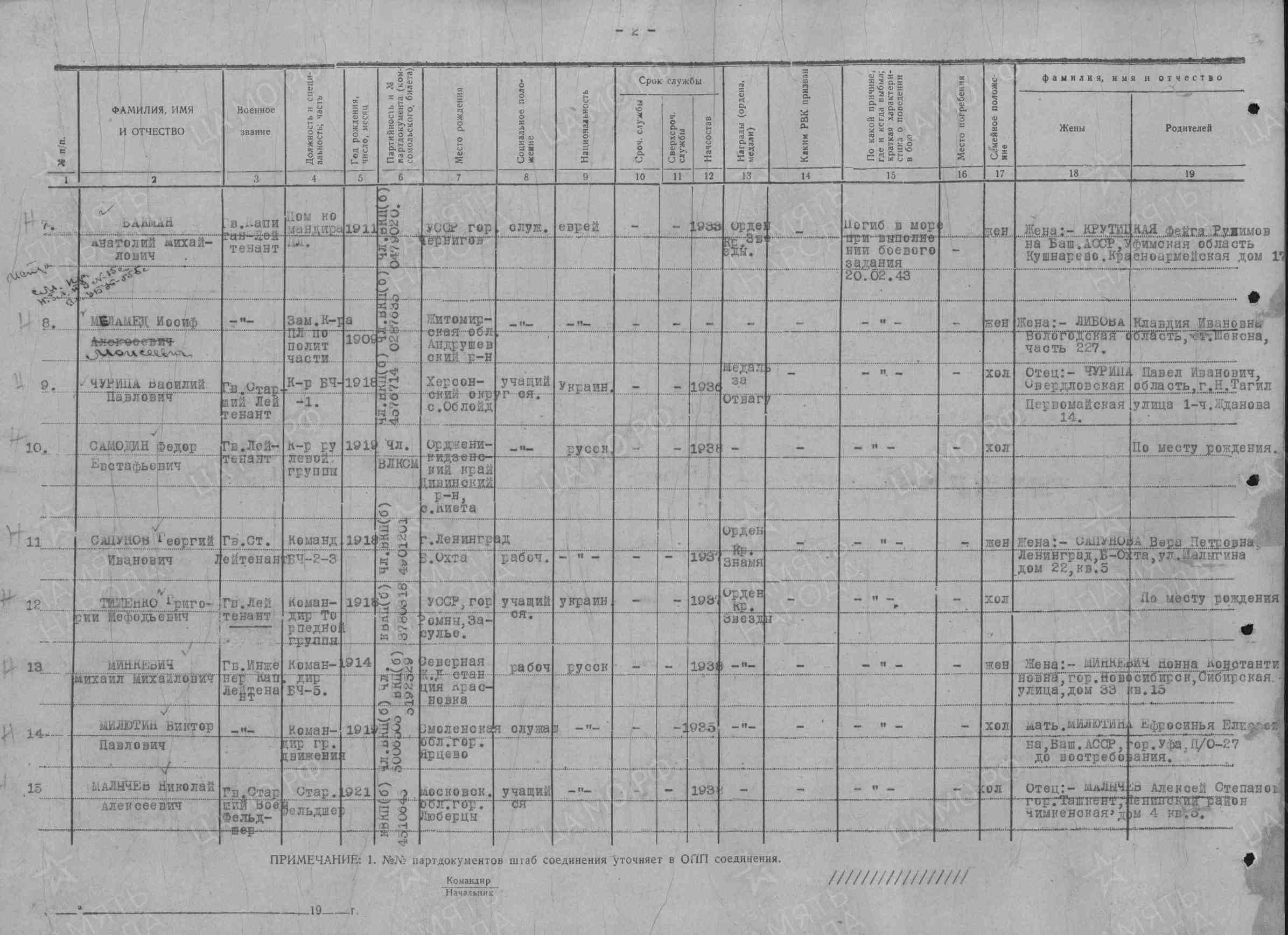 8. Меламед Иосиф Моисеевич, 1909 г.р., гвардии капитан-лейтенант, заместитель командира ПЛ по политической части.