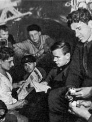 Кают-кампания «К-22». Военком подлодки Л.Н. Герасимов (с тетрадью) беседует с командным составом.