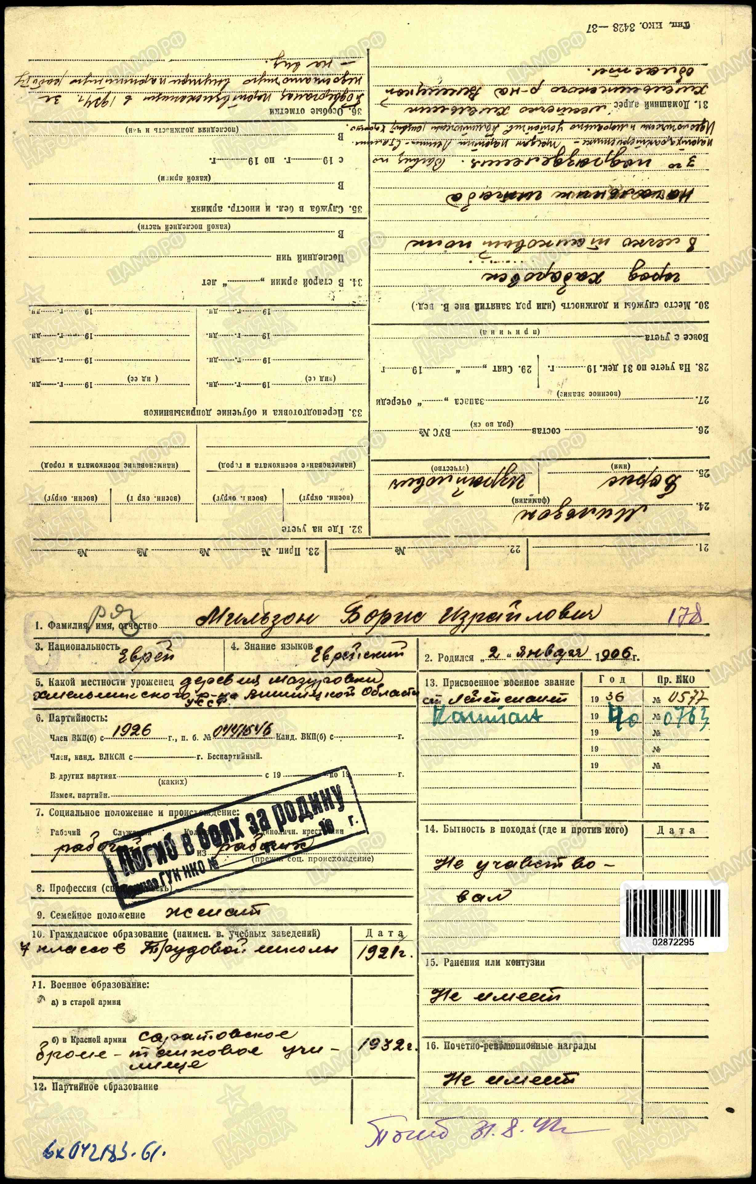 Борис Израйлович Мильзон родился 2.1.1906 в деревне  Мазуровка Хмельницкого района Винницкой области (Подольская губерния Российской Империи). Еврей.