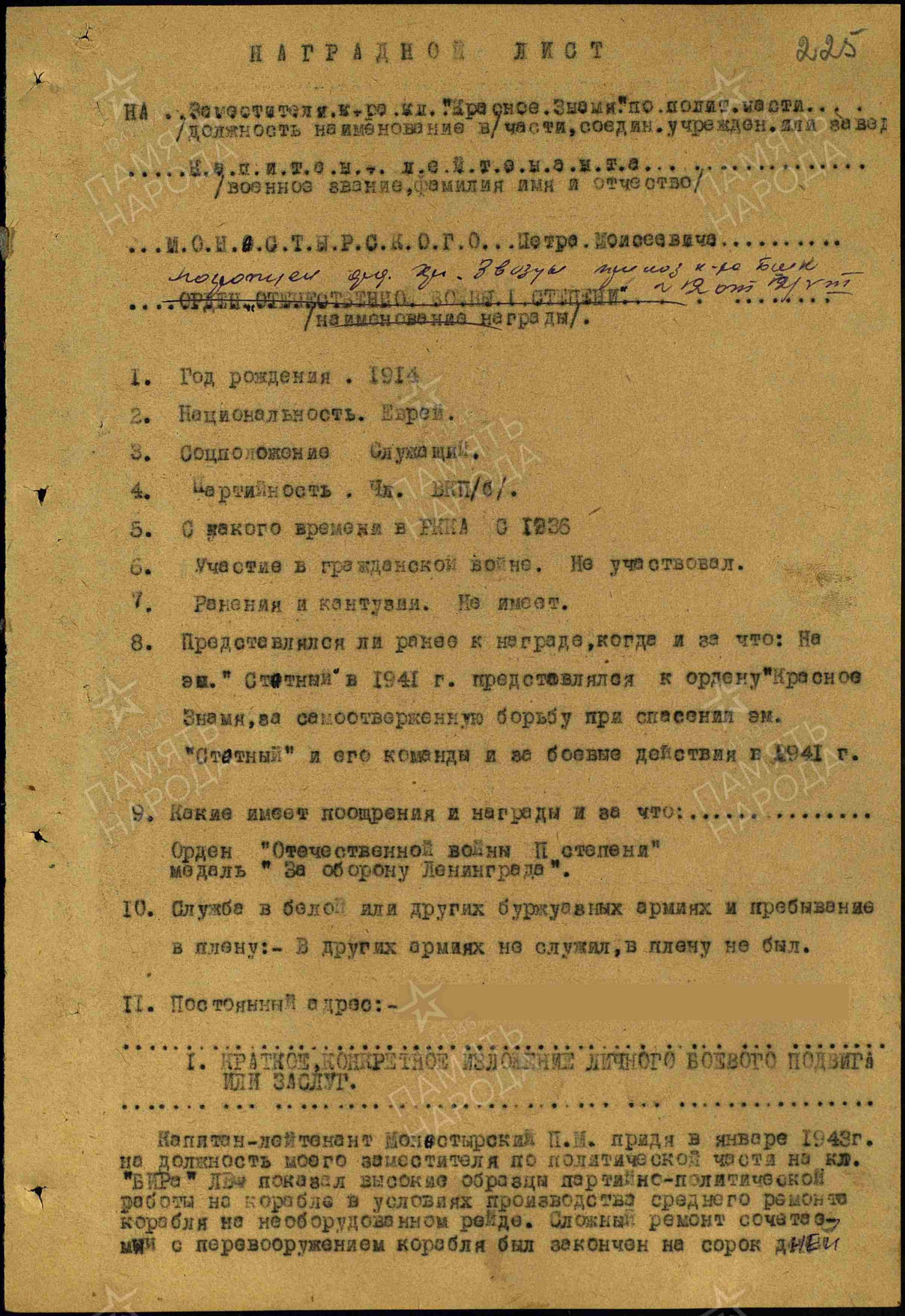 "8. Представлялся ли ранее к награде, когда и за что:   На эсминце статный в 1941 г. представлялся к ордену Красное Знамя, за самоотверженную борьбу при спасении эсминца Статный и его команды и за боевые действия в 1941 г."