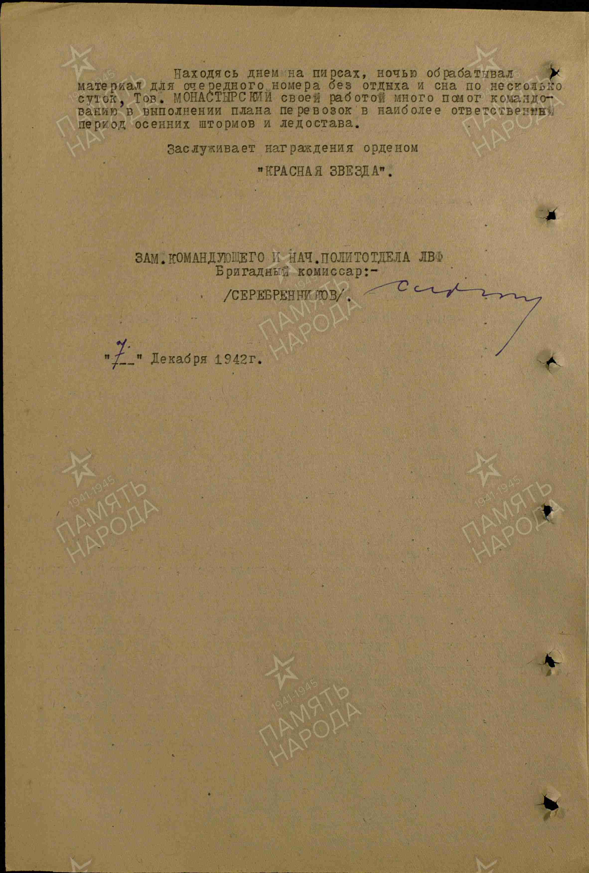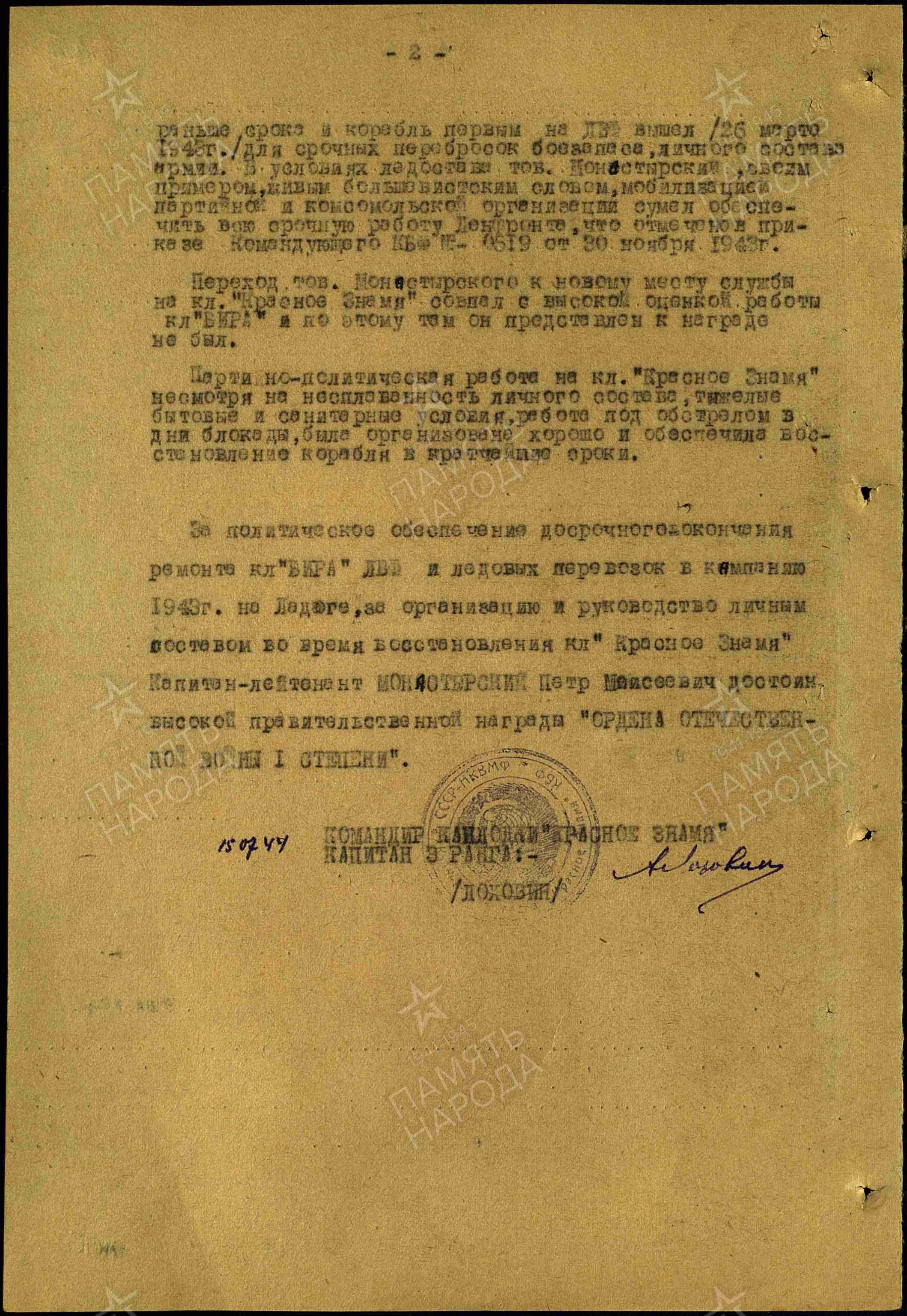 В дальнейшем боевая служба Петра Монастырского продолжалась на Онежской военной флотилии, где он с января 1943 г. был заместителем командира по политчасти на канонерской лодке "Бира" (до войны предназначалась для отправки в Биробиджан, но стала боевым кораблем на Балтике).