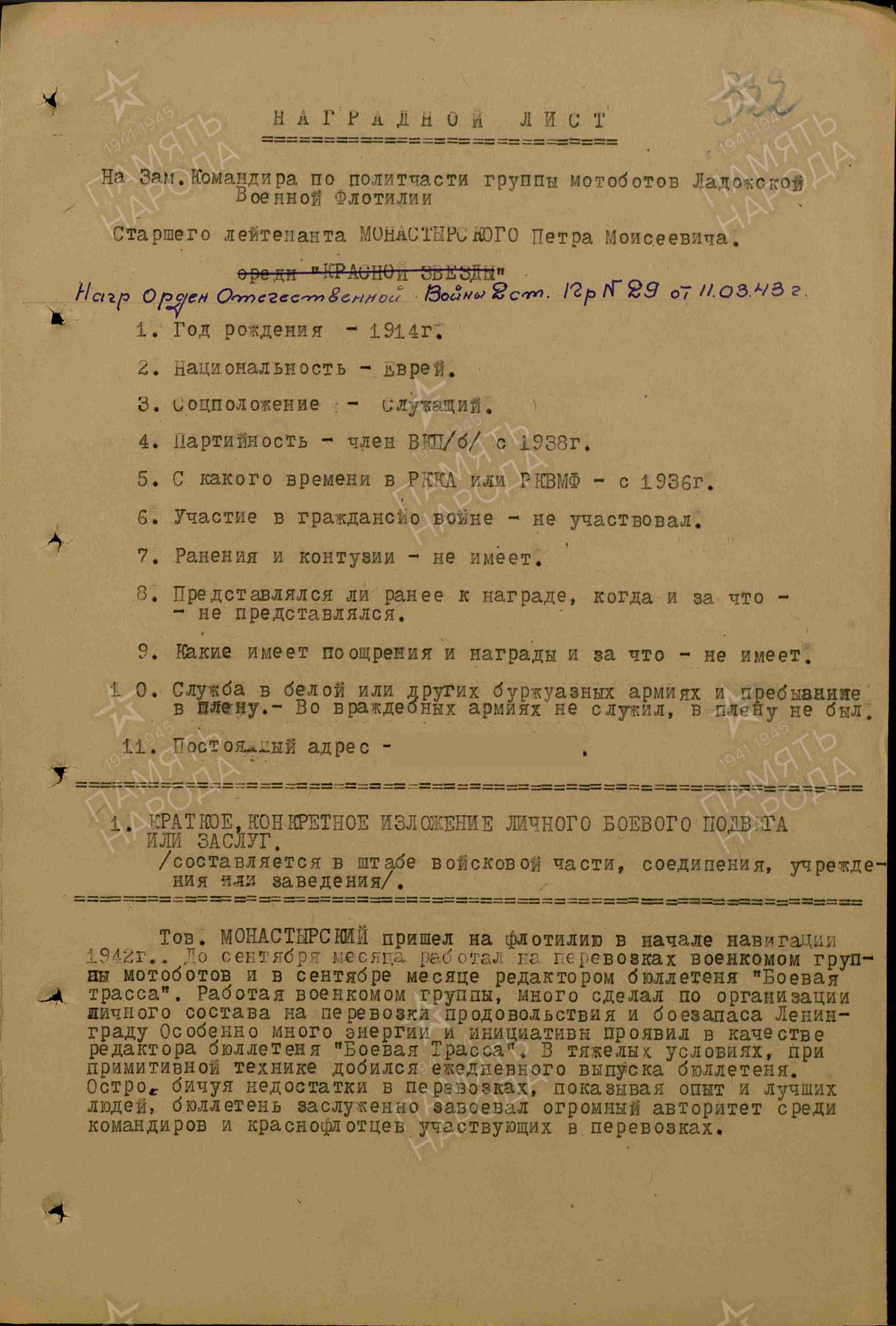 В 1985 г. Петр Монастырский получил орден Отечественной войны 2 ст, вручавшийся в связи с юбилеем Победы.