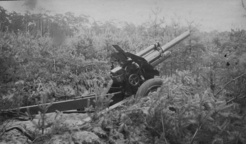 - авторское описание фотографии: "Гаубица М-30 1-й батареи 208-го гаубичного артиллерийского полка на позиции."; Информация о фотографии: Курская дуга; Место съемки: деревня Огни; Время съемки: 1943;