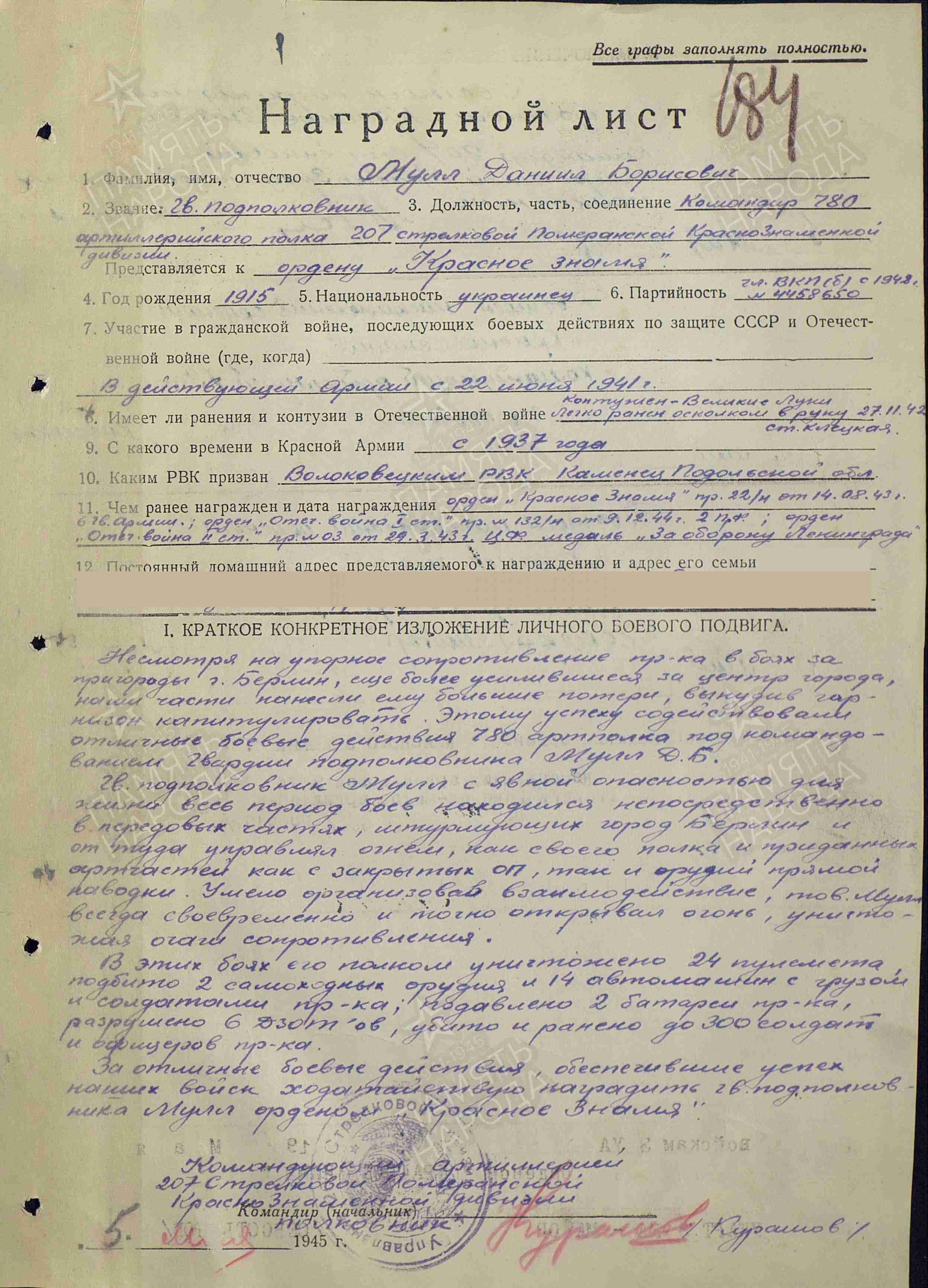 ЛИЧНАЯ СТРАНИЦА  на гвардии подполковника МУЛЛА Д. Б.: