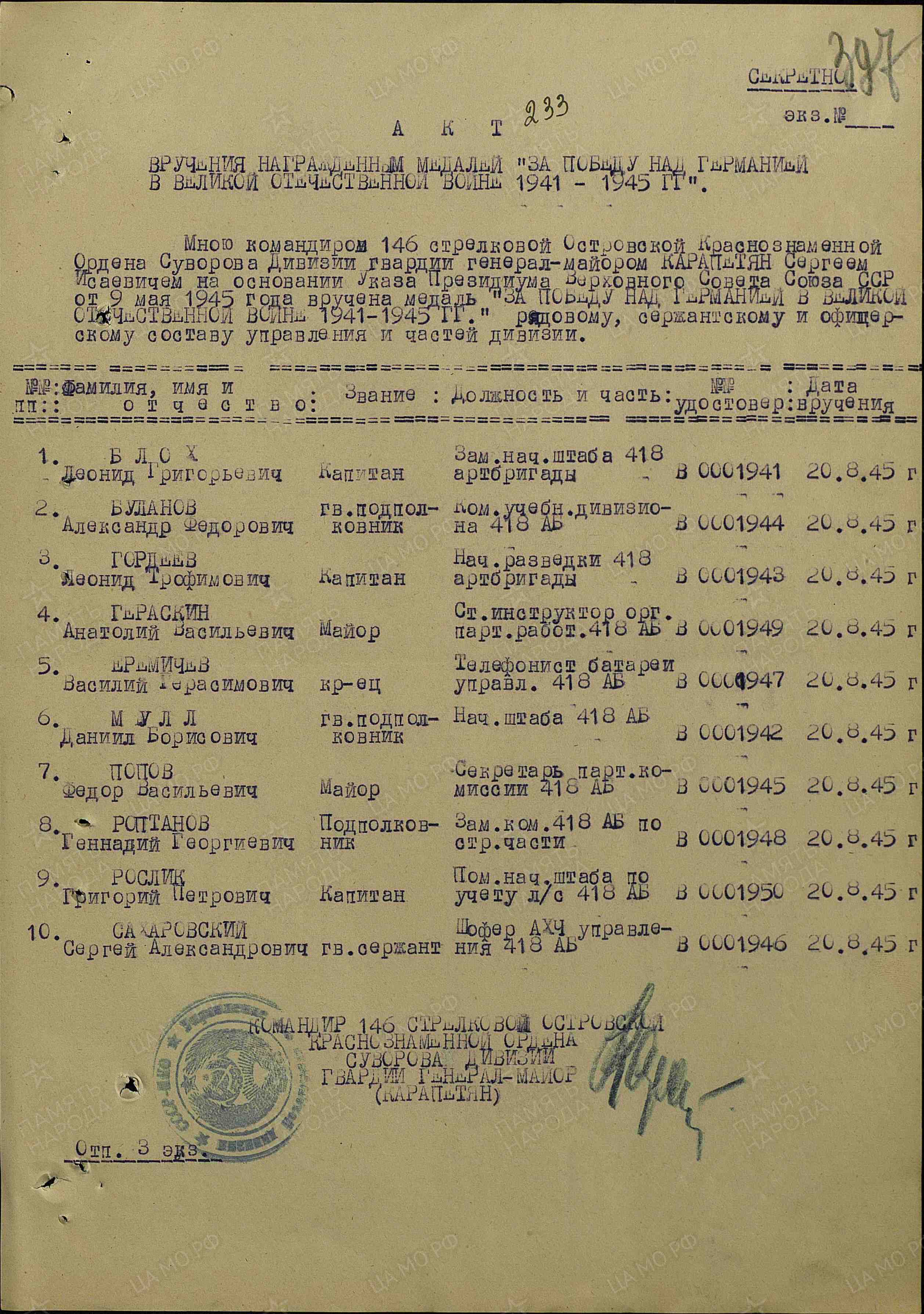 Издан: ВС 3 Уд.А 1 Белорусского фронта