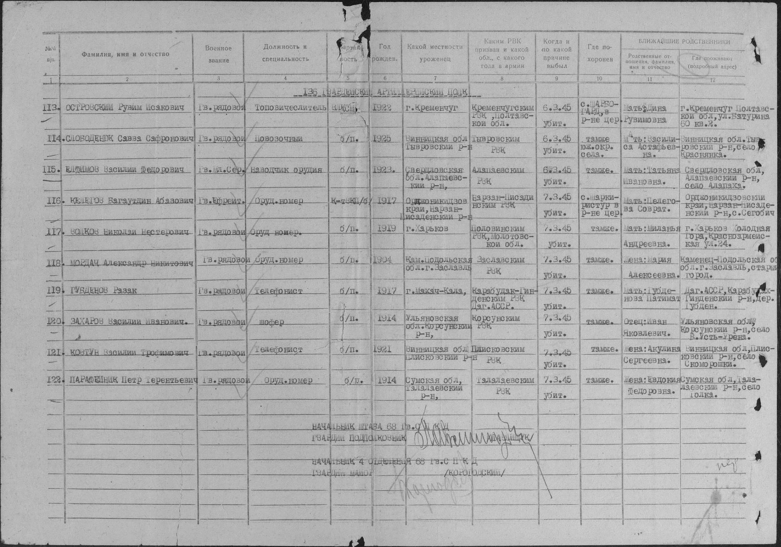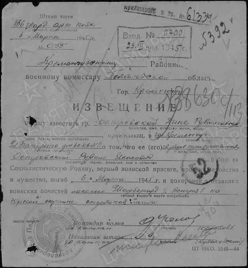 Гвардии рядовой ОСТРОВСКИЙ РУВИМ ИСААКОВИЧ, 1922 года рождения, место рождения - Украинская ССР, Полтавская область, Кременчугский район, г. Кременчуг, еврей. В РККА призван Кременчугским ГВК, г. Кременчуга, Кременчугского района, Полтавской области, Украинской ССР, в 1941 году. В Великой Отечественной войне с 02.1943 года (на Донском, Воронежском, 1 -2 -3 Украинскиих фронтах) в должности: Топографического вычислителя топографического взвода штабной батареи 136 гвардейского артиллерийского Будапештского полка, 68 гвардейской стрелковой Проскуровской Краснознамённой дивизии, 30 стрелкового корпуса, 26 армии, 3 Украинского фронта. Боевые награды: 1. Медали: "ЗА ОТВАГУ (2) с ЭЛЕКТРОННЫЙ  ДОКУМЕНТОВ «ПОДВИГ НАРОДА В ВЕЛИКОЙ ОТЕЧЕСТВЕННОЙ 1941-1945 ГГ.»  http://podvignaroda.ru/?#tab=navHome.  С Великой Отечественной войны не вернулся: 6.03.1945 года, убит, в бою. Извещение: Кременчугский ГВК, Украинская ССР, Полтавская область, Кременчугский район, г. Кременчуг, ул Батурина, дом 60, кв.№2, отец - Островский Рувим Исаакович. Захоронен: Венгрия, варм. Фейер, г. Шарбогард, в районе церкви, отдельная могила (предварительно); Венгрия, Центрально-Задунайский край, медье Фейер, (венг. Fejér), Шарбогардский яраш, г . Шарбогард, Мемориал" Шарбогард" (венг. Sárbogárd; в настоящее время). Вечная Слава и Память!
