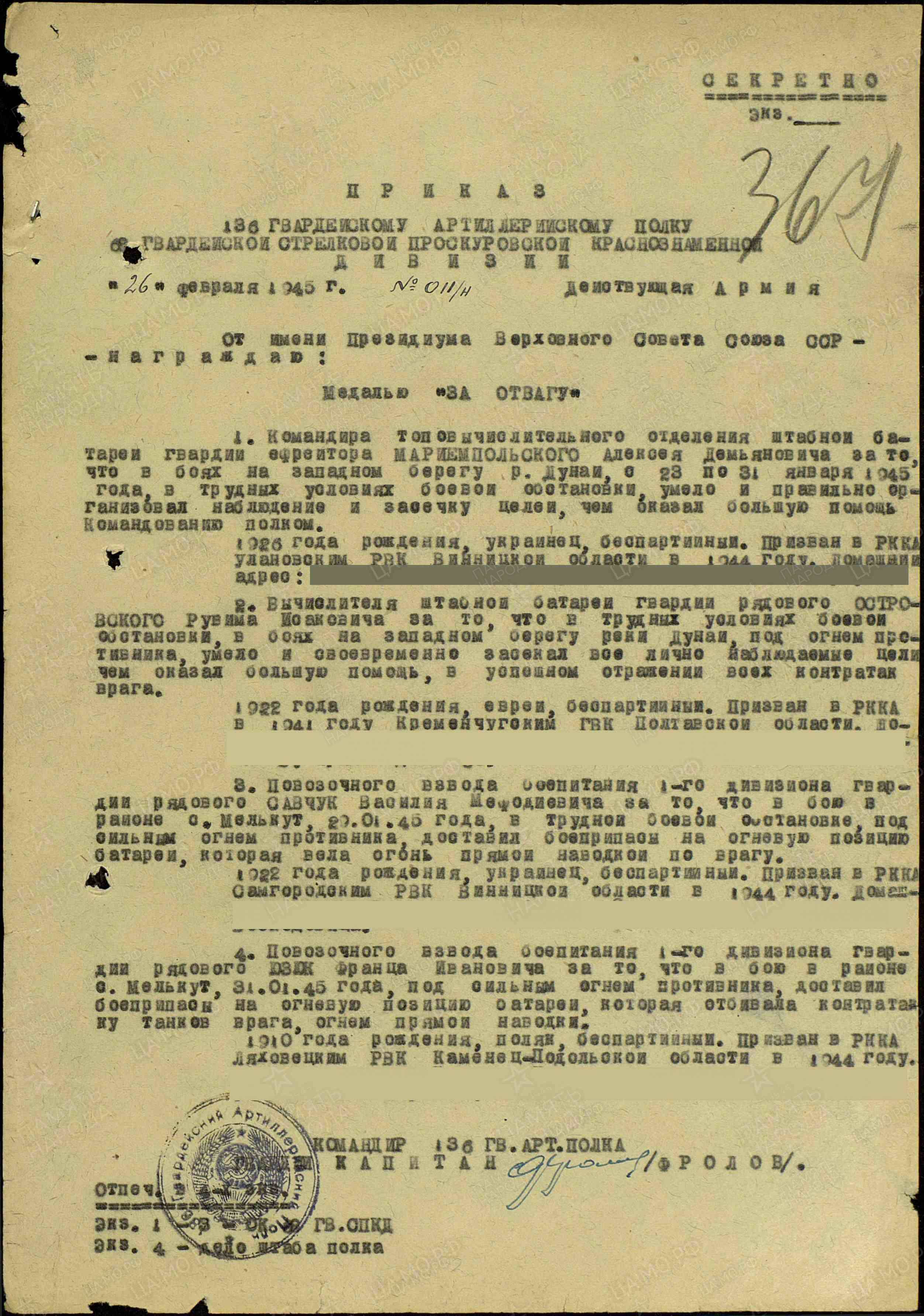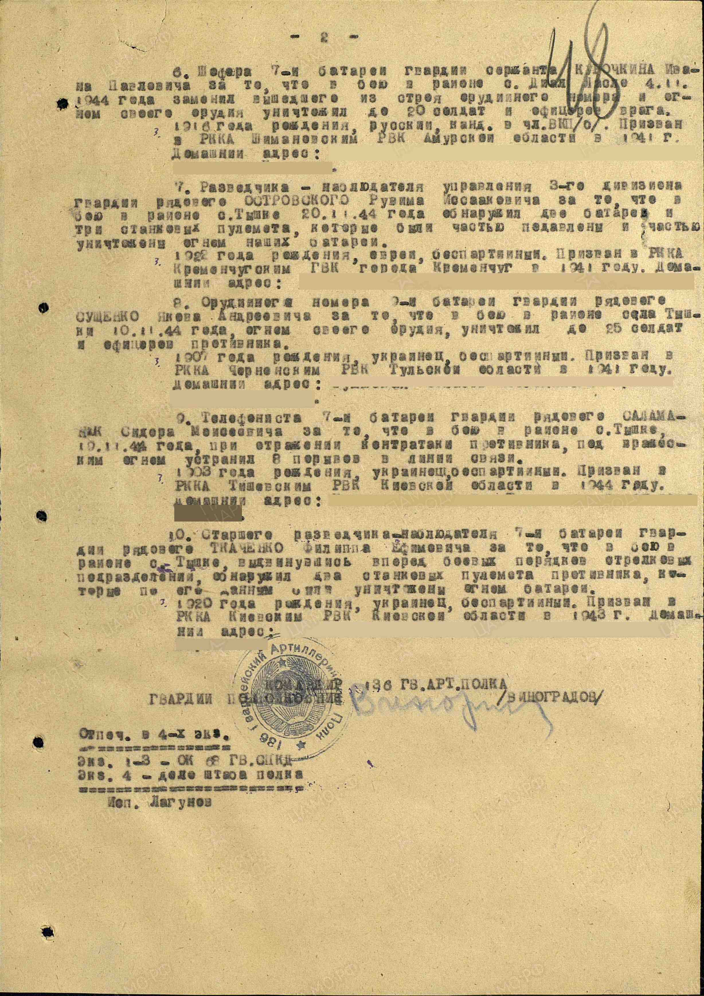 Топографический вычислитель 3 дивизиона 136 гвардейского артиллерийского Будапештского полка, 68 гвардейской стрелковой Проскуровской Краснознамённой дивизии, 30 стрелкового корпуса, 26 армии, 3 Украинского фронта.