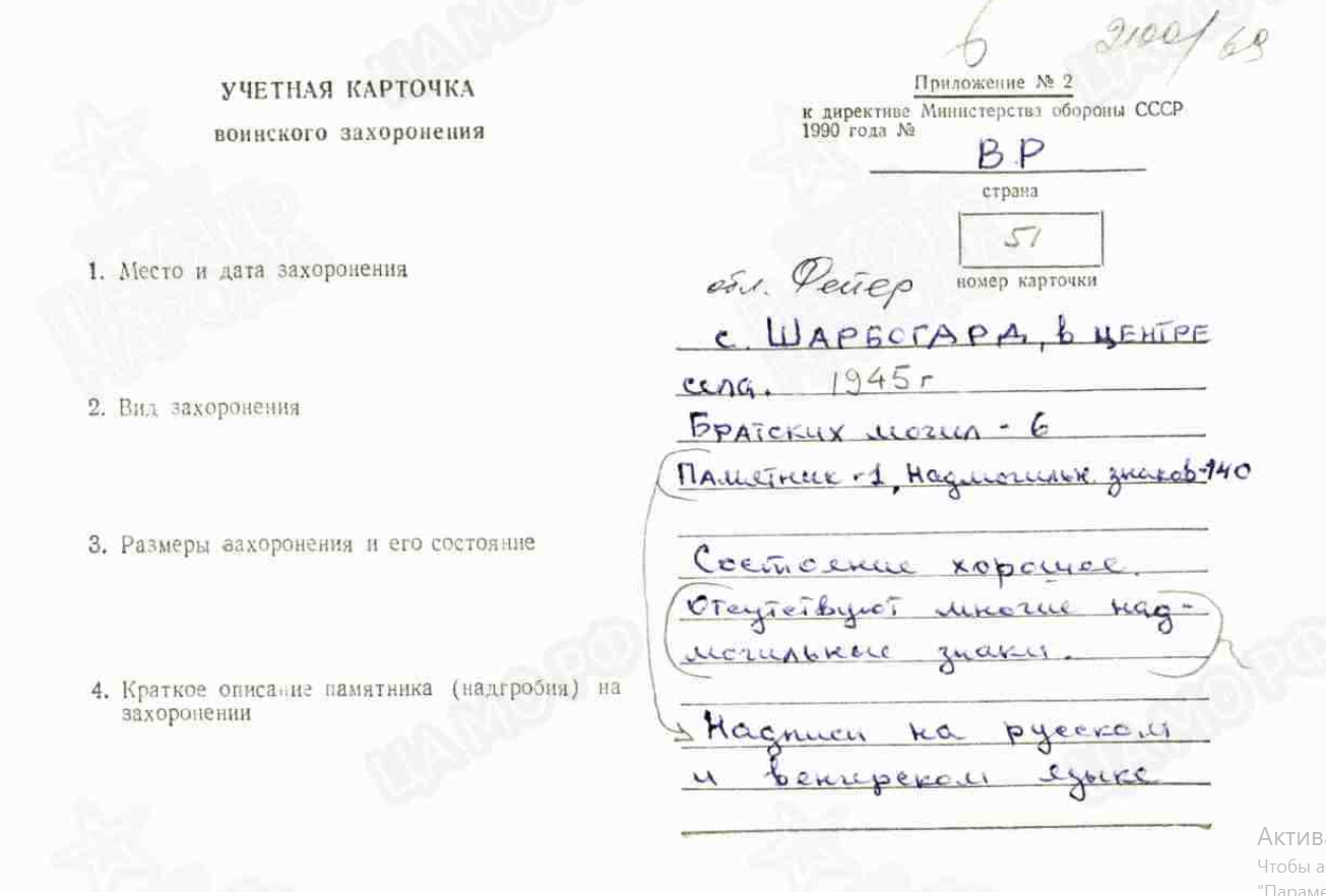 Первичное место захоронения Венгрия, варм. Фейер, м. Шарбогард, южная окраина, отдельная могила