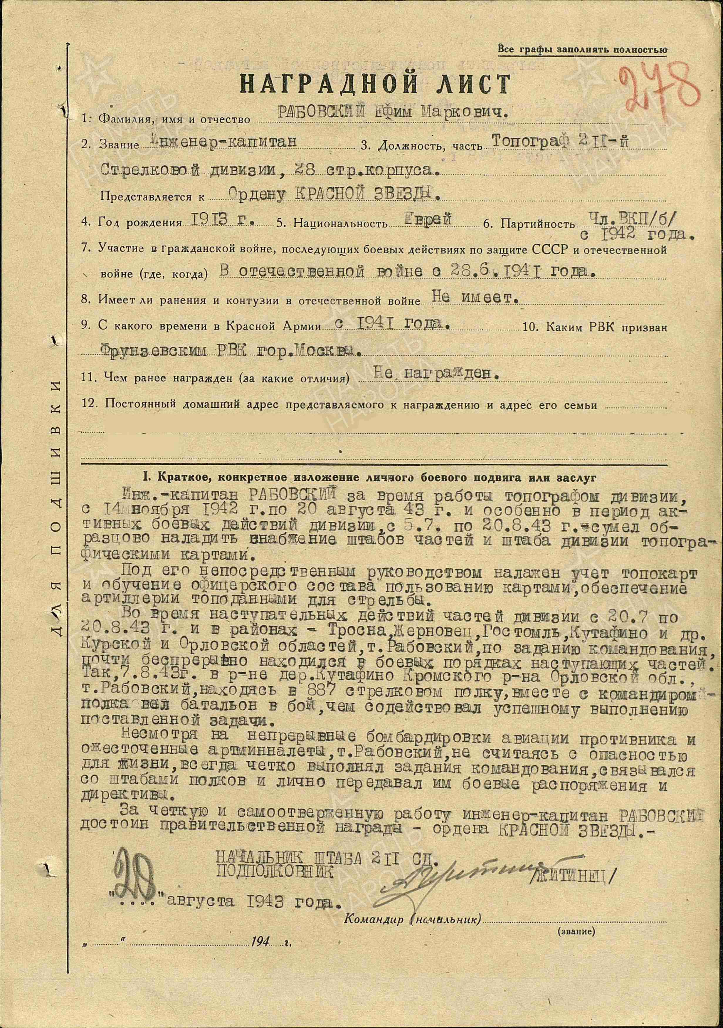 Дата рождения: __.__.1913Место рождения: Белорусская ССР, Полесская обл., м. БрагинДата поступления на службу: __.__.1941Воинское звание: инженер-подполковникРабовский Ефим МарковичОрден Отечественной войны II степениДокумент в юбилейной картотекеДата рождения: __.__.1913Место рождения: Белорусская ССР, Могилевская обл., г. БрагинНаименование награды: Орден Отечественной войны II степениНомер документа: 72Дата документа: 06.04.1985Автор документа: Министр обороны СССРПриложение:1. 211 стрелковая Черниговская Краснознамённая орденов Суворова и Кутузова дивизия (ВИКИПЕДИЯ: https://clck.ru/TAzRL ; "Дивизии РККА в годы Великой Отечественной войны": https://clck.ru/UgpLk );2. Военно - топографическая служба (ВИКИПЕДИЯ: https://clck.ru/UgpWt ;"ГЕОПРИБОР": https://clck.ru/UgpUe );3. "МОЙ ШТЕТЛ", проект "Голоса еврейских местечек": Гомельская область, г. Брагин ( http://shtetle.com/shtetls_gom/bragin/bragin.html );4. Личная фотография, биография инженера - подполковника РАБОВСКОГО Е. М. ("БЕССМЕРТНЫЙ ПОЛК МОСКВА, Электронная Книга Памяти: https://www.polkmoskva.ru/people/969170/ ).