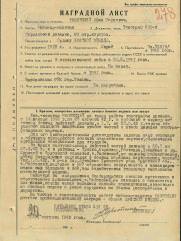 Медали: "ЗА БОЕВЫЕ ЗАСЛУГИ" (06.1952), "ЗА ПОБЕДУ НАД ГЕРМАНИЕЙ В ВЕЛИКОЙ ОТЕЧЕСТВЕННОЙ ВОЙНЕ 1941 - 1945 ГГ.".