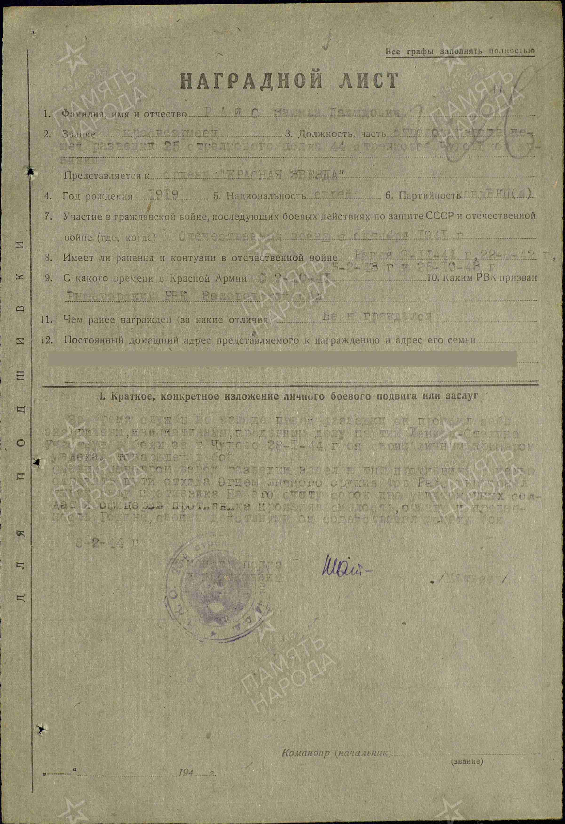 Райс Залман Давидович родился 1.5.1918 года в местечке Володьба в Польше. Еврей. Осенью 1939 года бежал от немецкой оккупации на территорию СССР. Призван в Красную Армию 10.1941 в Вологодской области.