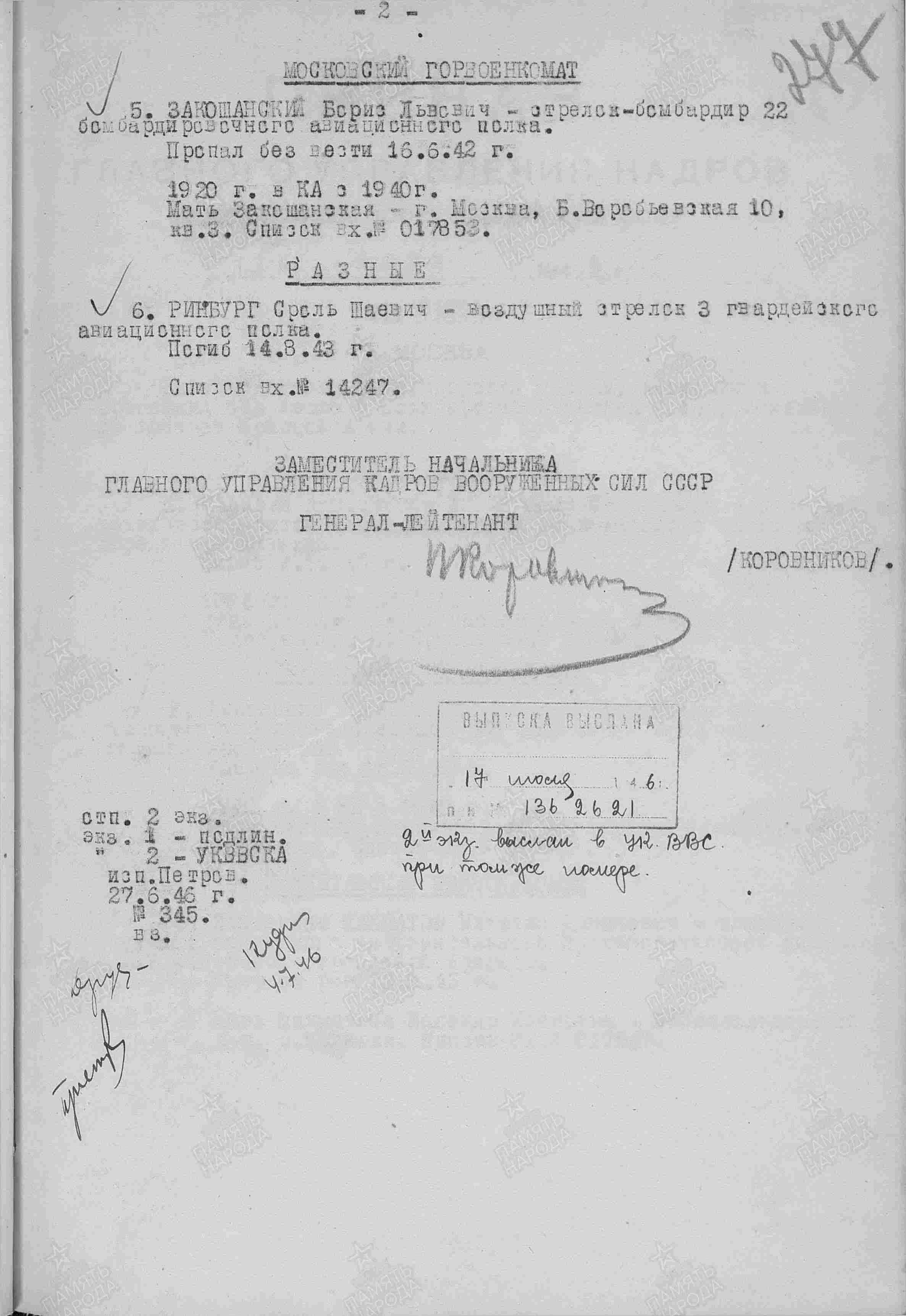- краткая информация из "Списка евреев - военнослужащих лётного состава ВВС СССР, в годы Великой Отечественной войны." (https://clck.ru/PuMeu ) - сотрудников проекта www.jewmil.com "ВОИНЫ - ЕВРЕИ" Григория Койфмана, Геннадия Чернакова.