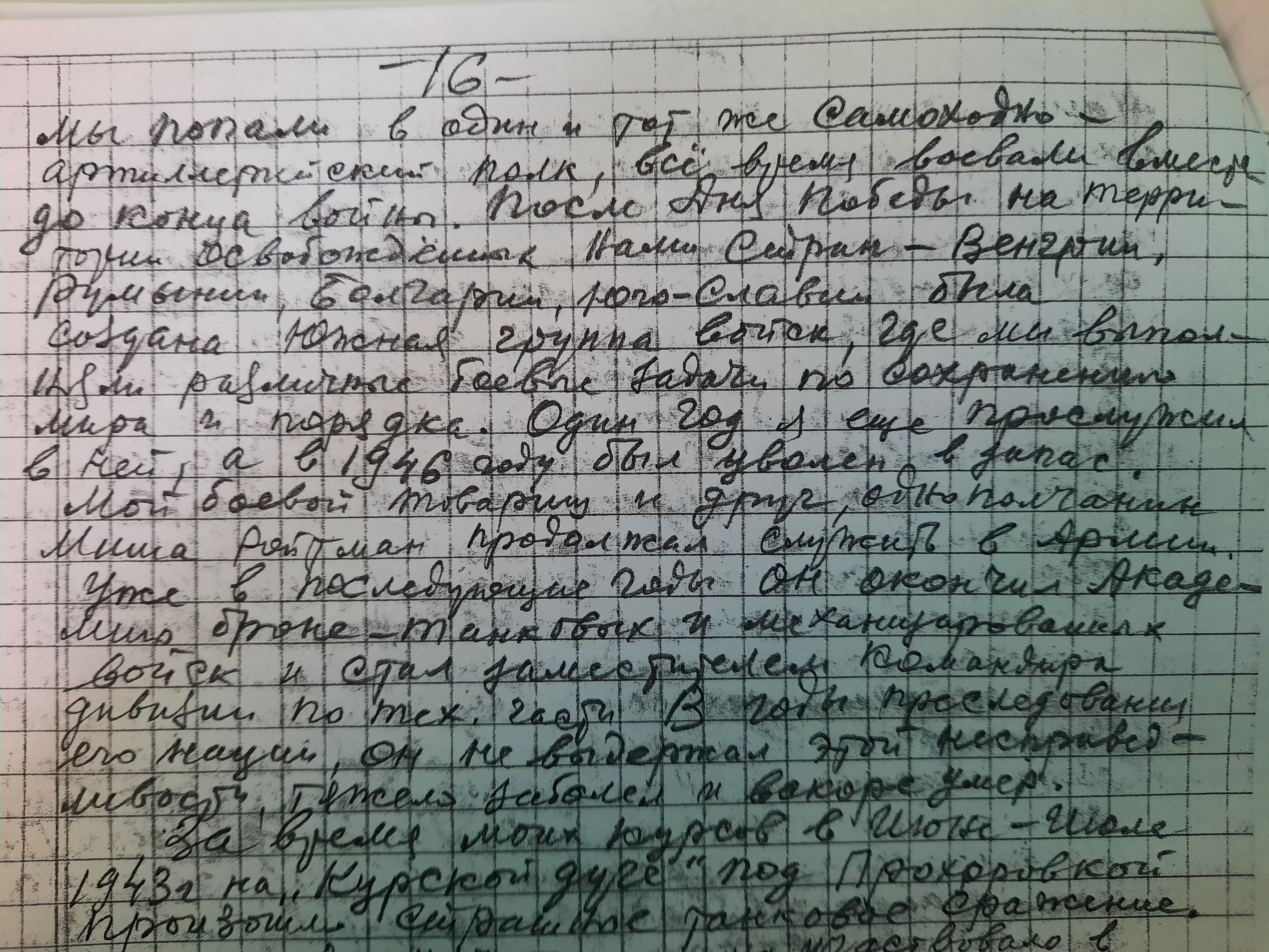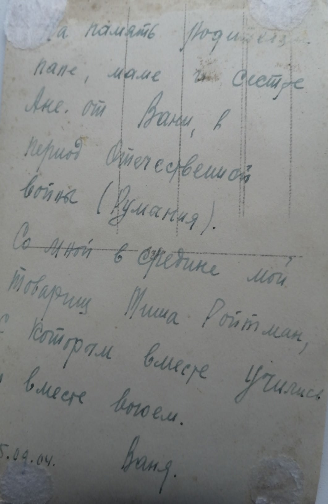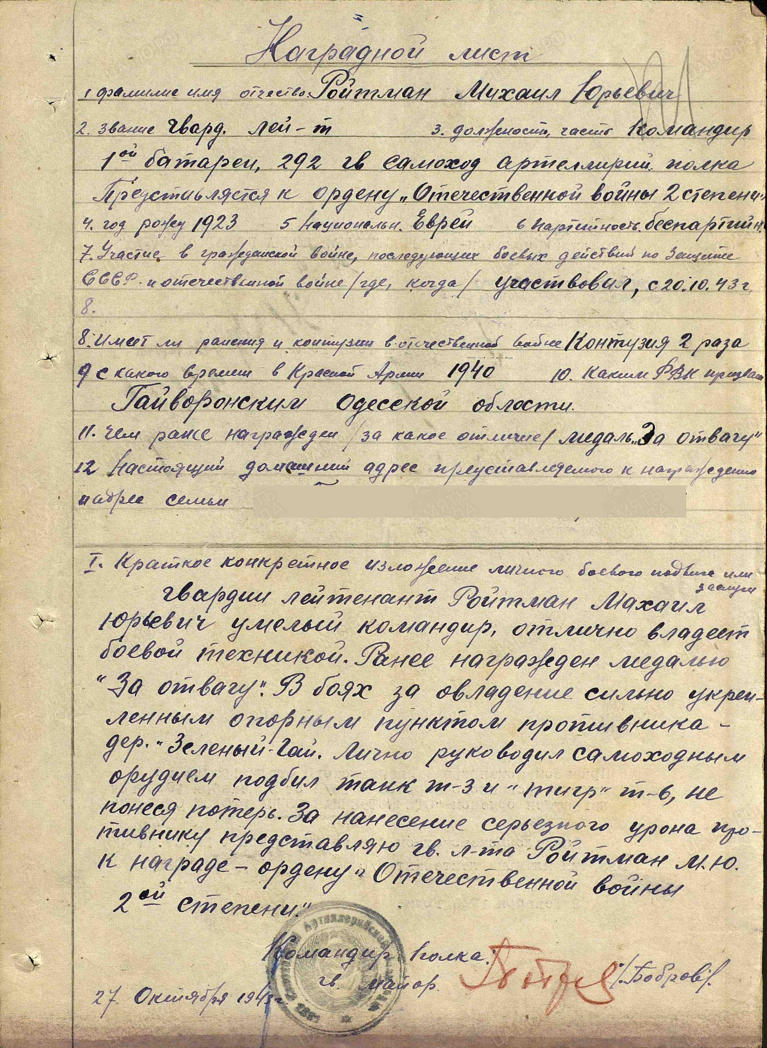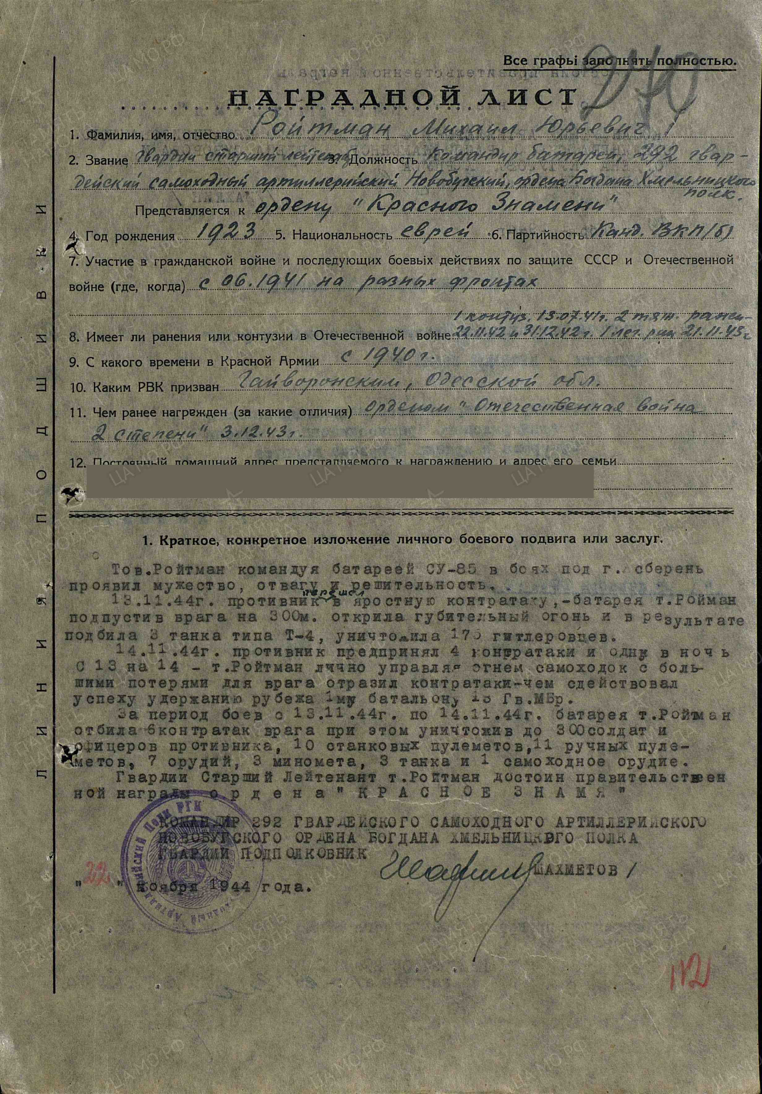 Гвардии капитан РОЙТМАН МИХАИЛ ЮРЬЕВИЧ, 1923 года рождения, место рождения - Украинская ССР, Одесская область, Гайворонский район, местечко Хащеватое, еврей. В РККА призван Гайворонским РВК, Гайворонского района, Одесской области, в 1940 году. В Великой Отечественной войне с 20.10.1943 года (на Донском,  2- 3 - 4 Украинских фронтах) в должности (последняя, 1945 год): Командир батареи 292 гвардейского самоходного артиллерийского Новобугского ордена Богдана Хмельницкого полка, 4 гвардейского механизированного Сталинградского Краснознамённого орденов Суворова и Кутузова корпуса, , 2 Украинского фронта. Ранения: Контужен (2 раза). Боевые награды: 1.Ордена: "КРАСНОГО ЗНАМЕНИ", ОТЕЧЕСТВЕННОЙ ВОЙНЫ" 2 СТЕПЕНИ, "КРАСНОЙ ЗВЕЗДЫ"; 2. Медали: "ЗА ОТВАГУ",  "ЗА БОЕВЫЕ ЗАСЛУГИ", "ЗА ОБОРОНУ СТАЛИНГРАДА", "ЗА ОСВОБОЖДЕНИЕ БЕЛГРАДА", "ЗА ПОБЕДУ НАД ГЕРМАНИЕЙ В ВЕЛИКОЙ ОТЕЧЕСТВЕННОЙ ВОЙНЕ 1941 - 1945 ГГ." с ЭЛЕКТРОННЫЙ  ДОКУМЕНТОВ «ПОДВИГ НАРОДА В ВЕЛИКОЙ ОТЕЧЕСТВЕННОЙ 1941-1945 ГГ.»  http://podvignaroda.ru/?#tab=navHome. Вернулся с Великой Отечественной войны. Послевоенная судьба: неизвестна. Вечная Слава и Память!