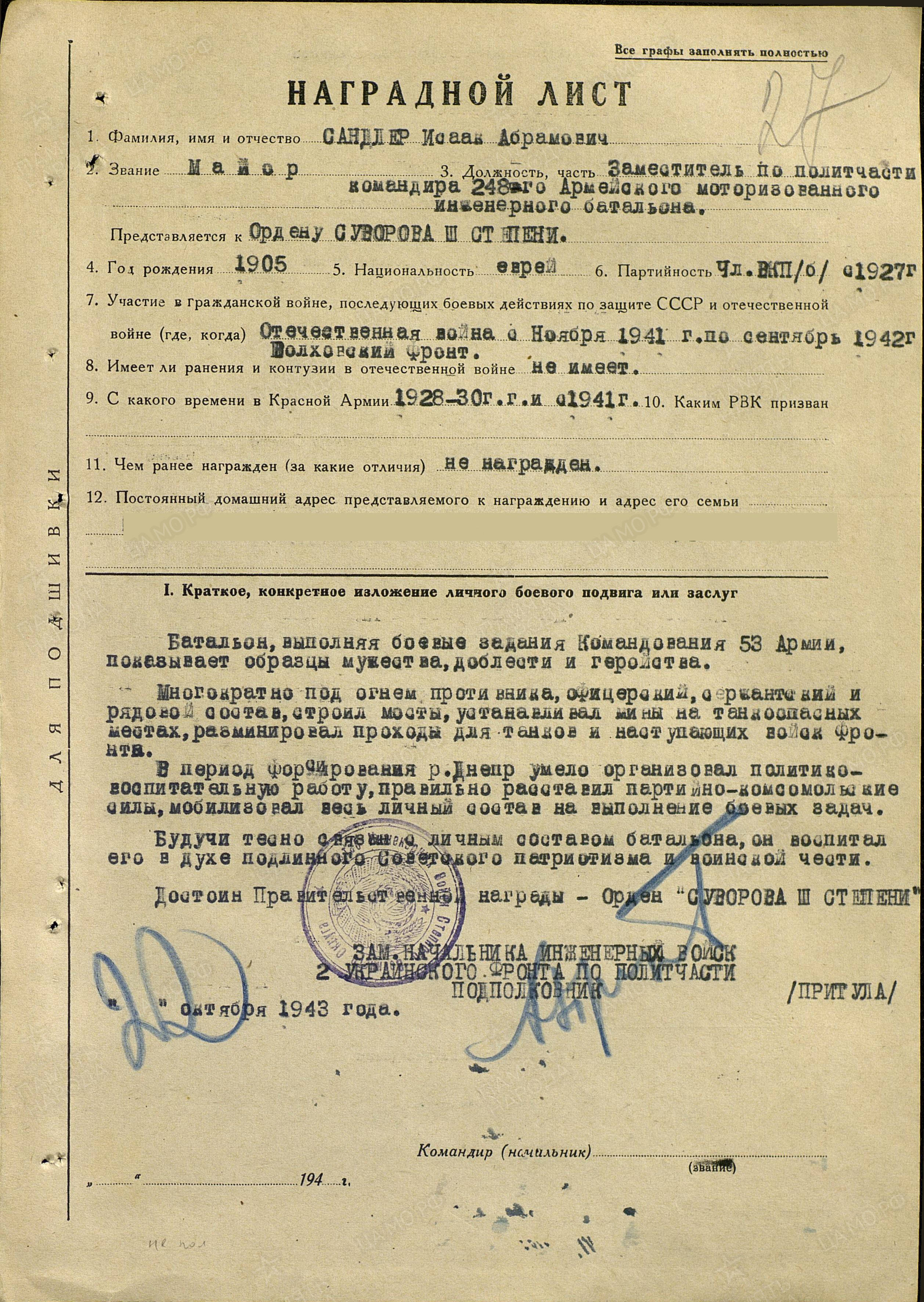 заместитель командира 248-го армейского моторизованного инженерного батальона по политчасти, 53-й армии, 2-го Украинского фронта