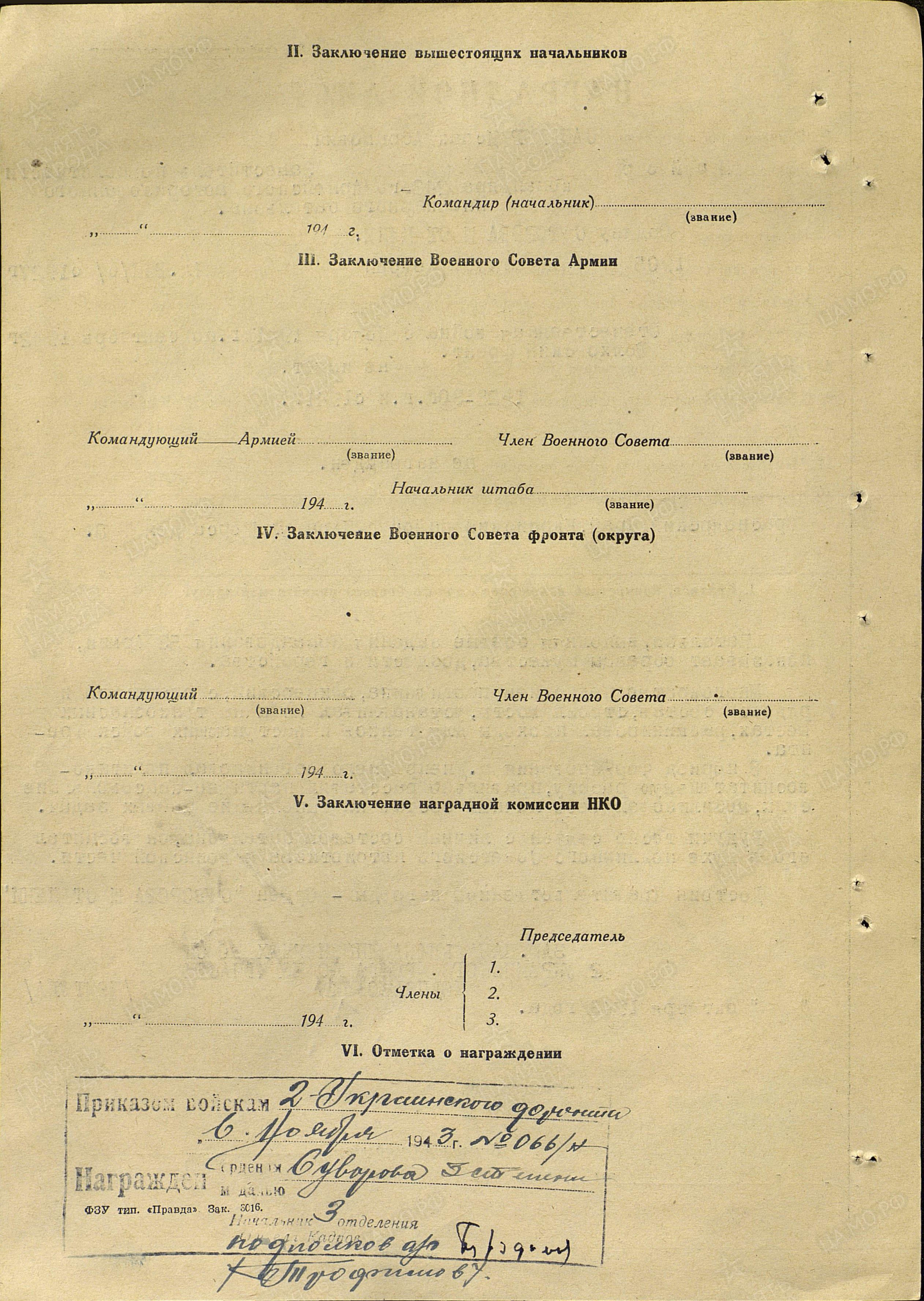 Орден Суворова 3-й степени, два ордена Красной Звезды, медали.