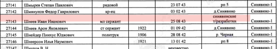Старший сержант ШНЕЕР АРОН ЯКОВЛЕВИЧ, 1922 года рождения, место рождения - Латвия, Латгалия, г. Лудза, еврей. В Красной Армии с августа 1941 года. Участник обороны Москвы. В декабре 1941 года был ранен под Наро-Фоминском. После госпиталя направлен в военное училище, в г Уфа, Башкирской ССР. Незакончивших обучение курсантов направили на защиту Ленинграда, в 259 стрелковую дивизию, 34 армии, Волховского фронта. Убит, в бою, 1.09.1942 года. Захоронен: РОССИЯ, Ленинградская область, Кировский район, городской посёлок Синявино, ул. Песочная, братское воинское захоронение.