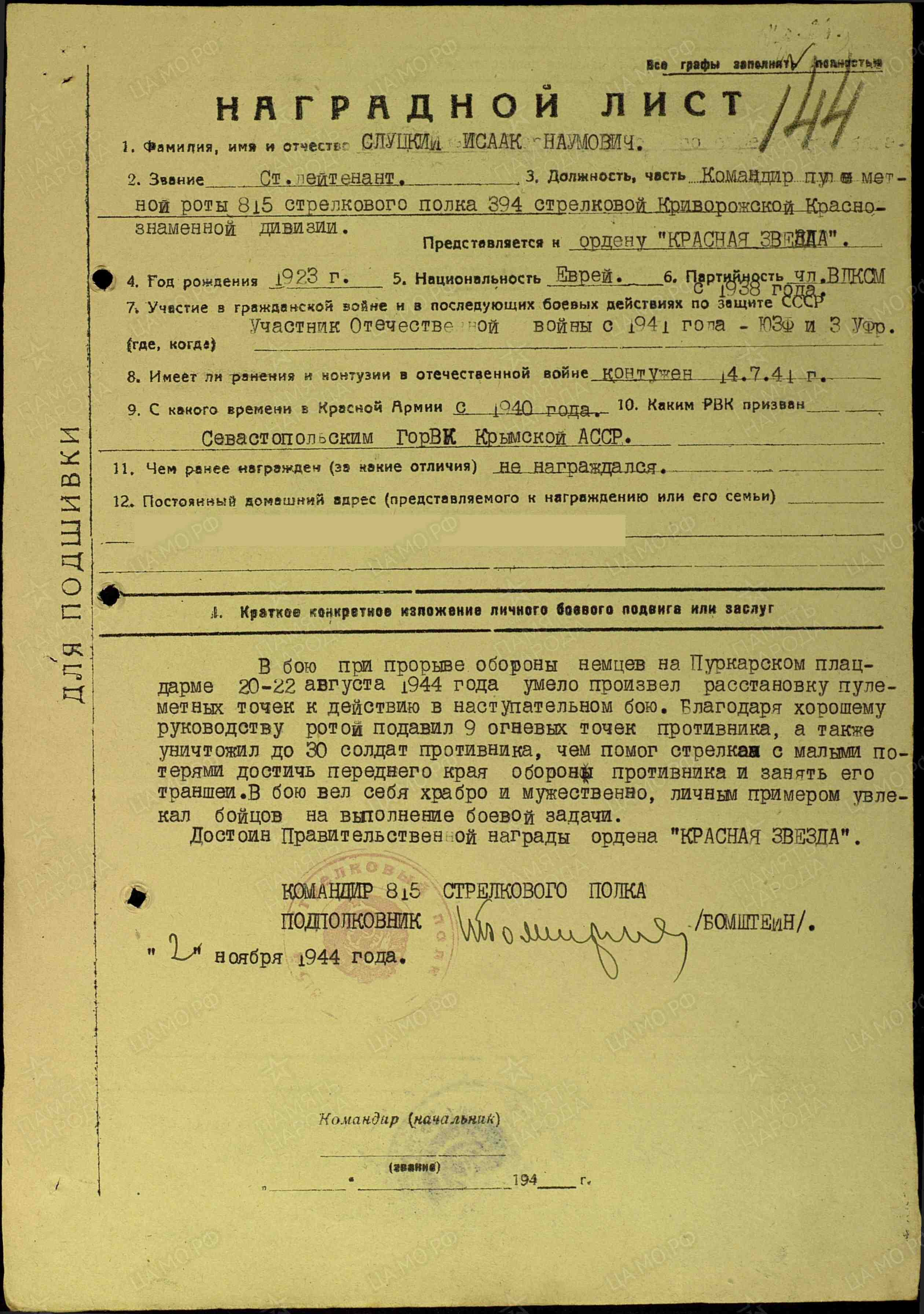 Капитан СЛУЦКИЙ ИСААК НАУМОВИЧ, 19.04.1923 года рождения, место рождения - РСФСР, Крымская область, г. Севастополь, еврей. В РККА призван Севастопольским ГВК, г. Севастополя, 101940 года. В Великой Отечественной войне с 06.1941 года (на Юго - Западном, 3 Украинском фронтах) в должности (последняя, 1945 год): Командира пулеметной роты 815 стрелкового полка, 394 стрелковой Криворожской Краснознаменной дивизии, 34 стрелкового корпуса, 37 армии, 3 Украинского фронта. Ранения: 1. Контузия (14.07.1941 года). Боевые награды: 1. Орден "КРАСНОЙ ЗВЕЗДЫ"; 2. Медаль "ЗА ПОБЕДУ НАД ГЕРМАНИЕЙ В ВЕЛИКОЙ ОТЕЧЕСТВЕННОЙ ВОЙНЕ 1941 - 1945 ГГ." с ЭЛЕКТРОННЫЙ ДОКУМЕНТОВ «ПОДВИГ НАРОДА В ВЕЛИКОЙ ОТЕЧЕСТВЕННОЙ 1941-1945 ГГ.» http://podvignaroda.ru/?#tab=navHome. Вернулся с Великой Отечественной войны. Уволен, в запас, 19.11.1946 года. Вечная Слава и Память!