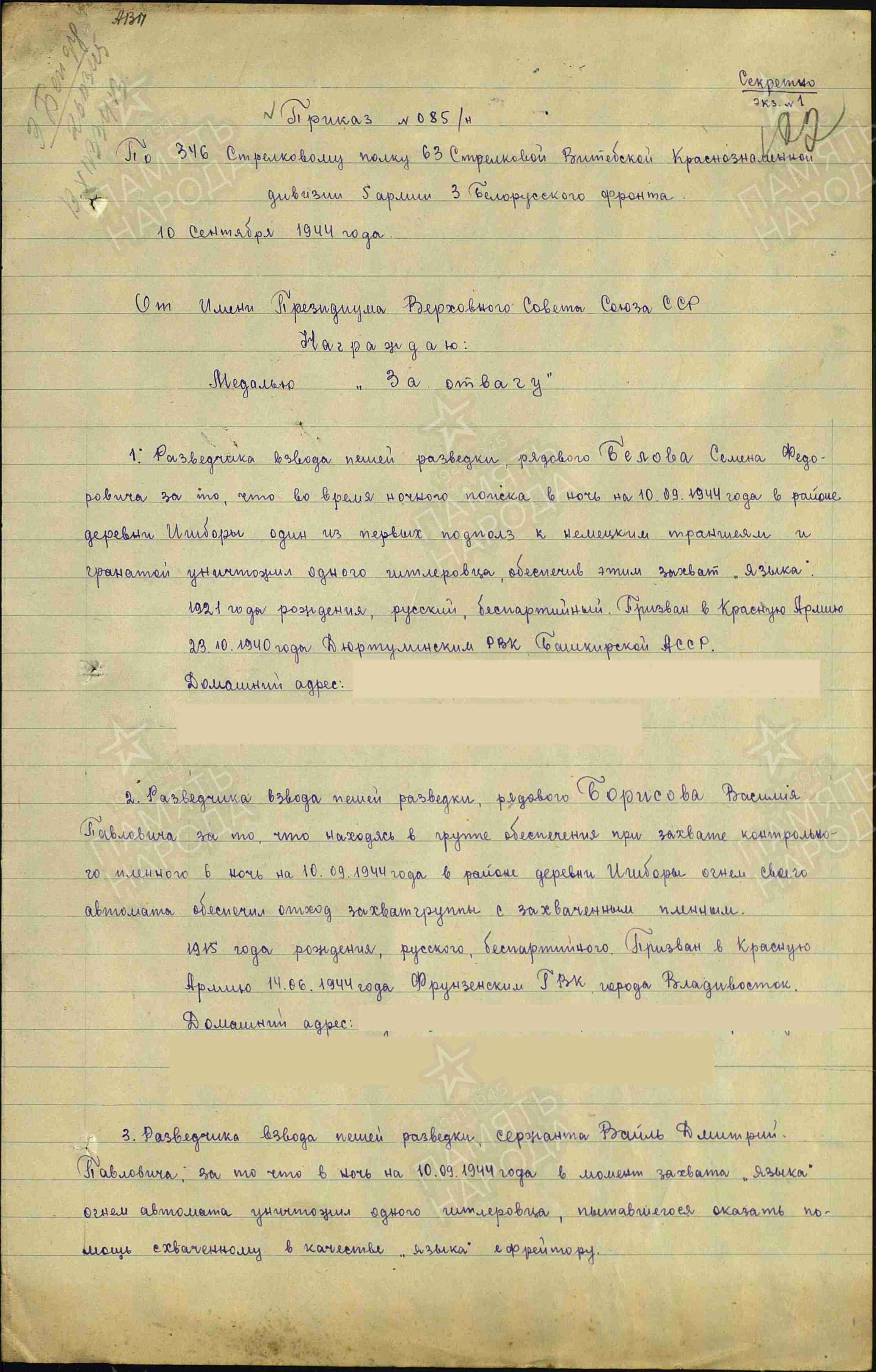 Разведчик взвода пешей разведки 346- го стрелкового полка, 63-й стрелковой Витебской Краснознаменной дивизии.