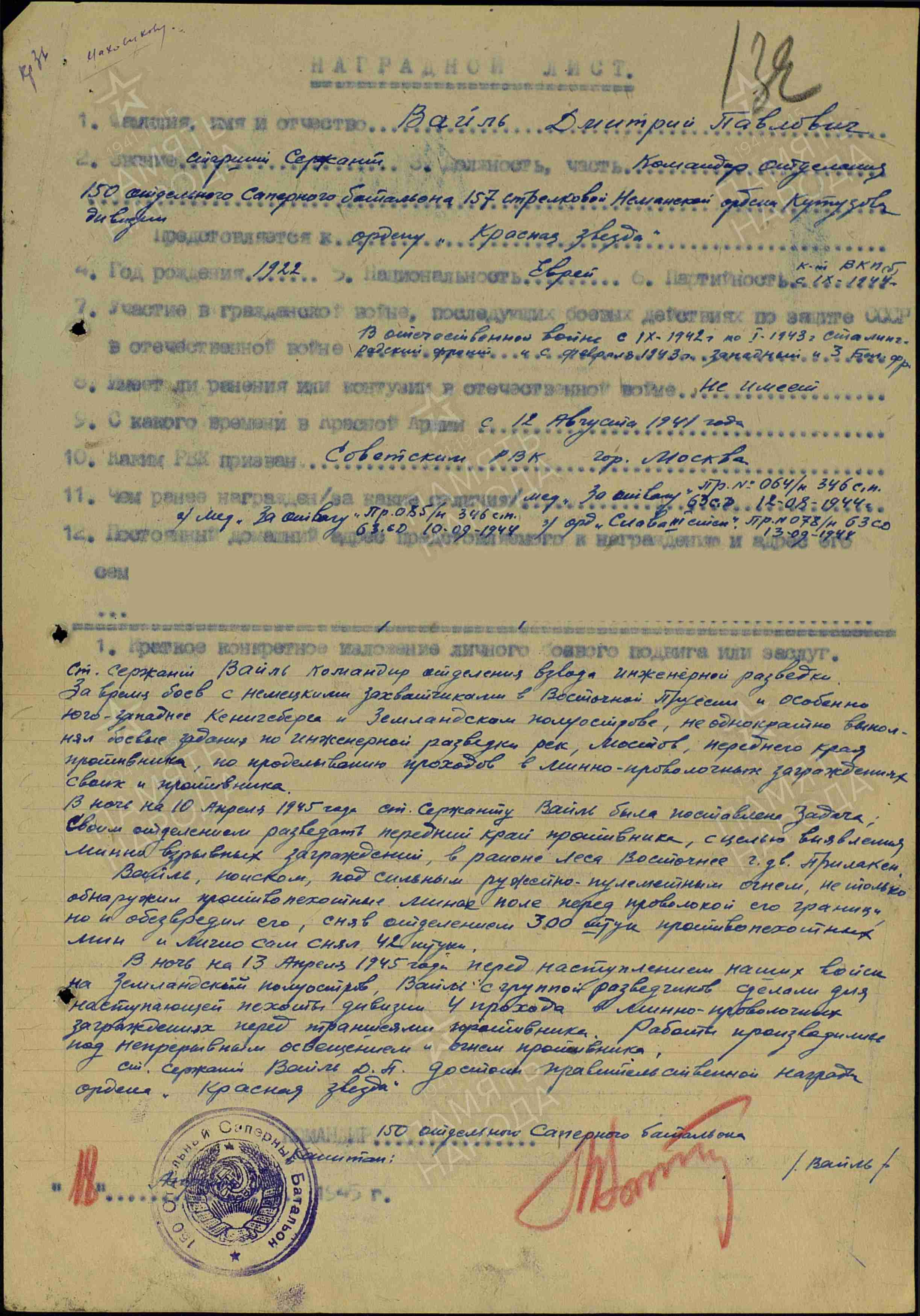 Командир отделения 150- го отдельного саперного батальона, 157-й стрелковой Неманской ордена Кутузова дивизии.