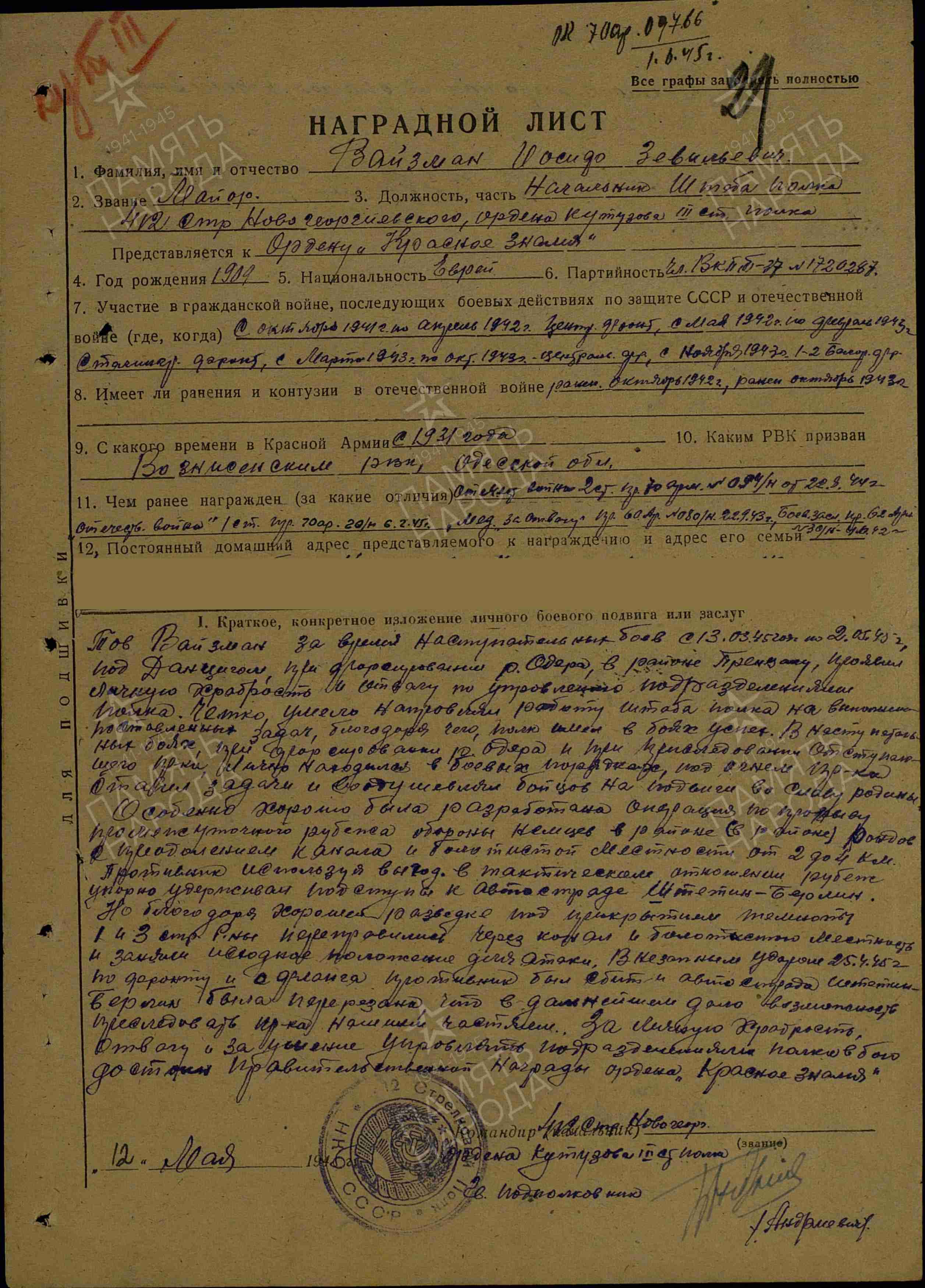 Летом 1943 года был  осужден трибуналом и направлен "искупать вину кровью" в 8-й отдельный штрафной ("офицерский") батальон, (причина осуждения неизвестна). Сержант-штрафник,  помкомвзвода И.З.Вайзман был ранен в бою, награжден медалью "За Отвагу" и после восстановления в звании и в правах продолжил воевать в стрелковых частях офицером-пехотинцем.