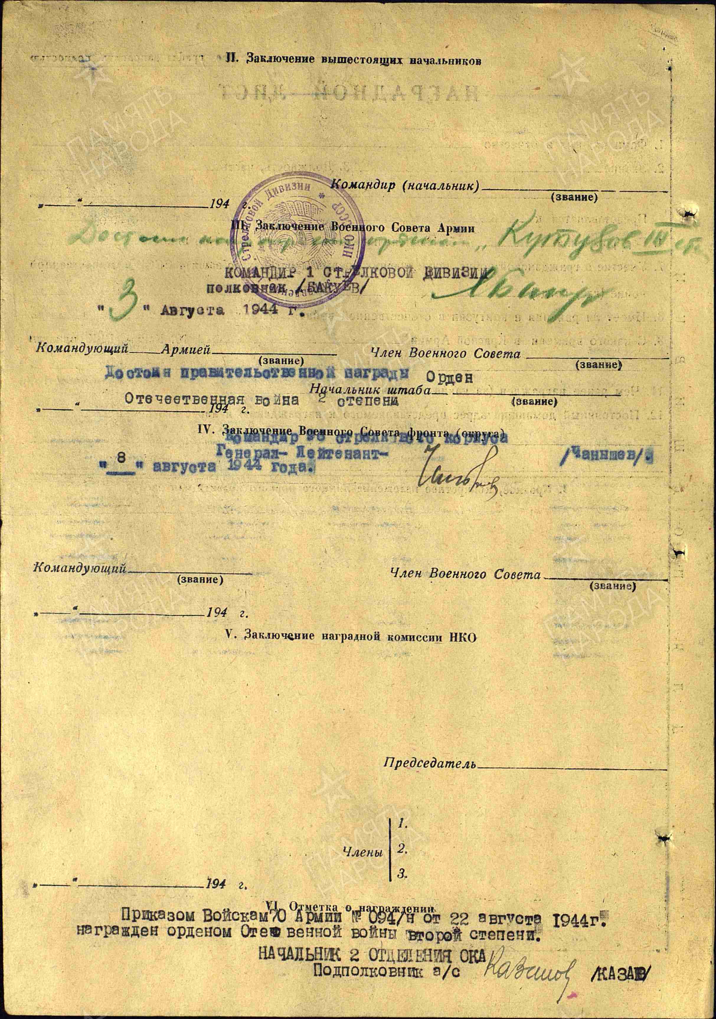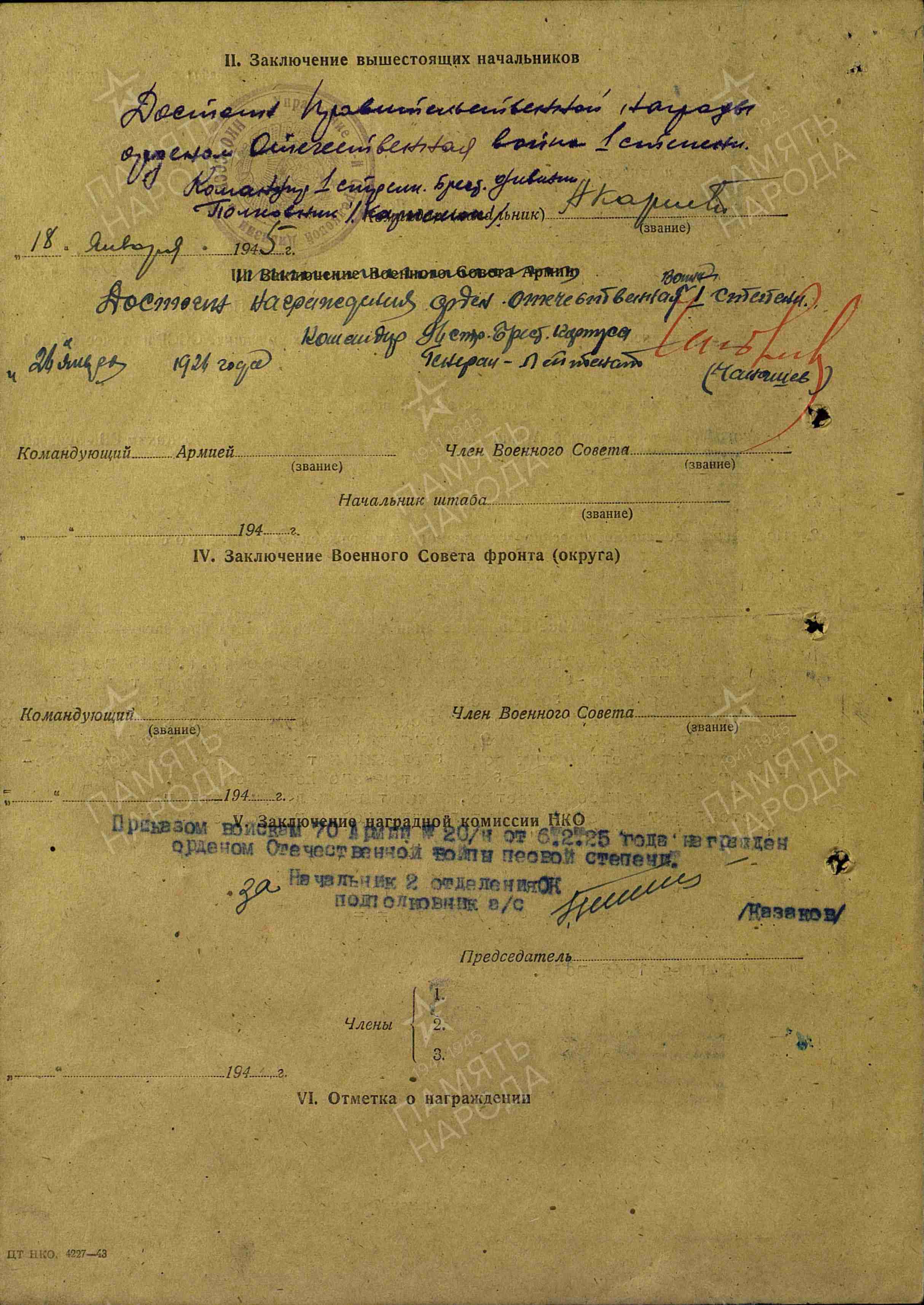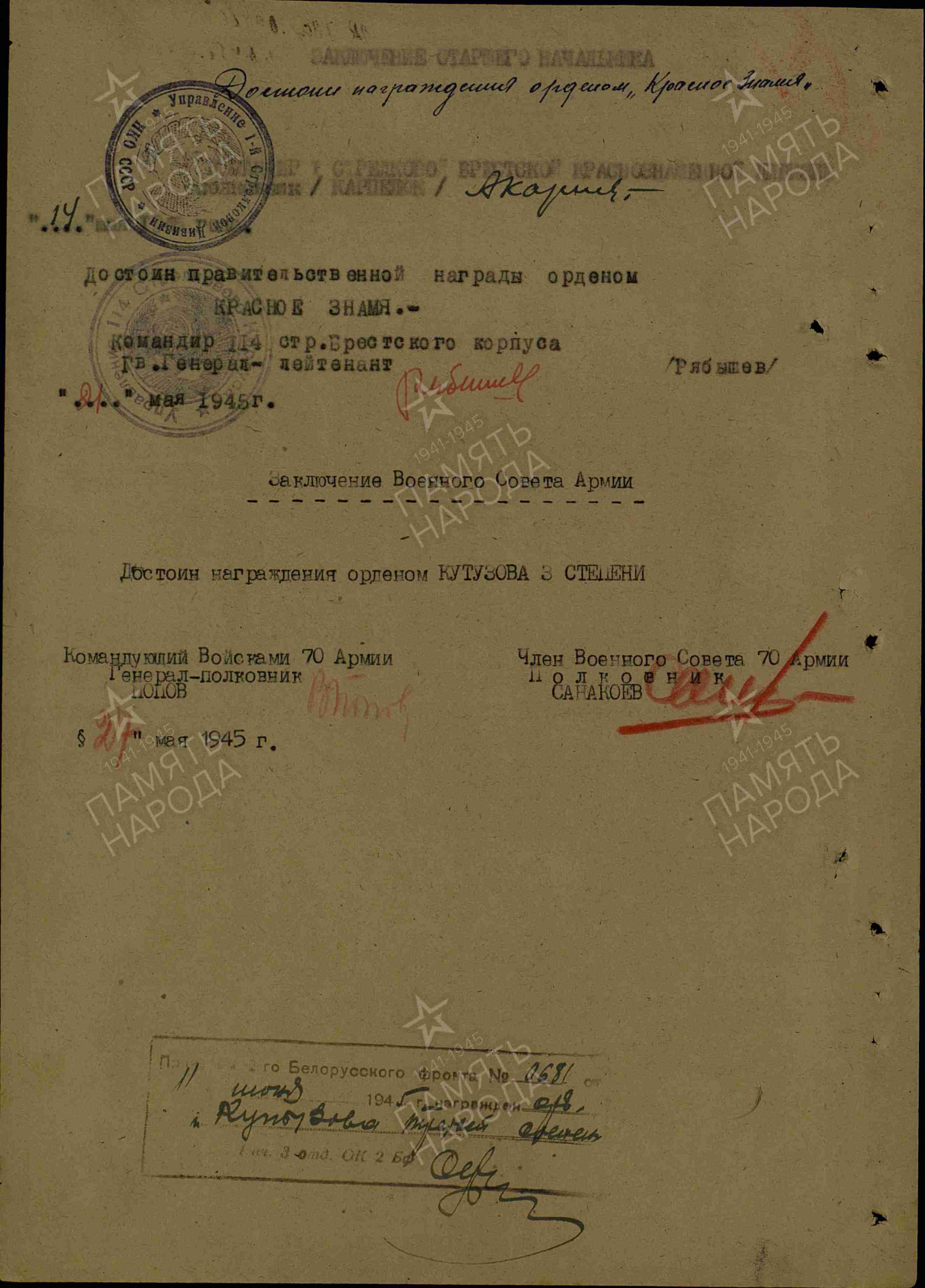 Начальник  штаба 412-го стрелкового ордена Кутузова полка 1-й стрелковой Брестской Краснознаменной дивизии.