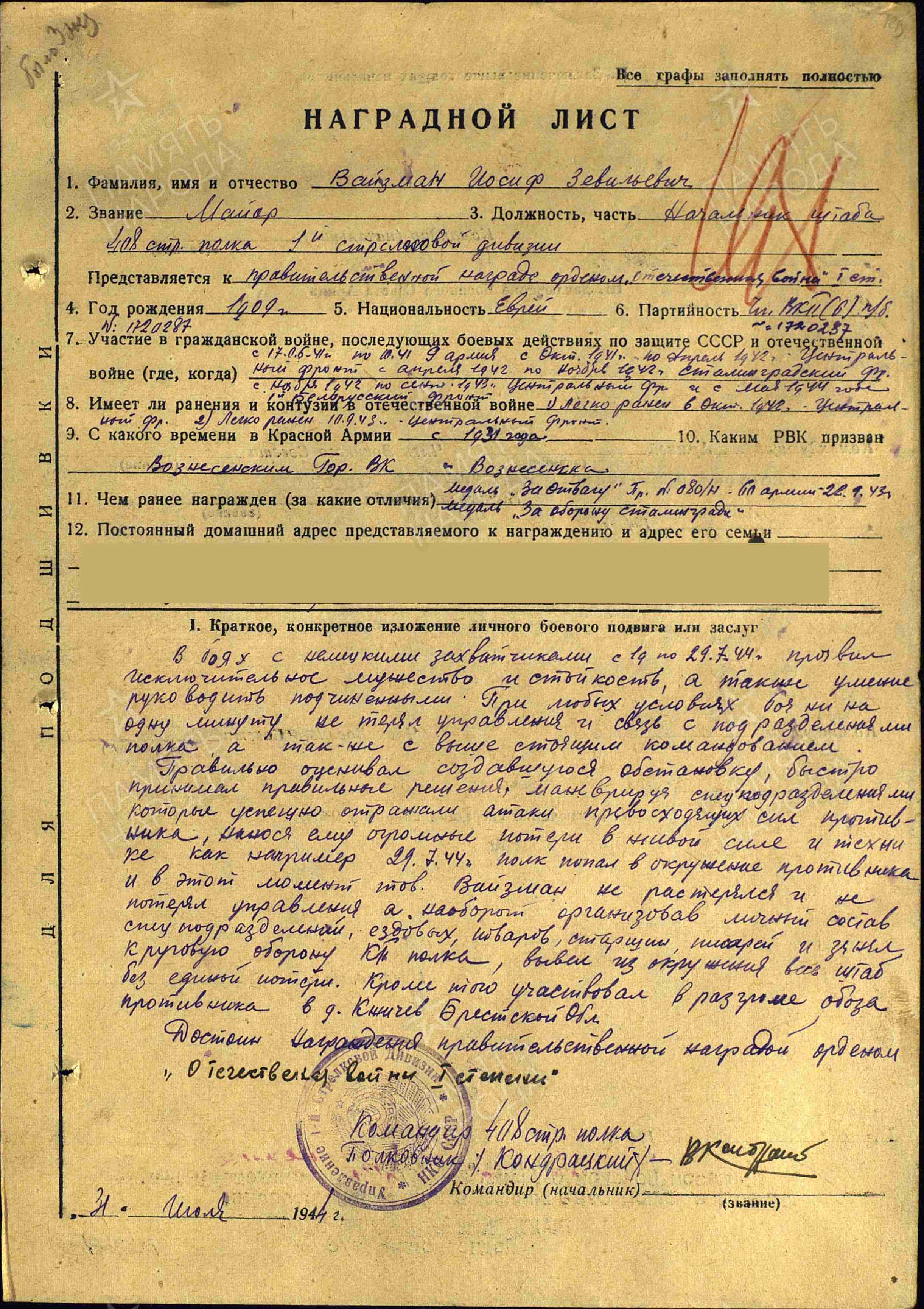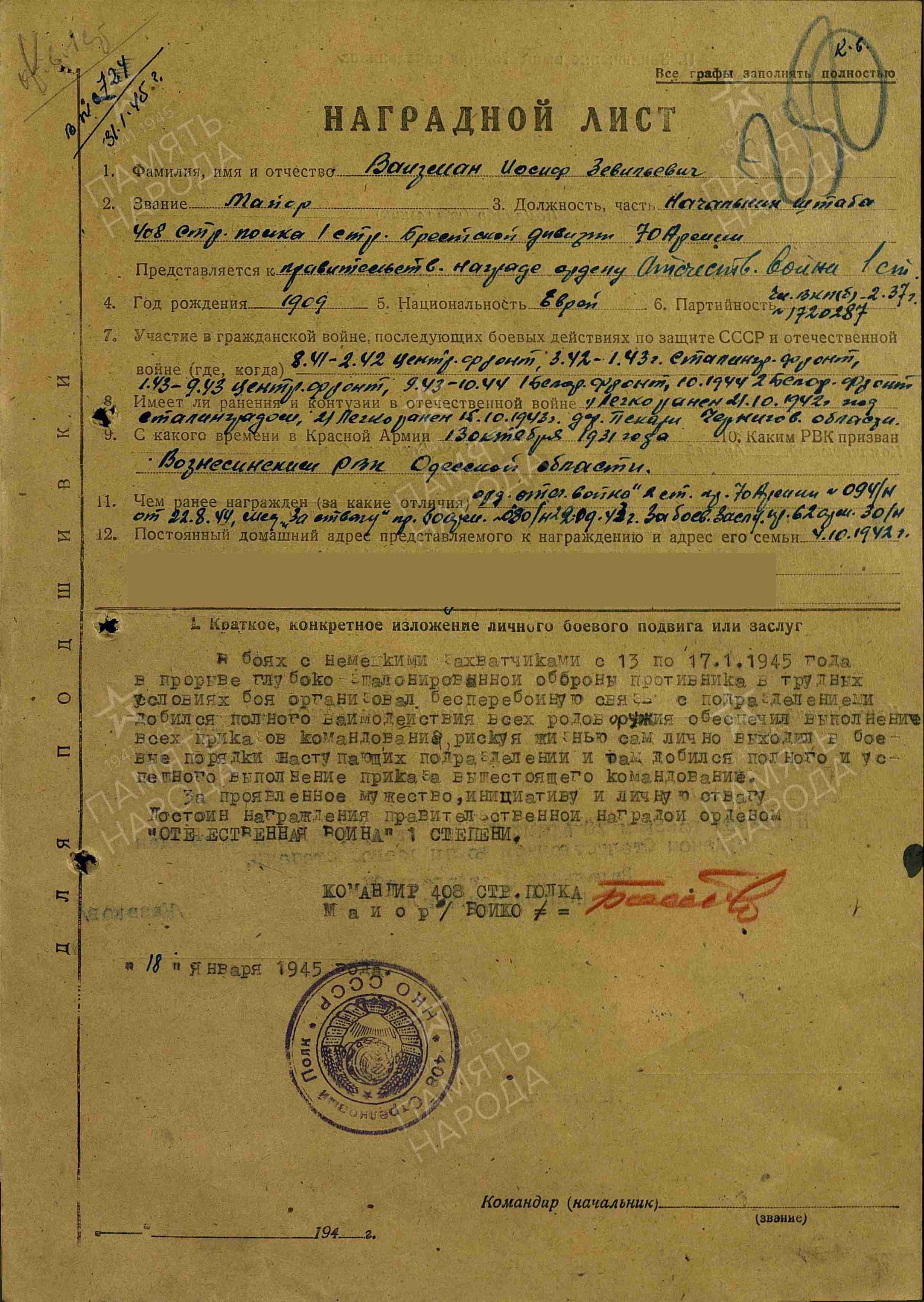 Иосиф Зевильевич Вайзман родился 16.02.1909 в г.Вознесенск Елисаветградского уезда Херсонской  губернии, РИ. Еврей.