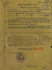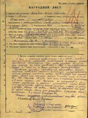 Ордена: "КУТУЗОВА" 3 СТЕПЕНИ, "ОТЕЧЕСТВЕННОЙ ВОЙНЫ" 1 и 2 СТЕПЕНЕЙ, "КРАСНОЙ ЗВЕЗДЫ".