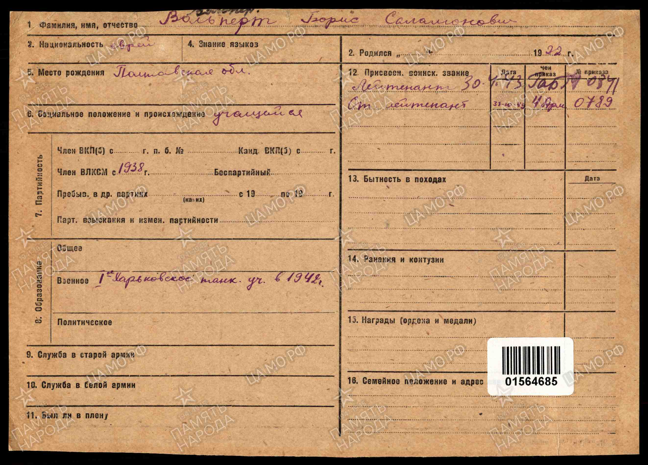 Старший лейтенант, __.__.1922 Украинская ССР, Харьковская обл., г. Харьков. Сводная картотека