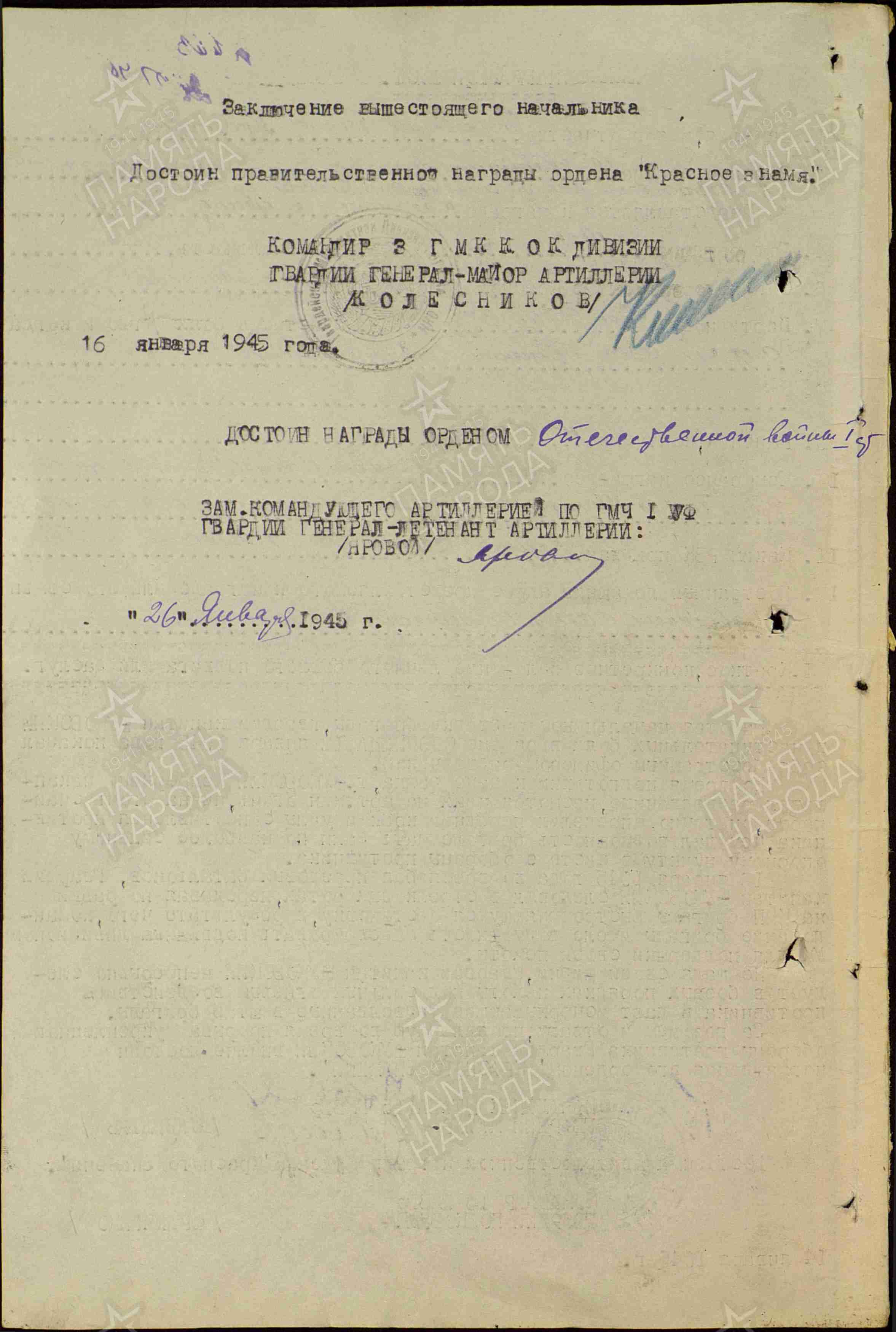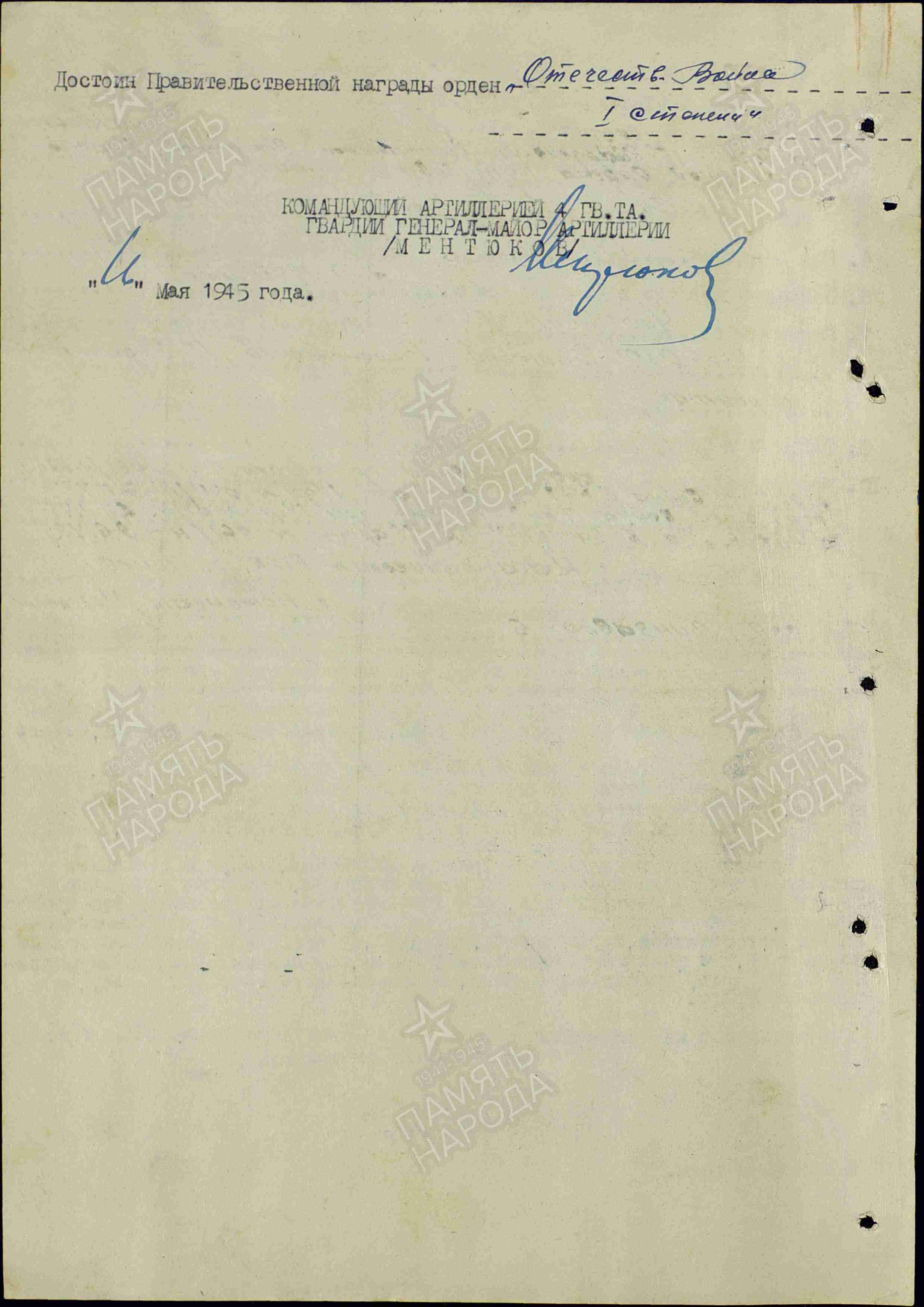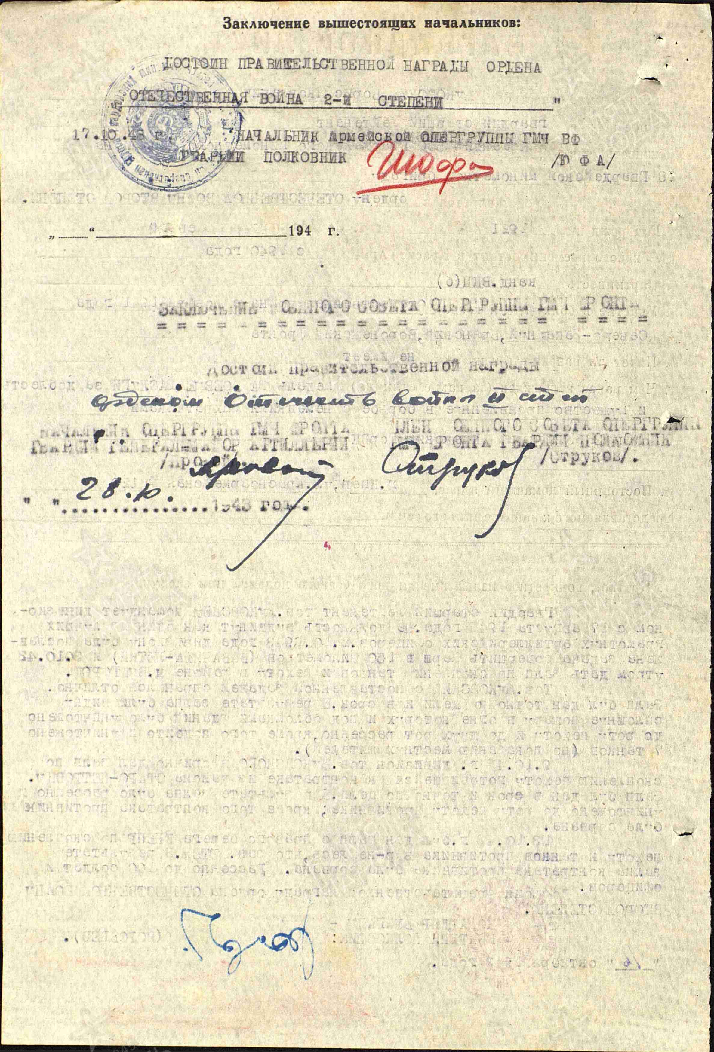 Посмертно представлен на присвоение звания Героя Советского Союза, но по данному наградному листу отмечен орденом Отечественной Войны 1-й степени.