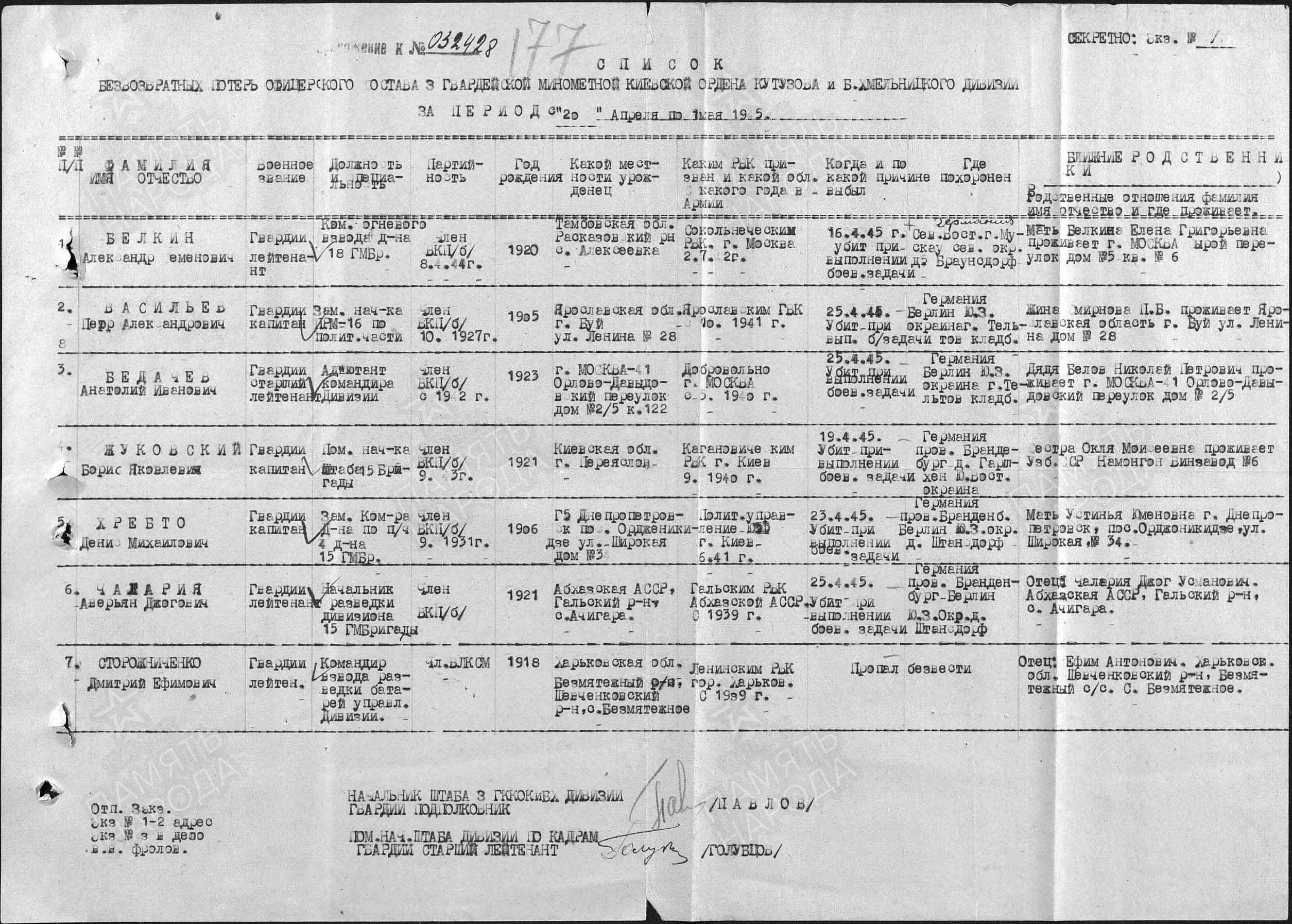 Убит  19.4.1945. Похоронен в районе н.п.Гаршхен, провинция Бранденбург, Германия.