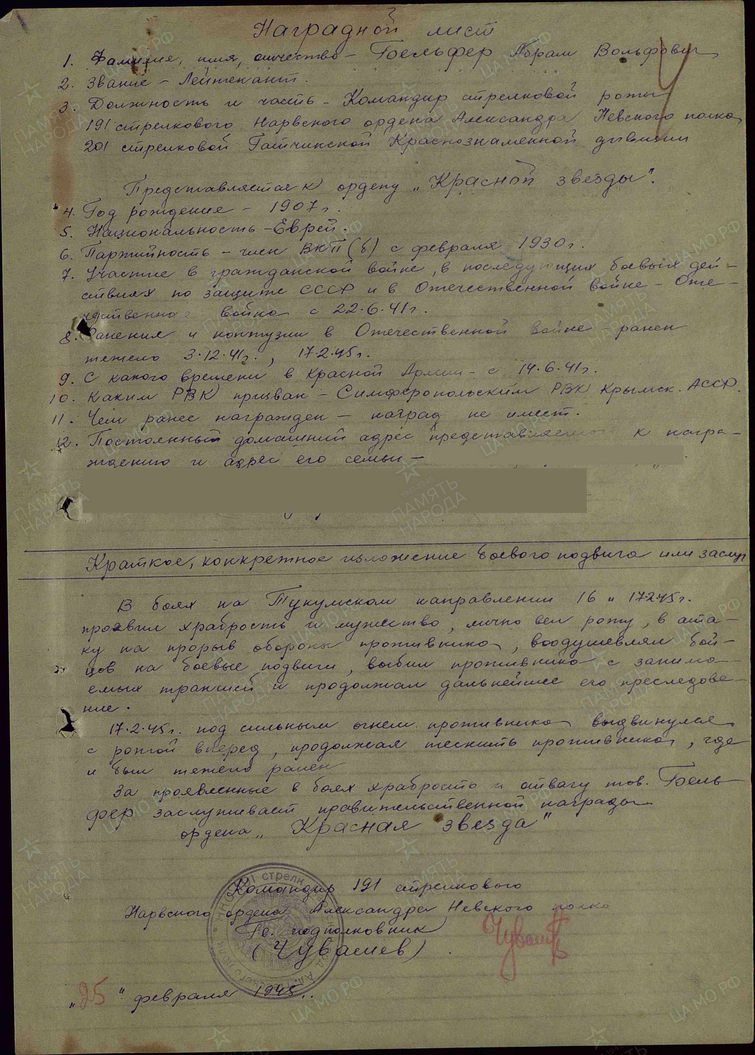 Лейтенант БЕЛЬФЕР АБРАМ ВОЛЬФОВИЧ, 1907 года рождения, место рождения - Украинская ССР, Винницкая облаксть, еврей. В РККА призван Симферопольским РВК, г. Симферополя, Крымской АССР, 14.06.1941 года. В Великой Отечественной войне (на Ленинградском, 3 Прибалтийском, Курляндской группе войск Ленинградского фронтов), в должности: Командир стрелковой роты 191 стрелкового Нарвского ордена Александра Невского полка, 201 стрелковой Гатчинской Краснознамённой дивизии, 100 стрелкового корпуса, 22 Армии, Курляндской группы войск, Ленинградского фронта. Ранения: 1. Тяжёлое (3.12.1941 г.); 2. Тяжёлое, с траматической ампутацией левого бедра (17.02.1945 г.). Боевые награды: 1. Орден "КРАСНАЯ ЗВЕЗДА"(Из НАГРАДНОГО ЛИСТА: "В боях, на ТУКУМСКОМ (прим. Латвия) направлении, 16 и 17.02.1945 года, проявил храбрость и мужество. Лично вел роту, в атаку, на прорыв обороны противника, воодушевлял бойцов, на боевые подвиги, выбил противника, из занимаемых траншей и продолжал дальнейшее, его преследование. 17.02.1945 года, под сильным огнём противника, выдвинулся, с ротой, вперёд, продолжая теснить противника, где и был тяжело ранен. За проявленные, в боях, храбрость и отвагу, товарищ БЕЛЬФЕР, заслуживает Правительственной награды ордена "КРАСНАЯ ЗВЕЗДА". Командир 191 стрелкового Нарвского ордена Александра Невского полка Гвардии подполковник ЧУВАШЕВ. 25 февраля 1945 года.";№ записи 29062591) с ЭЛЕКТРОННЫЙ БАНК ДОКУМЕНТОВ «ПОДВИГ НАРОДА В ВЕЛИКОЙ ОТЕЧЕСТВЕННОЙ ВОЙНЕ 1941-1945 ГГ.» http://podvignaroda.ru/?#tab=navHome Вернулся, с Великой Отечественной войны инвалидом. Прожил достойную жизнь людей его поколения. Вечная Слава и Память лейтенанту БЕЛЬФЕРУ АБРАМУ ВОЛЬФОВИЧУ, прошедшему всю Великую Отечественную войну, в смертельной должности - командира стрелковой роты!