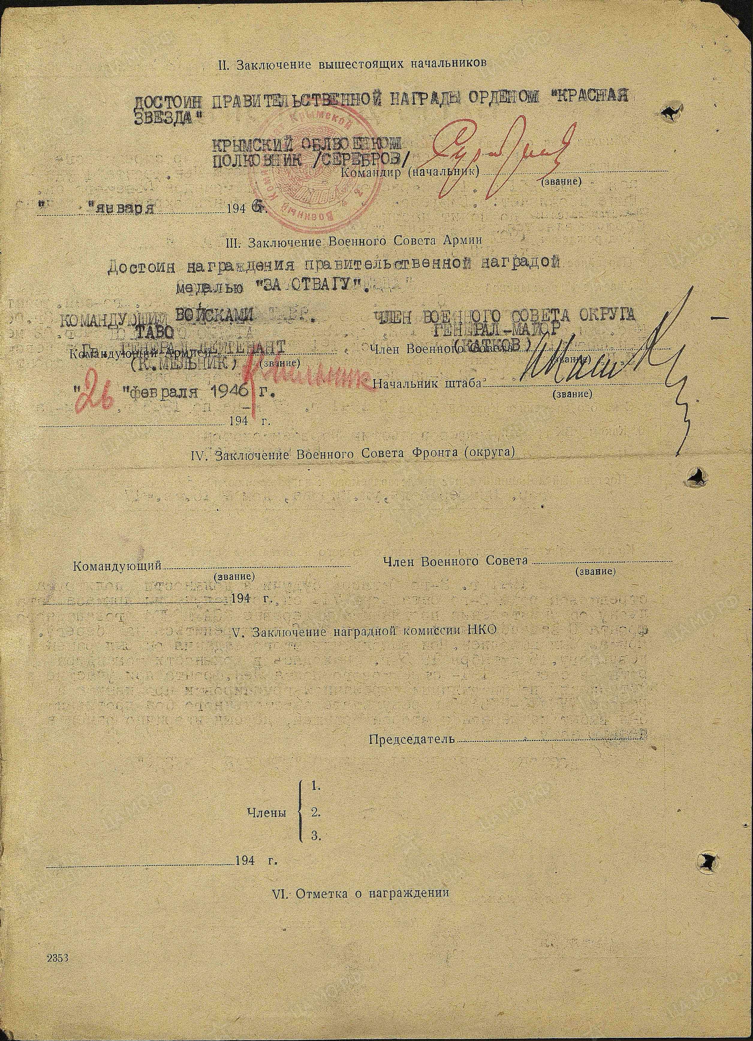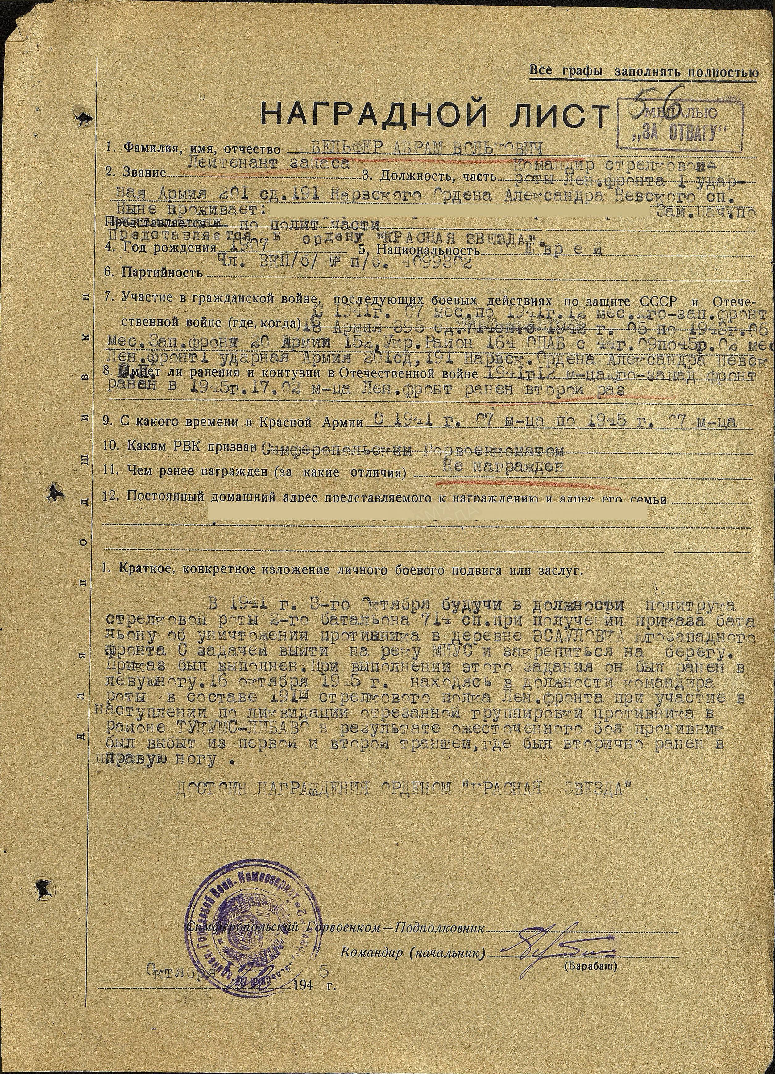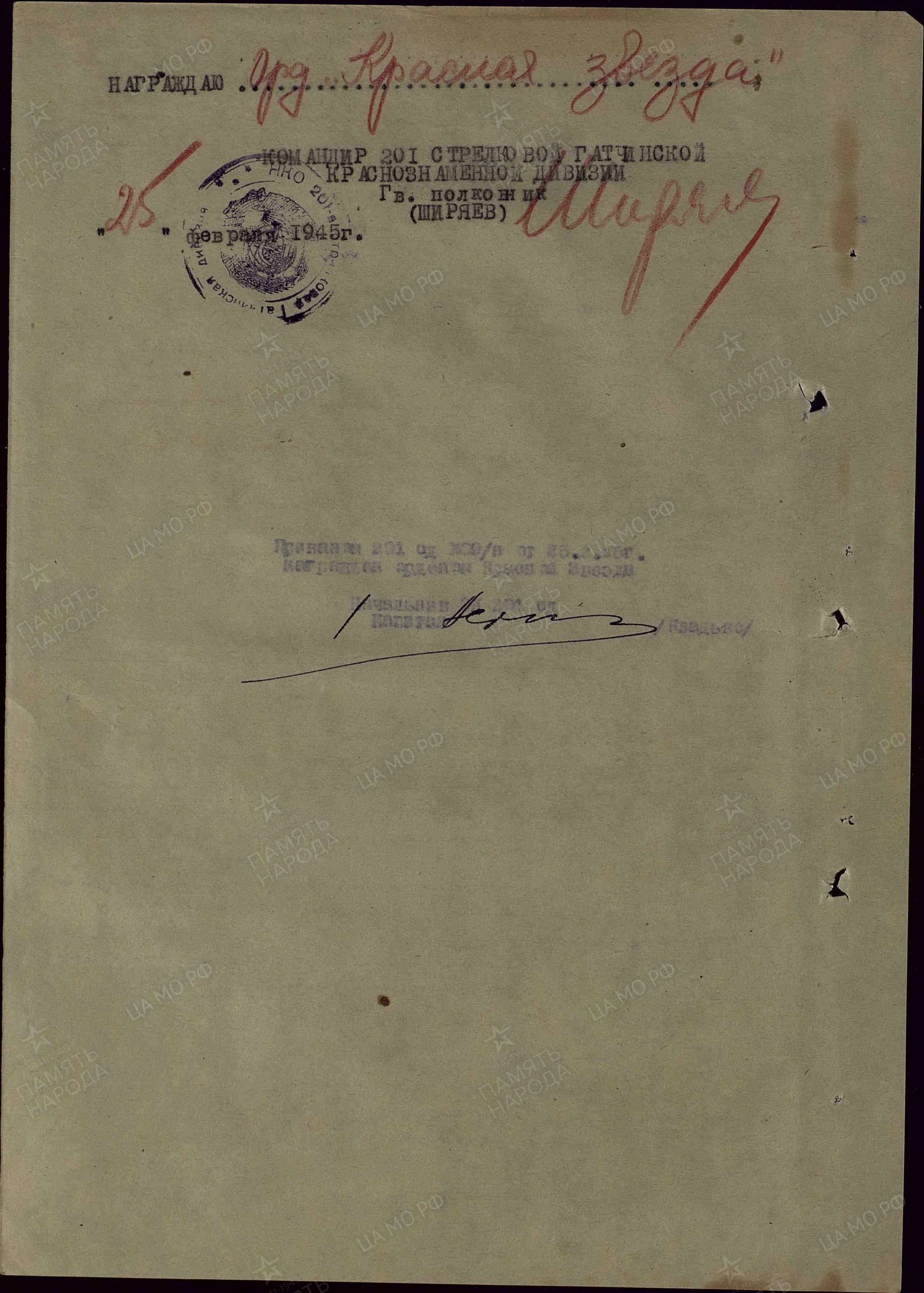 1 Наградной лист на орден "КРАСНАЯ ЗВЕЗДА" ( с ЭЛЕКТРОННЫЙ БАНК ДОКУМЕНТОВ «ПОДВИГ НАРОДА В ВЕЛИКОЙ ОТЕЧЕСТВЕННОЙ ВОЙНЕ 1941-1945 ГГ.» http://podvignaroda.ru/?#tab=navHome );