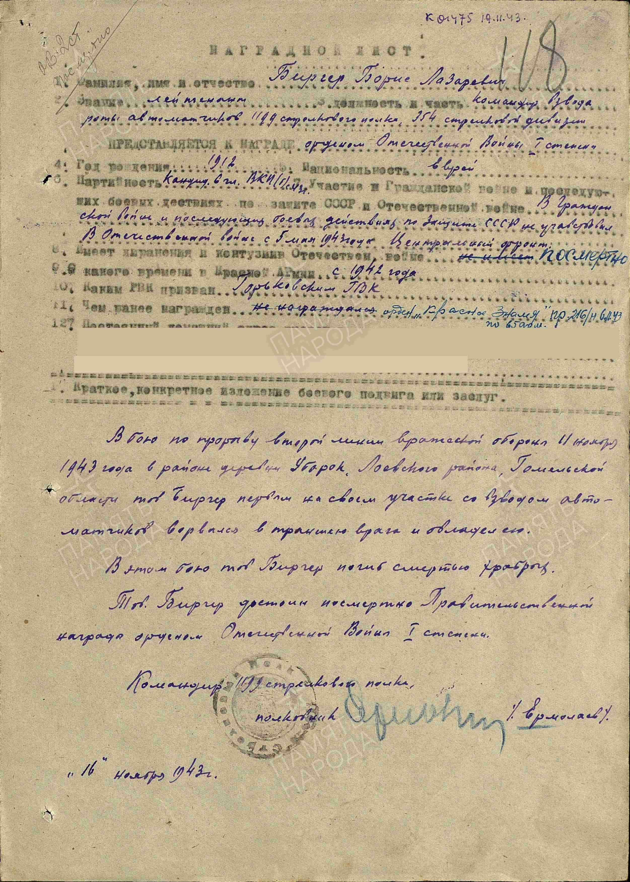 Борис Лазаревич Биргер родился в 1912 году в г.Малин, Киевская губерния, РИ. Еврей.