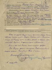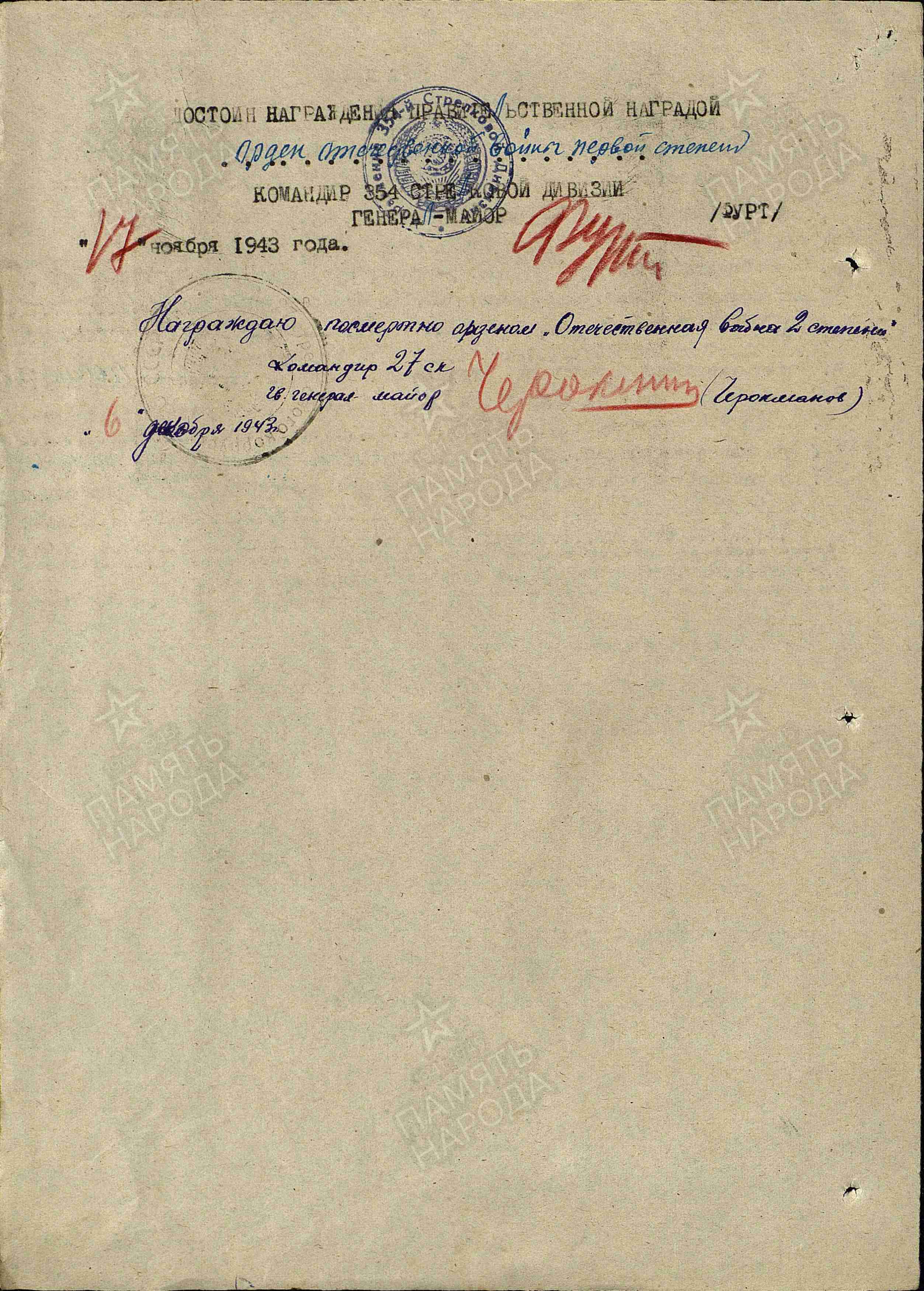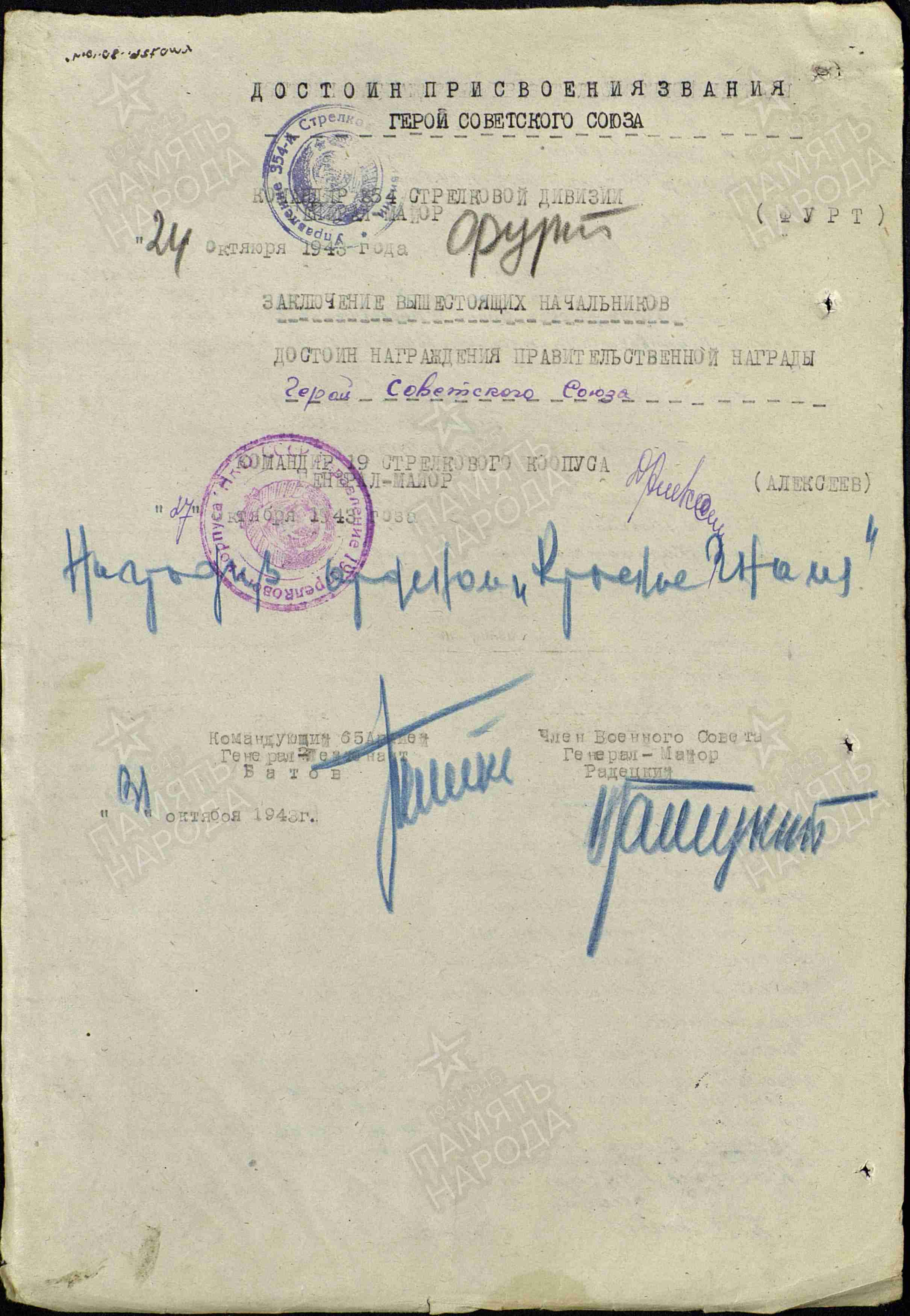 Представлен к званию Героя Советского Союза 23.10.1943 за героизм проявленный при форсировании Днепра и в  боях на днепровском плацдарме.